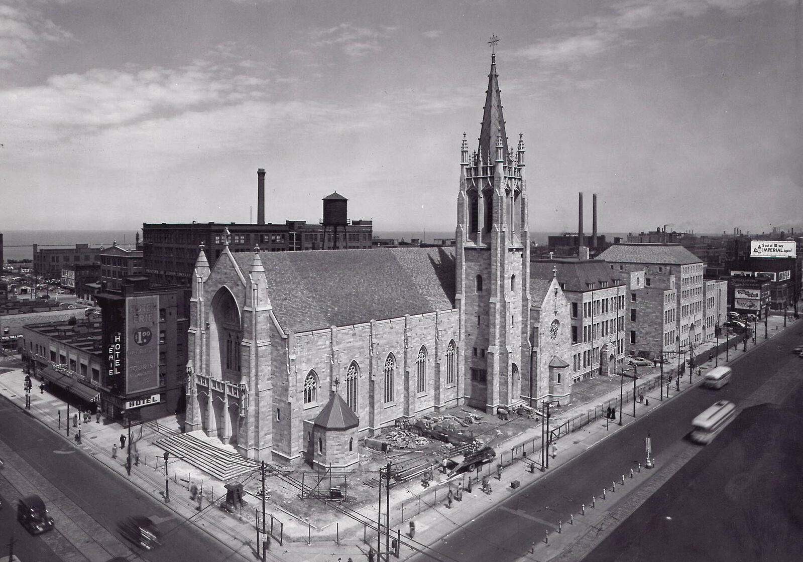 On November 19, 1848, the first priests to serve and support the diocese were ordained. The Cathedral of St. John the Evangelist was constructed from 1848 until 1852 at the corner of Superior Avenue and Erie Street (now East 9th Street). It was dedicated on November 7, 1852. The territory of the diocese would alter with the creation of the Diocese of Toledo (1910) and then again with the creation of the Diocese of Youngstown (1943). Currently the Diocese of Cleveland encompasses 8 counties of northeast Ohio (Ashland, Cuyahoga, Geauga, Lorain, Lake, Medina, Summit and Wayne).