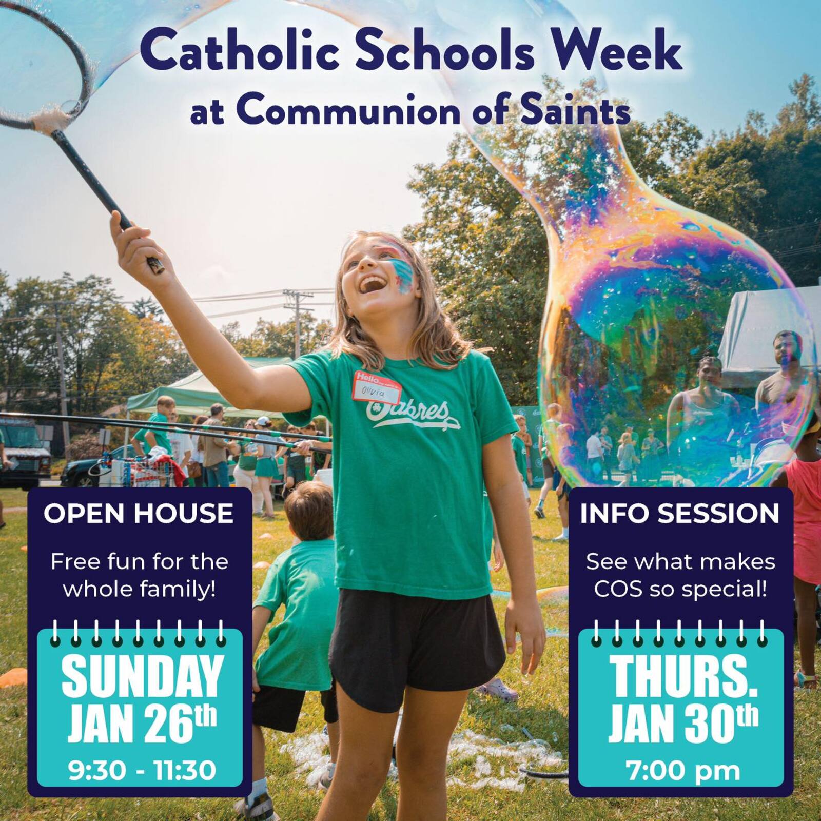 Join us for the annual Catholic Schools Week Open House sponsored by Communion of Saints School! We kick off the morning with a student-led Mass at 8:30am followed by a school Open House from 9:30-11:30am. Open House includes a "Bubblemania" assembly with the Great Lakes Science Center, reveal of the 4th annual "The Shirt" designed by CLE Clothing Company, Scholastic Book Fair, caricature artist, scavenger hunt, and coffee and donuts!