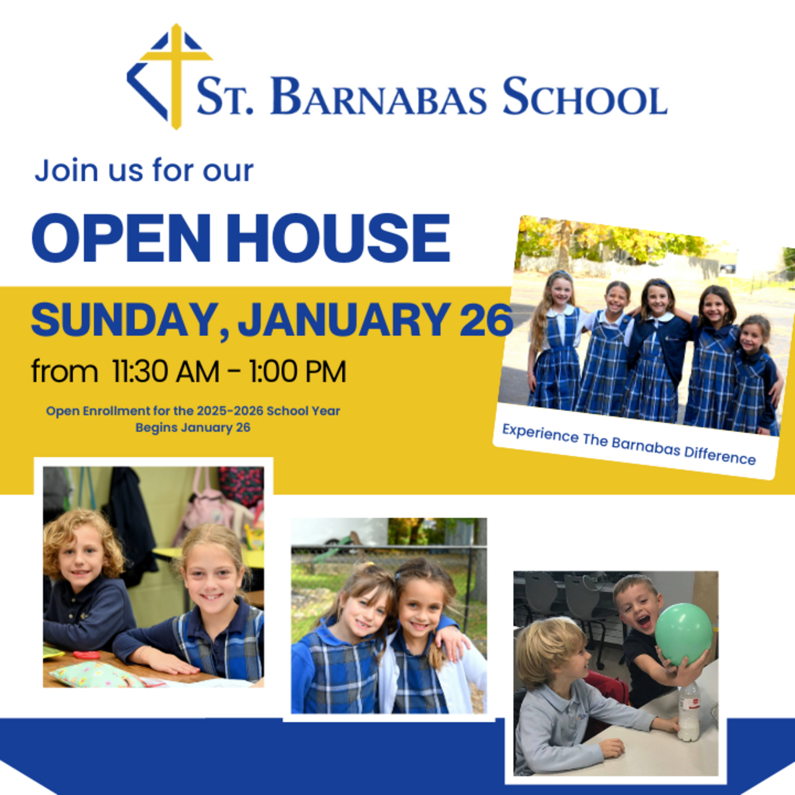 St. Barnabas Open House for the 2025-2026 school year will be on Sunday, January 26, 2025. We invite you to come see our classrooms, meet our teachers, take a tour, and learn about enrolling at St. Barnabas School. Enrollment for the 2025-2026 begins January 26, 2025. Click here to RSVP: https://form.jotform.com/243546126894162