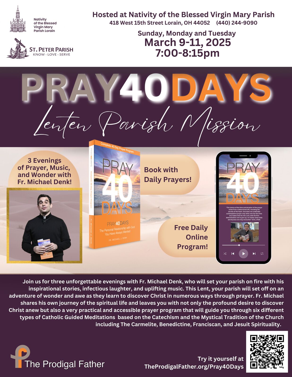 Father Michael Denk will lead three unforgettable evenings of inspirational stories, infectious laughter, and uplifting music. We will meet from 7:00 p.m. to 8:15 p.m. for three evenings in a row - Sunday, March 9; Monday, March 10; Tuesday, March 11. No registration is required, but attendees are encouraged to sign up for TheProdigalFather.org/Pray40Days.