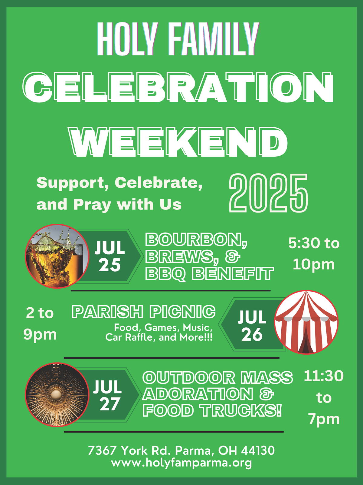 Support Celebrate and Pray with Us Holy Family Parma CELEBRATION WEEKEND July 25 thru 27 July 25 Bourbon, Brews, & BBQ benefit 5:30 - 10:00pm (ticketed event) go to www.holyfamparma.org July 26 Parish Picnic 2:00 - 9:00pm July 27 Outdoor Mass and Adoration 11:30am Food trucks to follow adoration PLUS - win a chance for a Car lease 2025 Nissan Kicks