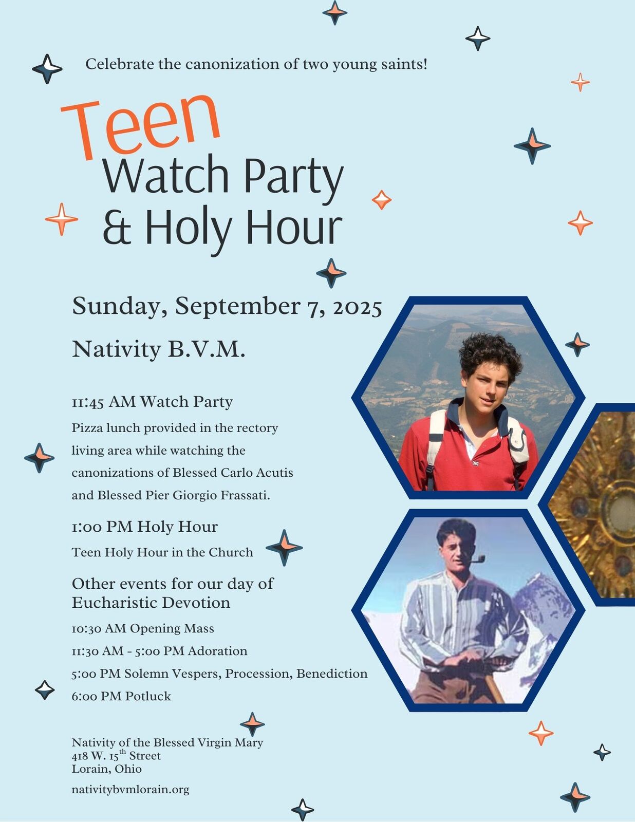 Teen Watch Party with pizza lunch for the canonization of Carlo Acutis and Pier Giorgio Frassati followed by a Teen Holy Hour from 1:00 to 2:00. Free and open to all teens grades 7 through 12.