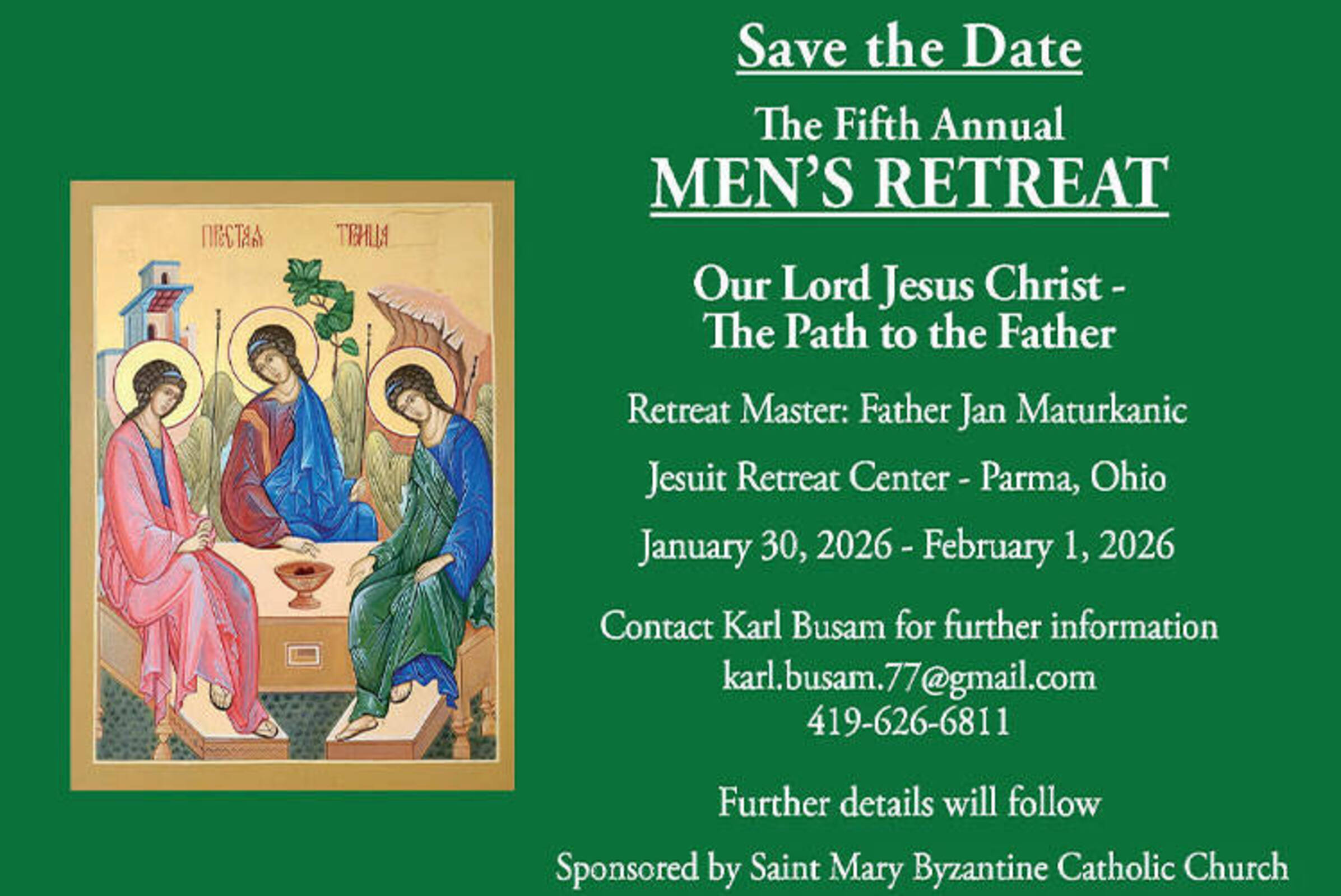The theme for the 5th Annual Men's Retreat of the Byzantine Catholic Eparchy of Parma is "Our Lord Jesus Christ, The Path to the Father". Retreat Master is Fr. Jan MaturKanic. Sponsored by St. Mary Byzantine Catholic Church in Marblehead, Ohio.
