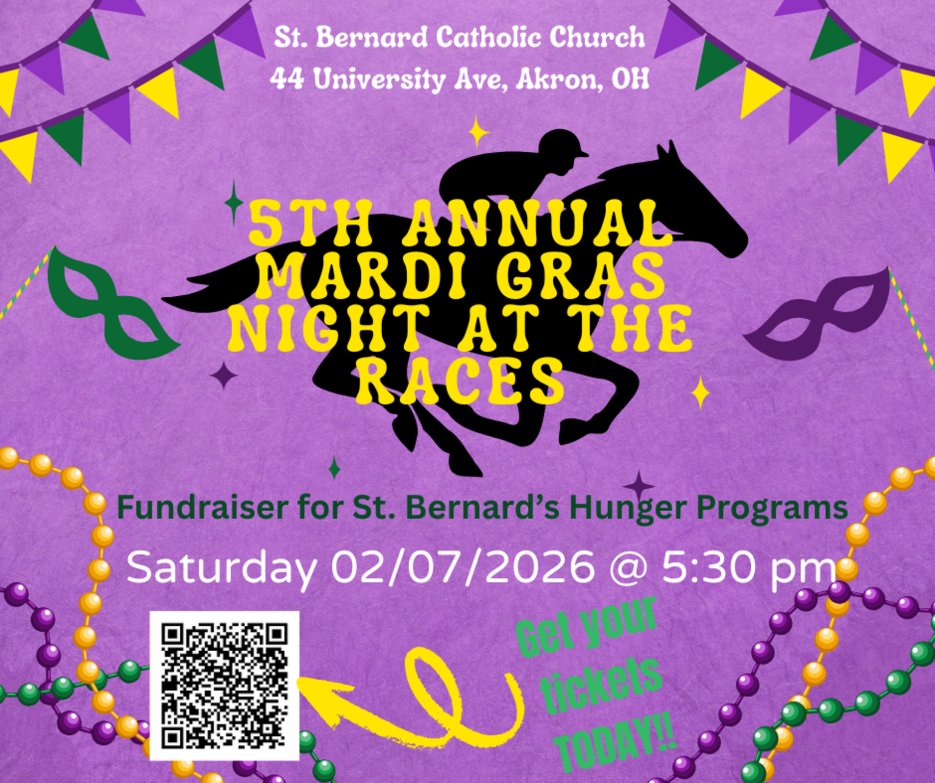 The annual Night at the Races Mardi Gras celebration proceeds go toward providing funds for three very important programs at St. Bernard’s parish: Hot Meals, Morning Sandwiches and the Weekly Family Food Pantry. These programs are crucial to the well-being of so many of our neighbors who turn to us for relief from hunger. In 2025, our hunger ministries provided more than 50,000 meals to individuals and families in our community facing food insecurity. That is a lot of meals, so we need your help and support! Night at the Races is an evening filled with good food, delicious desserts, drinks, basket raffles, cash prizes and horse racing, and most importantly it is a chance to enjoy fellowship. Tickets are $75 each and include a beverage ticket for the bar and dinner. Financial sponsorships are also available ranging from $40 to $2000. Please help us help those suffering from food insecurity in Summit County. God Bless!