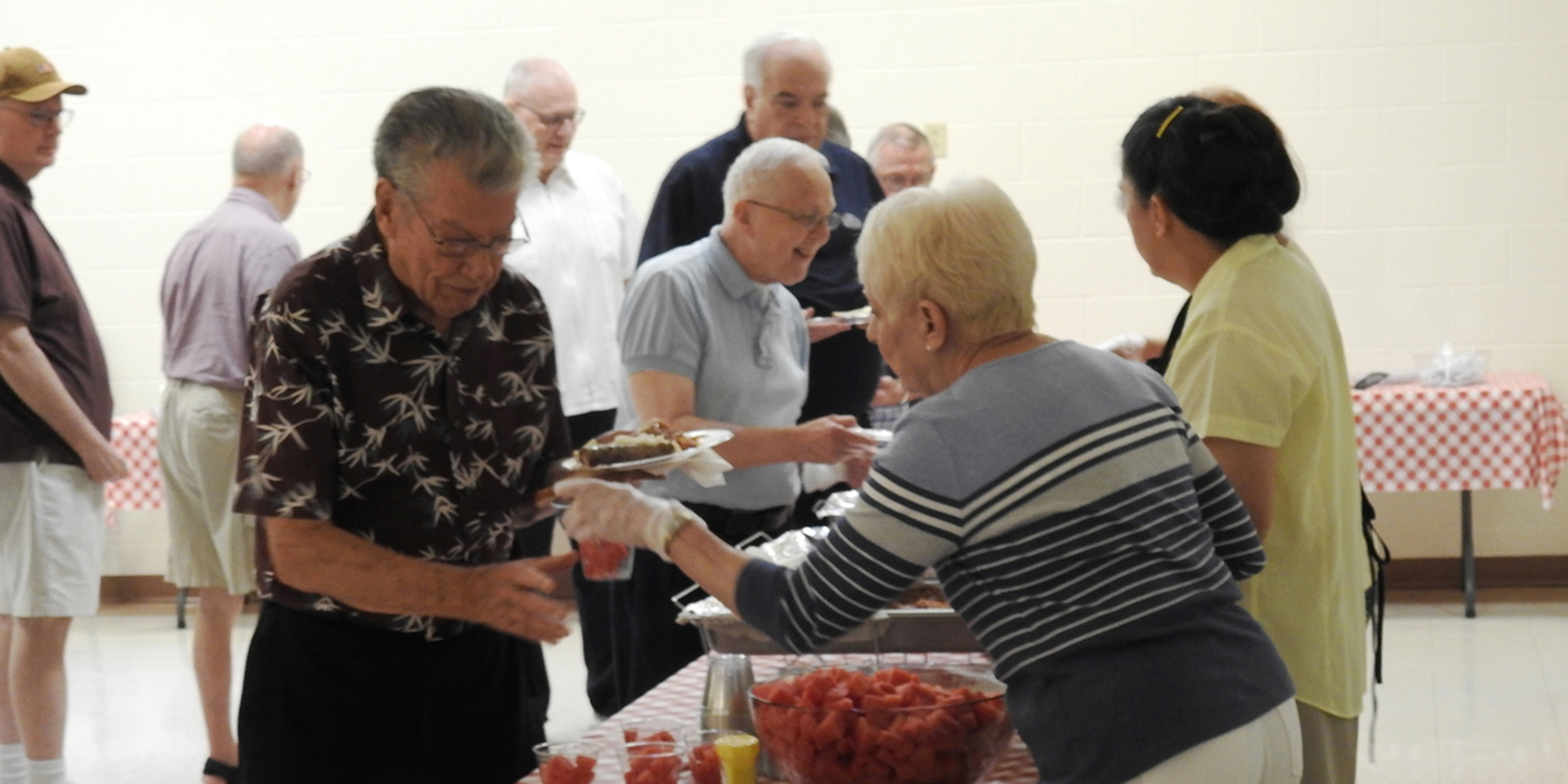 Then it was up to the buffet line to enjoy a home-cooked ethnic feast of potato and cheese pierogi with onions and sour cream, sausage and sauerkraut, stuffed cabbage, bread and butter and watermelon cubes prepared and served by a group of women from St. Adalbert.
