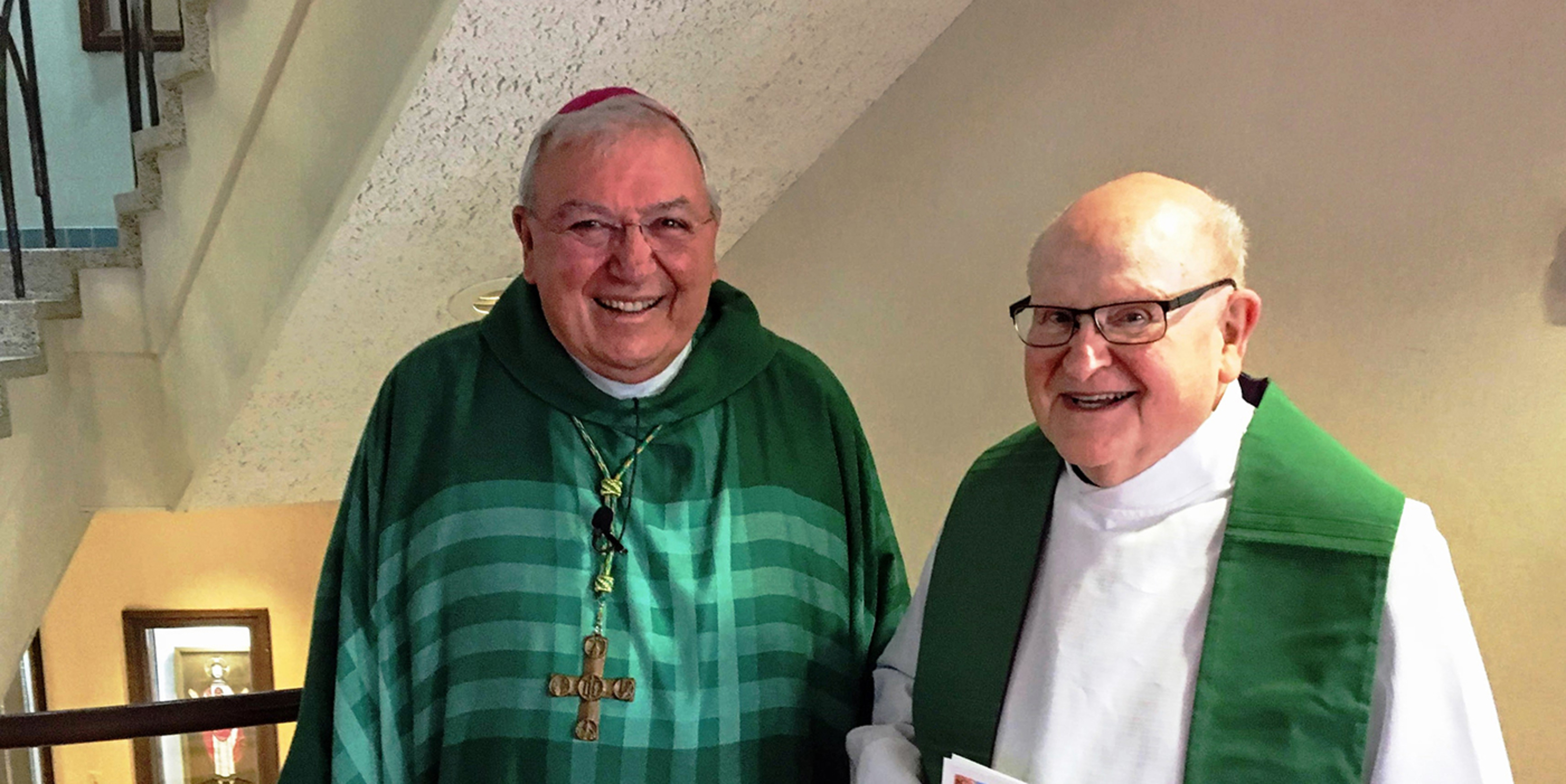 Bishop Roger Gries joined more than 100 people at Light of Hearts Villa in Bedford to celebrate the senior living facility’s 30th anniversary with a Mass and brunch on Sept. 1. Father Thomas O’Donnell, a resident of the facility, concelebrated Mass.
