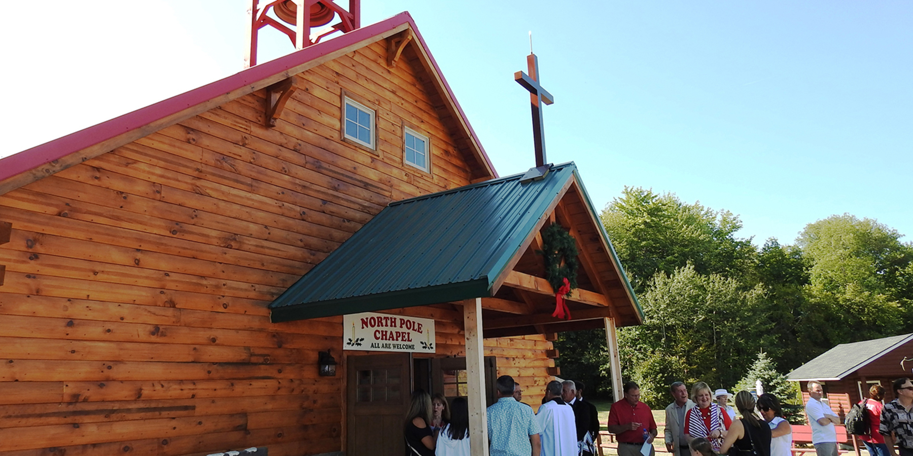 The rustic-looking wooden chapel resembles a cabin. Its price tag was about $350,000, but Santa Claus (Bill Dieterle) said it was finished for $250,000, thanks “to a lot of love and donated labor.”
