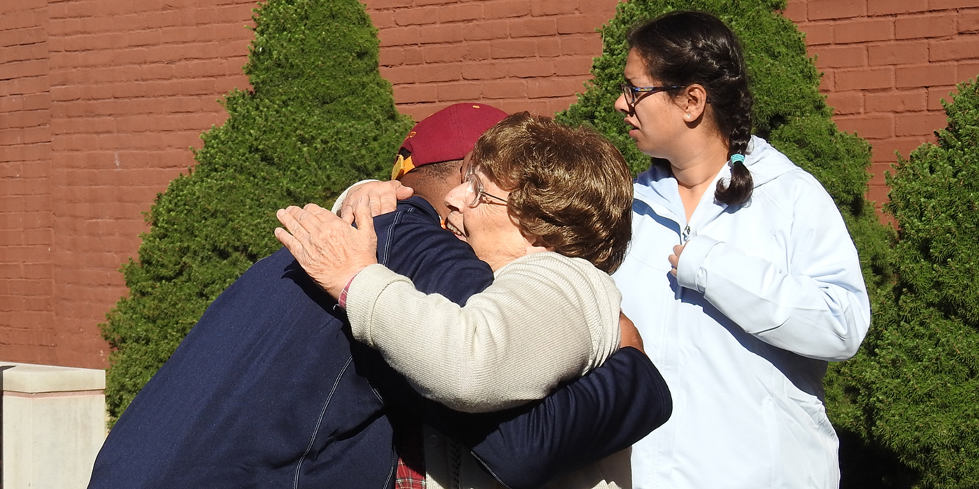 The group moved outdoors at 10:45 a.m. to line up under bright blue, sunny skies and volunteers handed out purple and white balloons. Walkers included some participants in the Disabilities Services and Ministries programs, their families and friends and other supporters of the ministry. They lined up behind a large, orange Walk of Hope Banner carried by volunteers. After carefully crossing West 14th, the group began its circuit around the park.