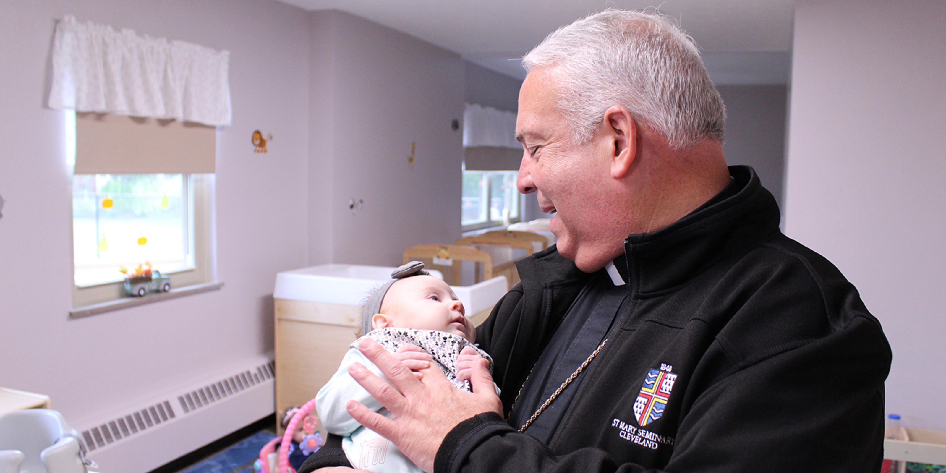 On Oct. 7, Bishop Nelson Perez toured this section of SS. Robert & William when he visited the school for the first time. The students were anxious to show off their new classrooms, books and snack area and even performed their song from the ribbon-cutting for him. In the area for Baby Angels, for those 6 weeks through 18 months, a baby named Kennedy was captivated by the bishop. She smiled and cooed as he held her for a blessing.