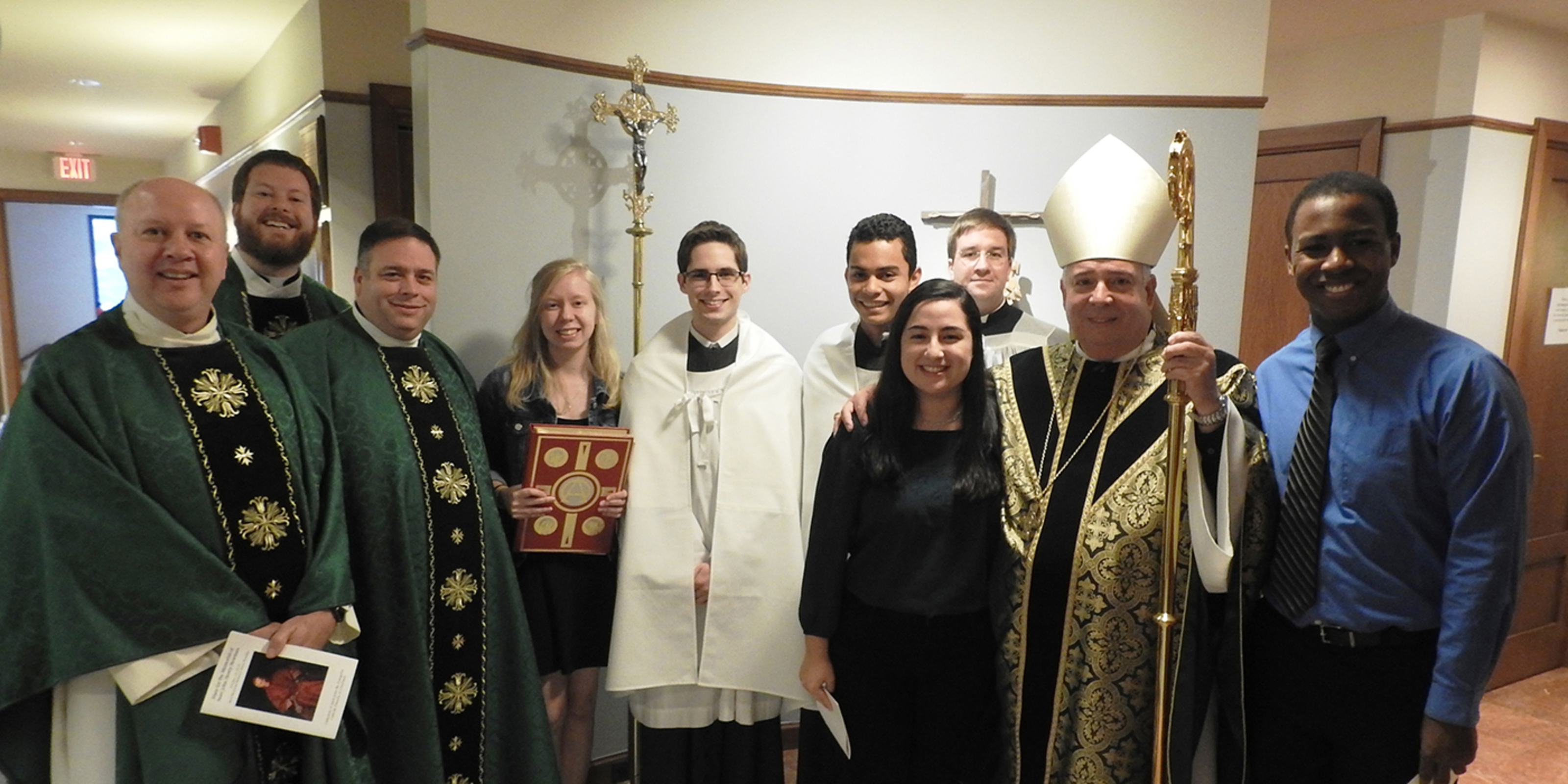 The students, who are involved in Newman Campus Ministry at their respective schools, joined campus ministers and others for the 5:30 p.m. liturgy at the Cathedral of St. John the Evangelist to celebrate the canonization of a new saint: Cardinal John Henry Newman, after whom the campus ministry program is named. Bishop Nelson Perez presided at the Mass, with Father Vince Hawk, pastor of St. Peter Parish in Loudonville, director of Newman Campus Ministry in the Catholic Diocese of Cleveland and chaplain for Ashland’s Newman Campus Ministry; Father Dan Schlegel, diocesan vicar for clergy and religious; and Father Rich Samide, parochial vicar at St. Mary of the Immaculate Conception Parish in Wooster, as concelebrants.