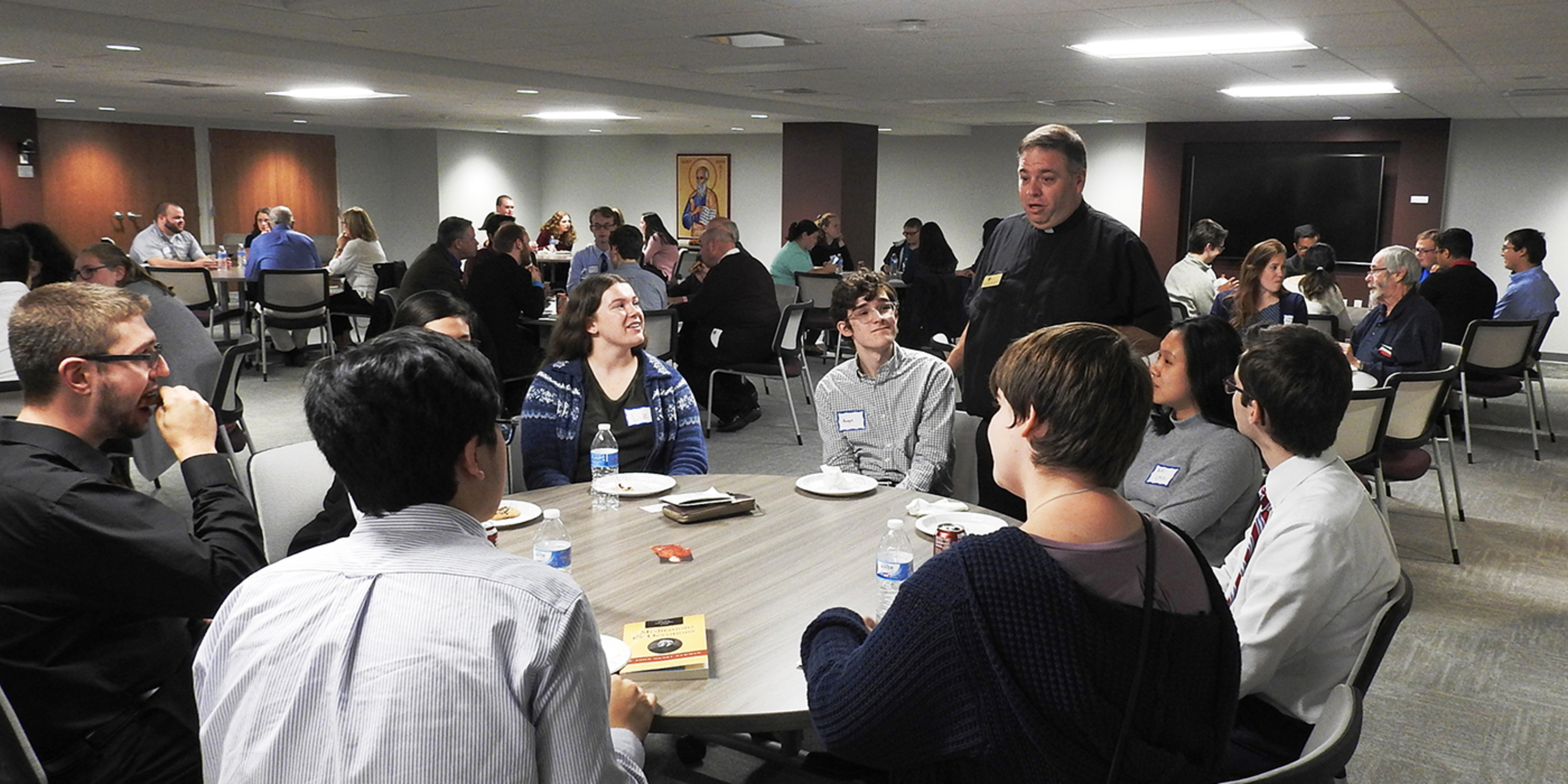 A pizza social in the diocesan conference room followed Mass, offering an opportunity for students from the various campuses to share ideas and conversation.