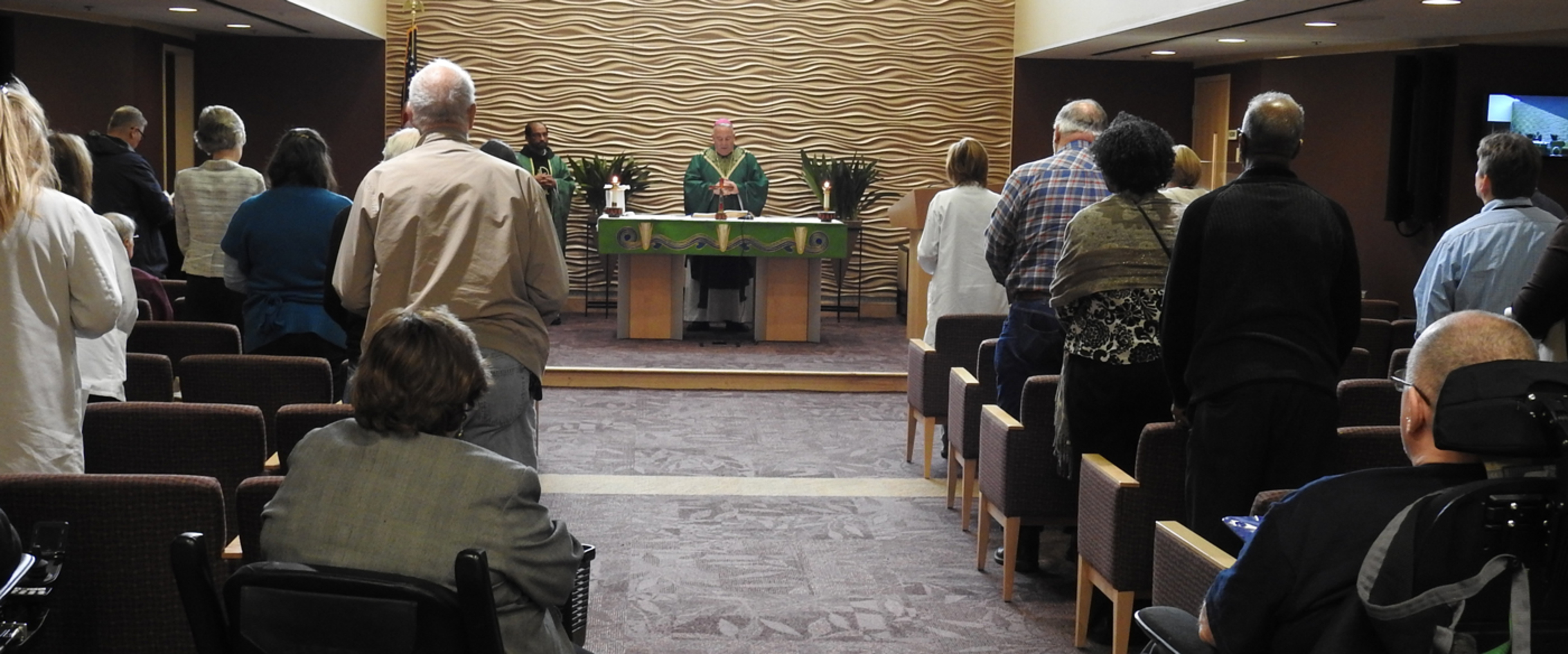 About three dozen people moved into the all-faith chapel for Mass at 11 a.m. The liturgy is celebrated at 9 a.m. on Sundays and 11 a.m. Monday through Friday in the chapel.