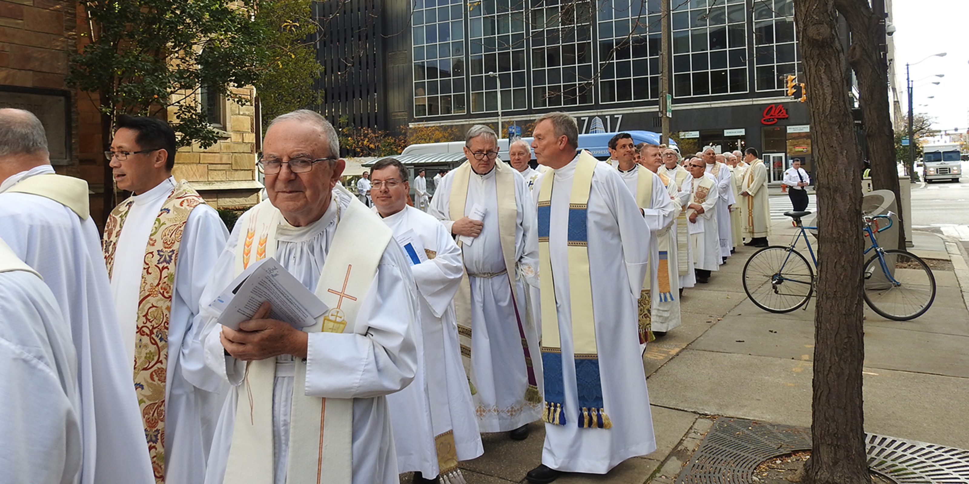 Those arriving at the cathedral for the Mass saw a Cleveland fire truck with its ladder extended across East Ninth Street in front of the cathedral as a tribute to Bishop Lennon. A large American flag hung from the ladder. The late bishop’s father was deputy fire chief in his hometown of Arlington, Massachusetts and Bishop Lennon served as a fire department chaplain, a ministry he cherished.