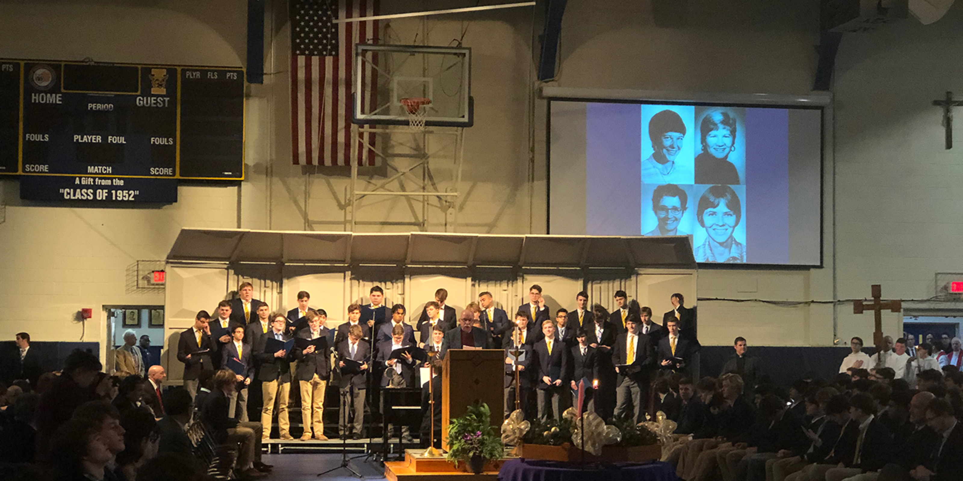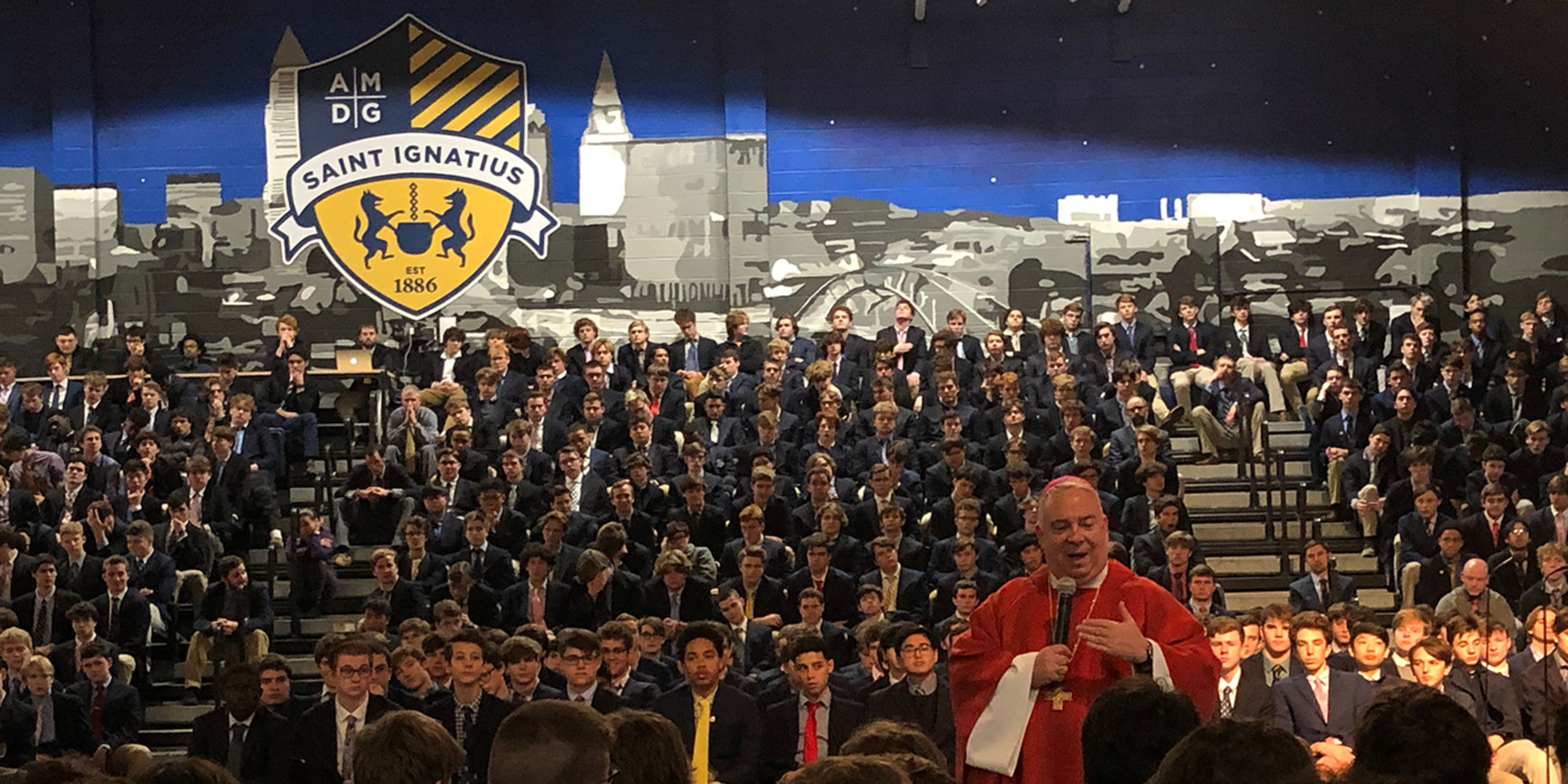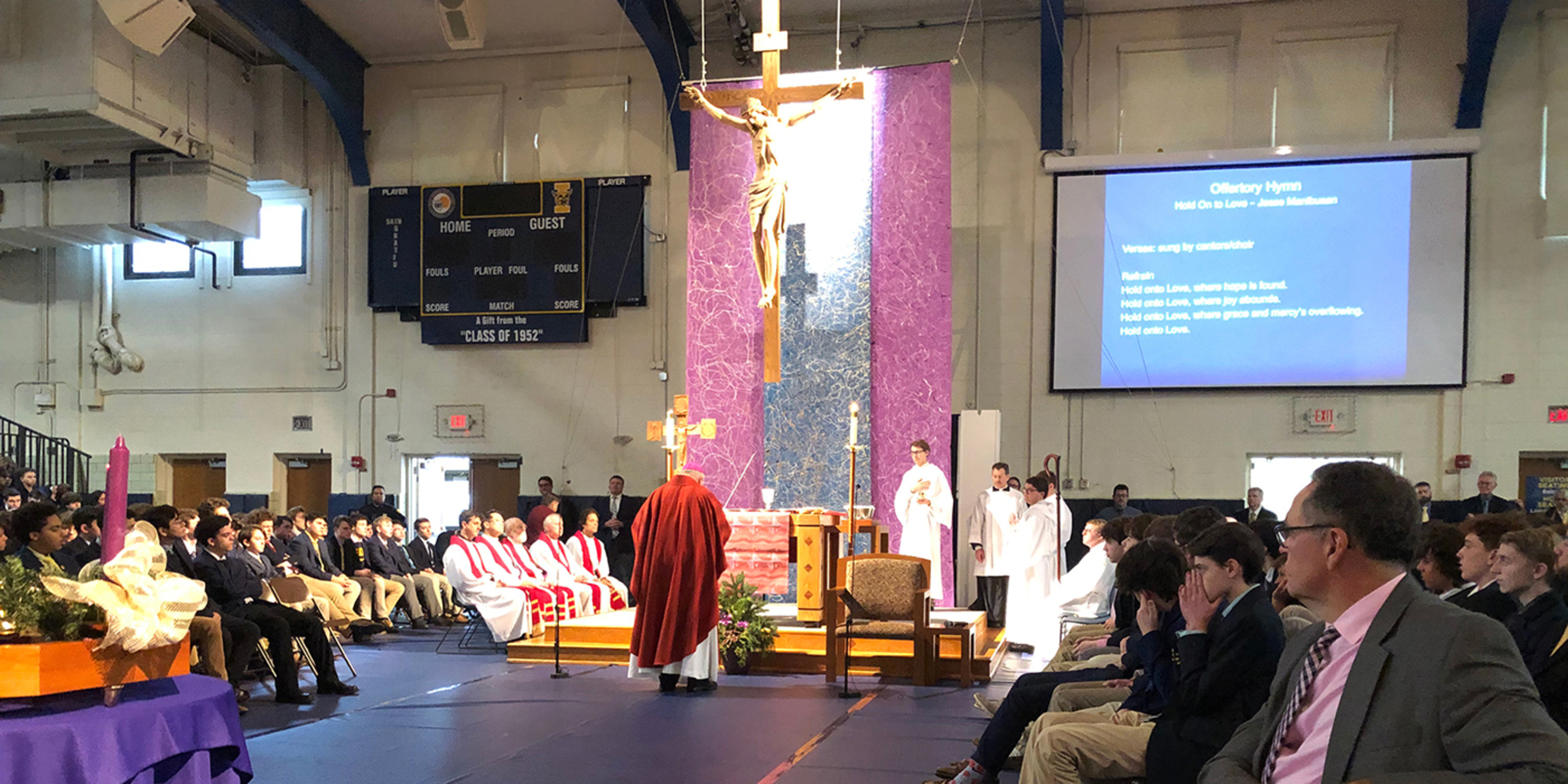 During the Communion reflection, a slideshow was played showing the various works of mercy performed during the year by St. Ignatius students. The works include feeding the homeless, serving as pall bearers for those who have none, neighborhood cleanup, mentoring younger students and more.