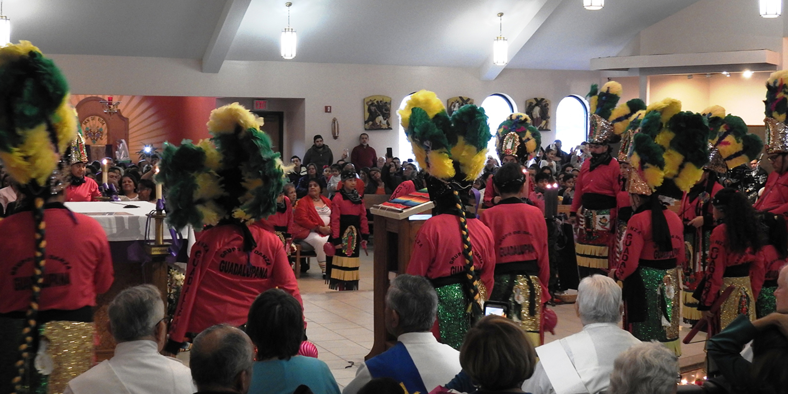 Grupo de Danza Guadalupe of Norwalk performed in Aztec-type dress with large feathered headdresses and beaded costumes. The troupe danced into the church after the opening procession and performed a sacred dance before Mass began.