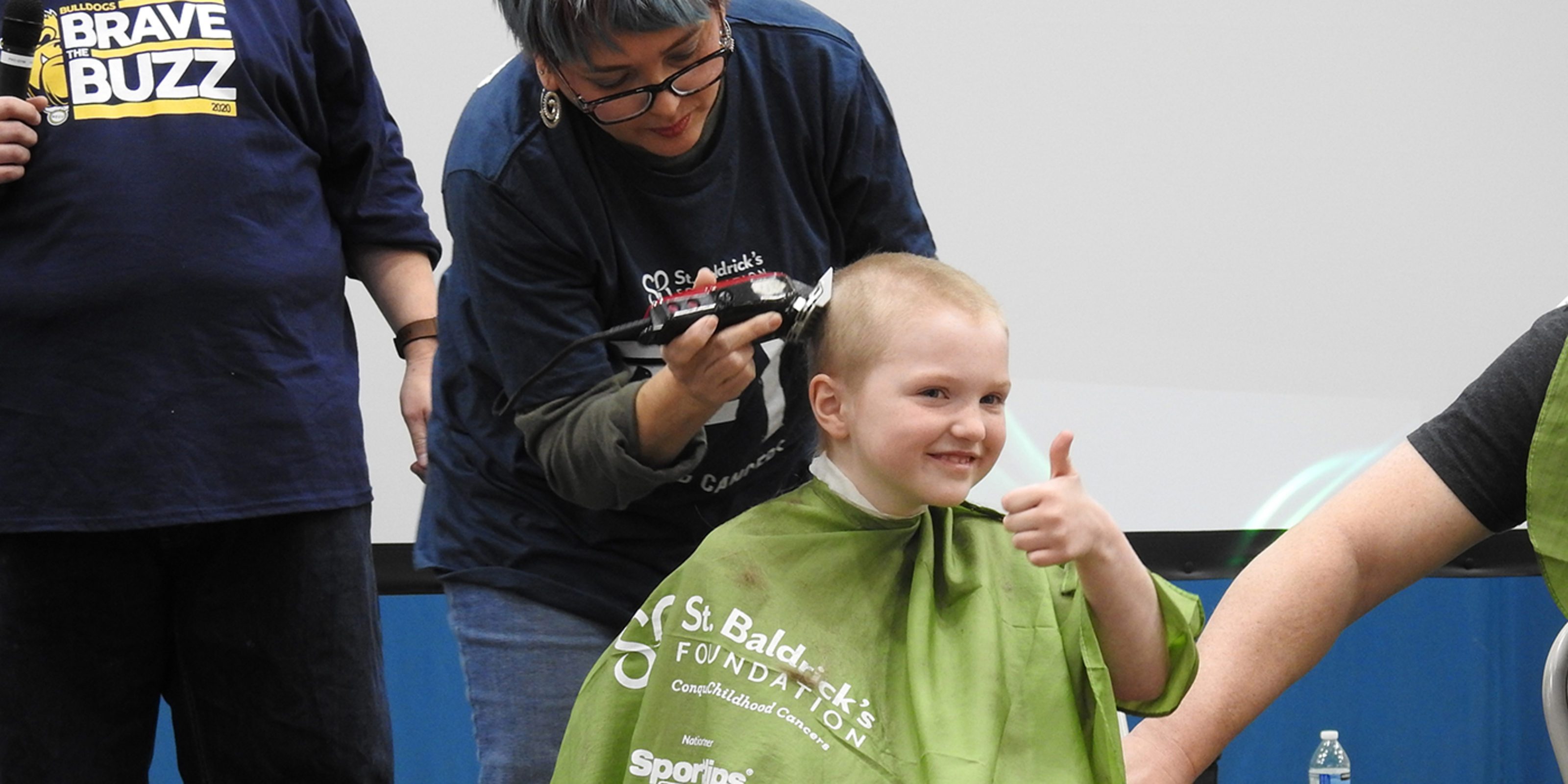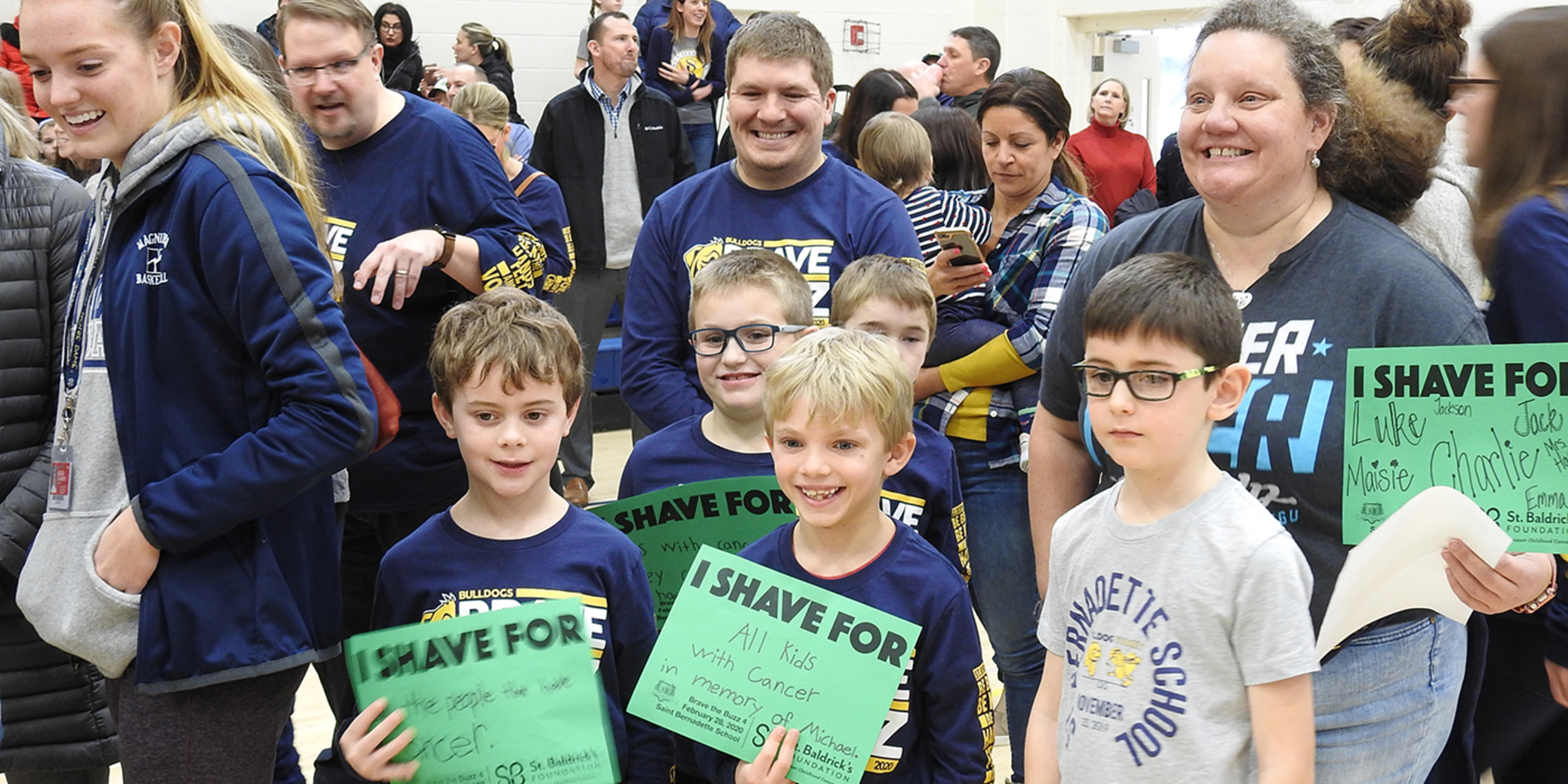 But it was a different story in the school gym where the school’s nearly 500 students, teachers, many parents and other supporters gathered for Brave the Buzz 4. Many were wearing navy blue and gold BB4 T-shirts, one way to support the event that raised funds for the St. Baldrick’s Foundation, a nonprofit organization that supports childhood cancer research.