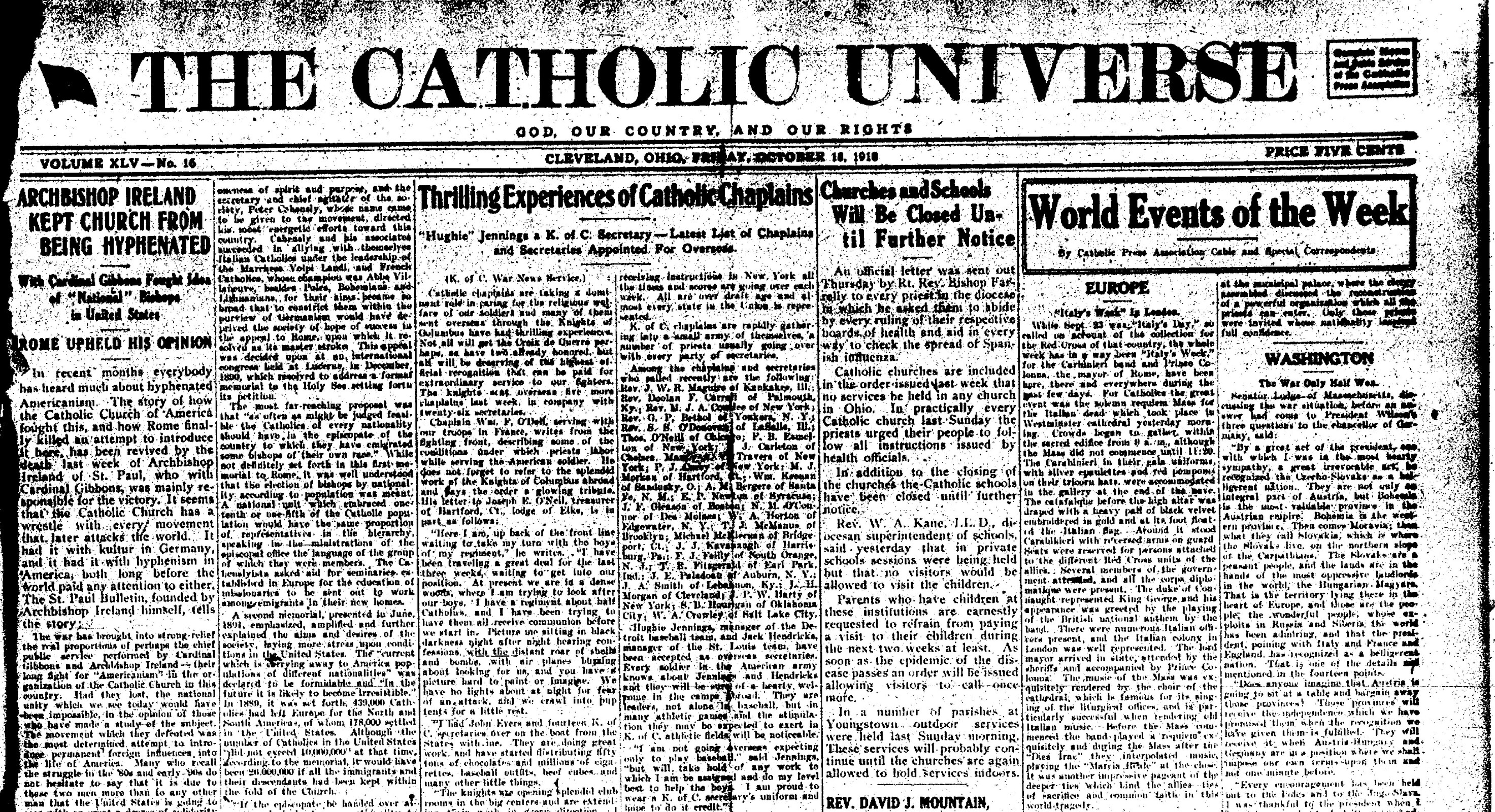 According to the Oct. 18, 1918 issue of The Catholic Universe, the diocesan weekly newspaper, Cleveland Bishop John Farrelly sent a letter to all priests asking them “to abide by every ruling of their respective boards of health and aid in every way to check the spread of Spanish influenza.” As a result, “churches and schools are closed until further notice,” the paper reported. Information about how to help curtail the disease was read in churches and published in local newspapers, including the Universe, which had a wide circulation among Catholics in the Diocese of Cleveland..