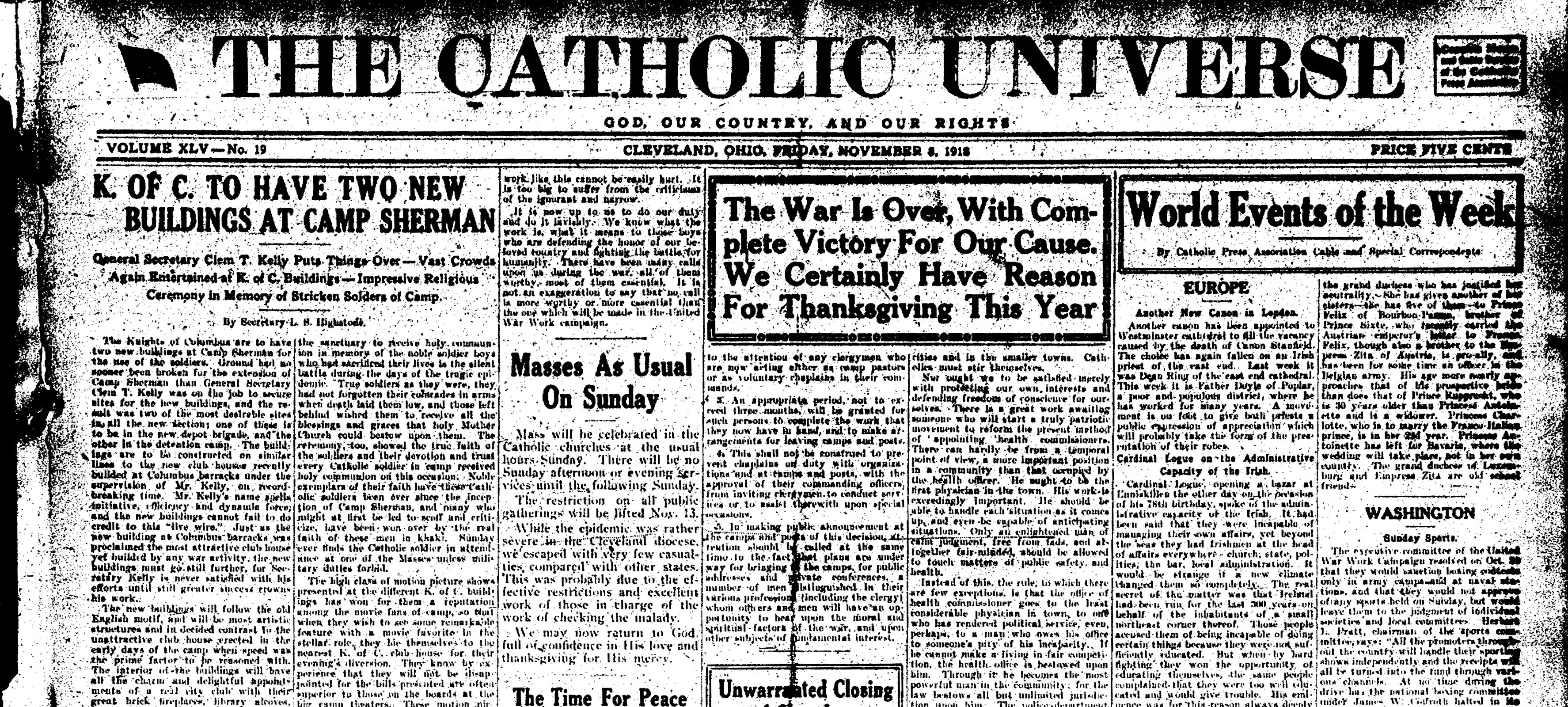 The ban on public gatherings, including church services, was lifted on Nov. 13, 1918. “We may now return to God full of confidence in his love and thanksgiving for his mercy,” Universe reported in its Nov. 8, 1918 issue.