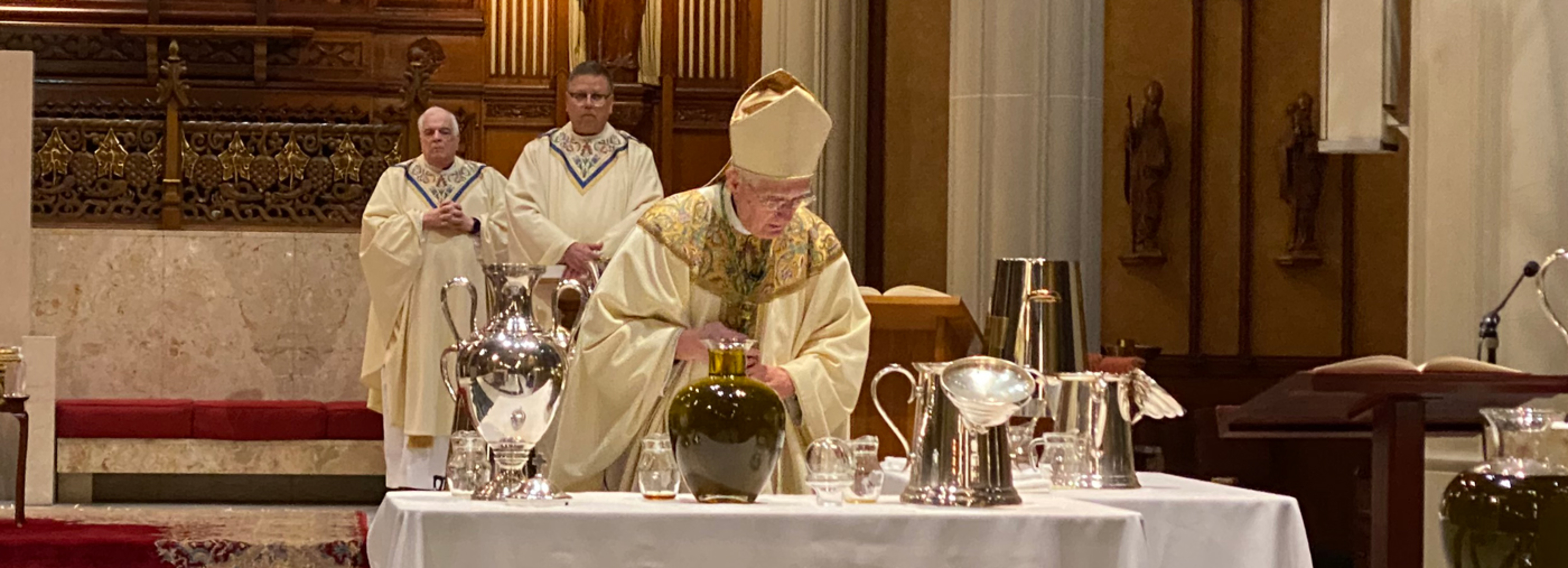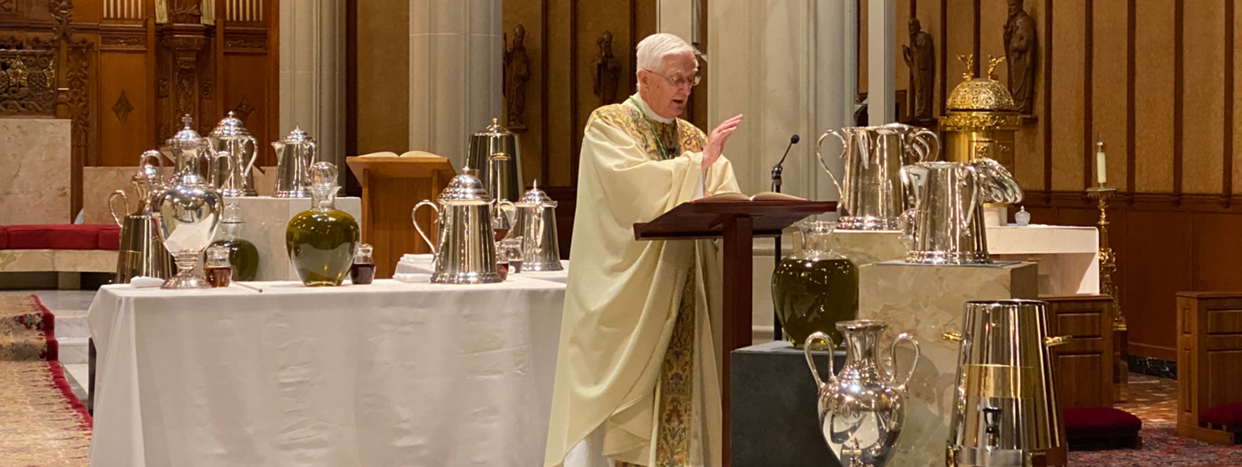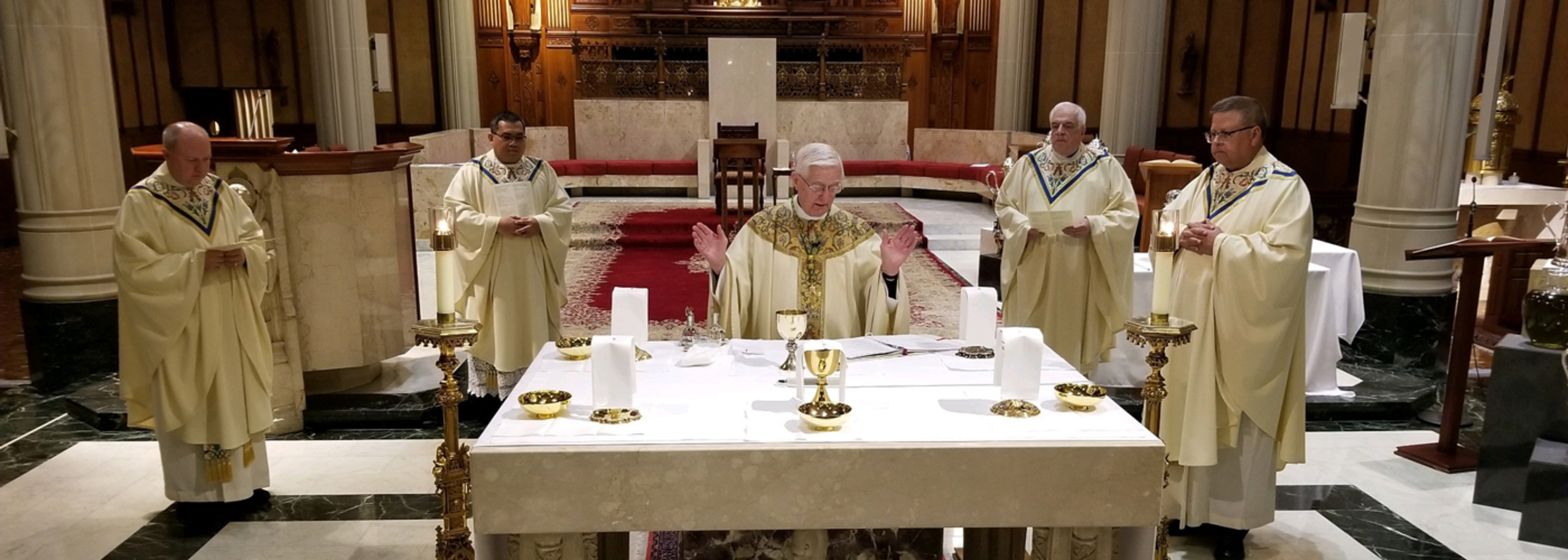 Bishop Martin Amos, retired bishop of Davenport, Iowa and a former priest of the Catholic Diocese of Cleveland, celebrated a private, livestreamed chrism Mass on April 7 from the empty Cathedral of St. John the Evangelist in downtown Cleveland. Faithful from across the eight-county Catholic Diocese of Cleveland – and beyond – saw the liturgy live while others watched it later on the diocesan website.