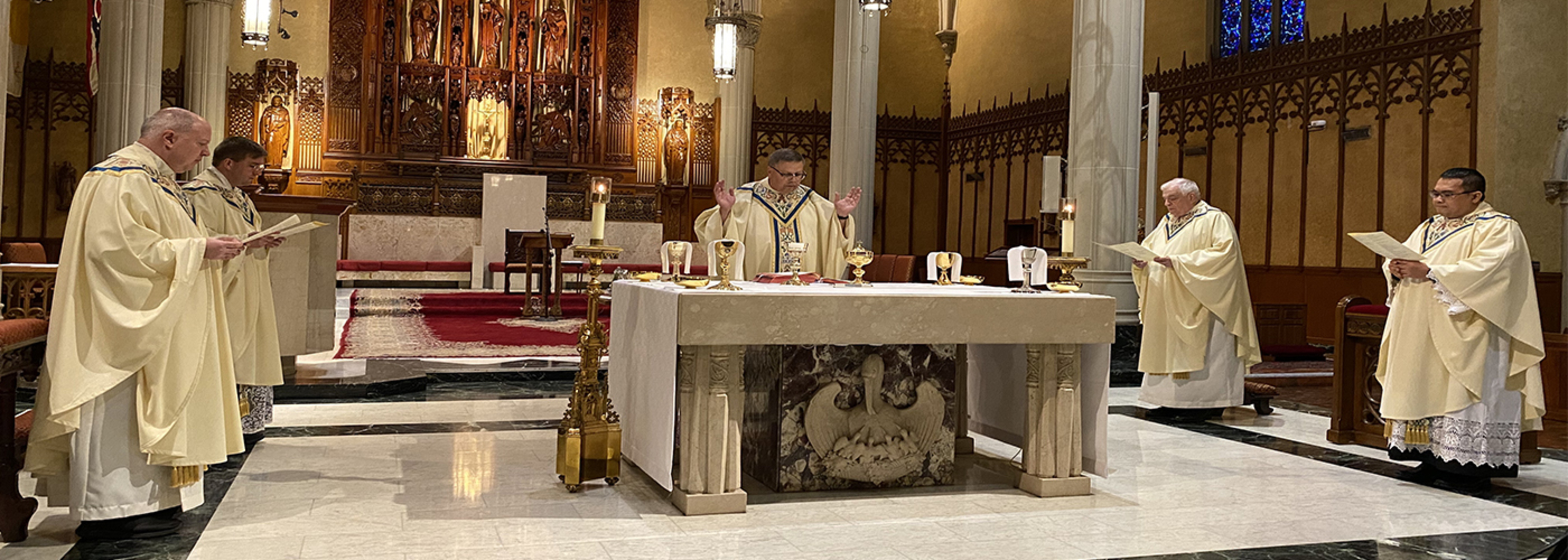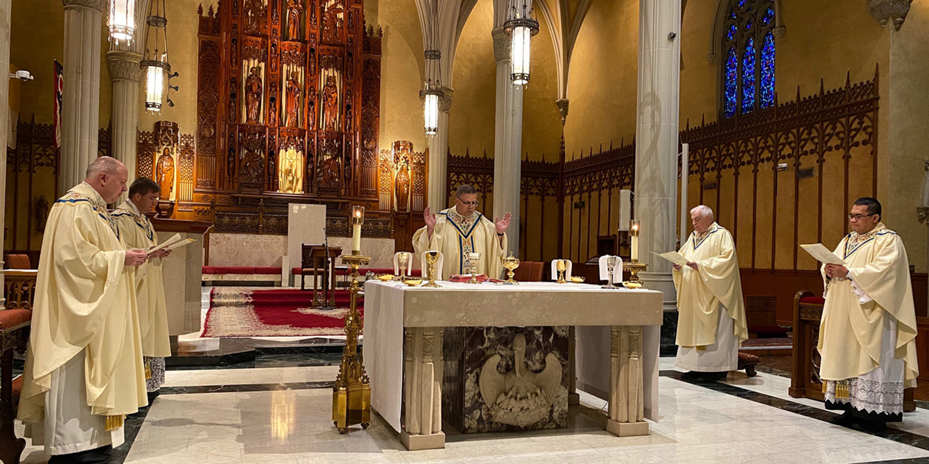 Father Donald Oleksiak, diocesan administrator, celebrated the Mass of the Lord’s Supper on April 9 in the Cathedral of St. John the Evangelist in downtown Cleveland. Concelebrants were Father Dan Schlegel, vicar for clergy and religious; Father Sean Ralph, cathedral rector; Father John Manning, delegate for senior priests; and Father Arnel Lagman, cathedral parochial vicar, all of whom are in residence at the cathedral rectory.