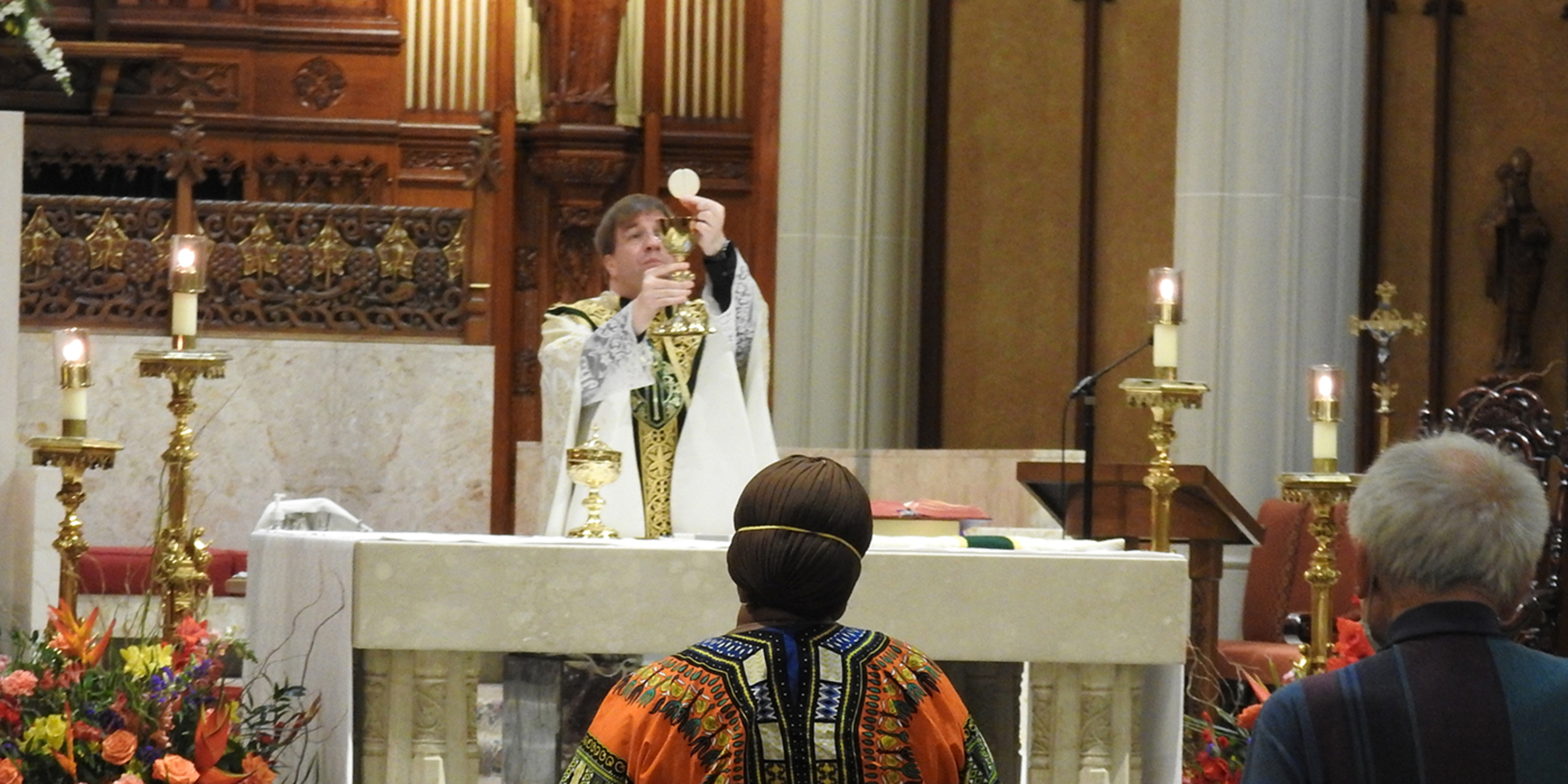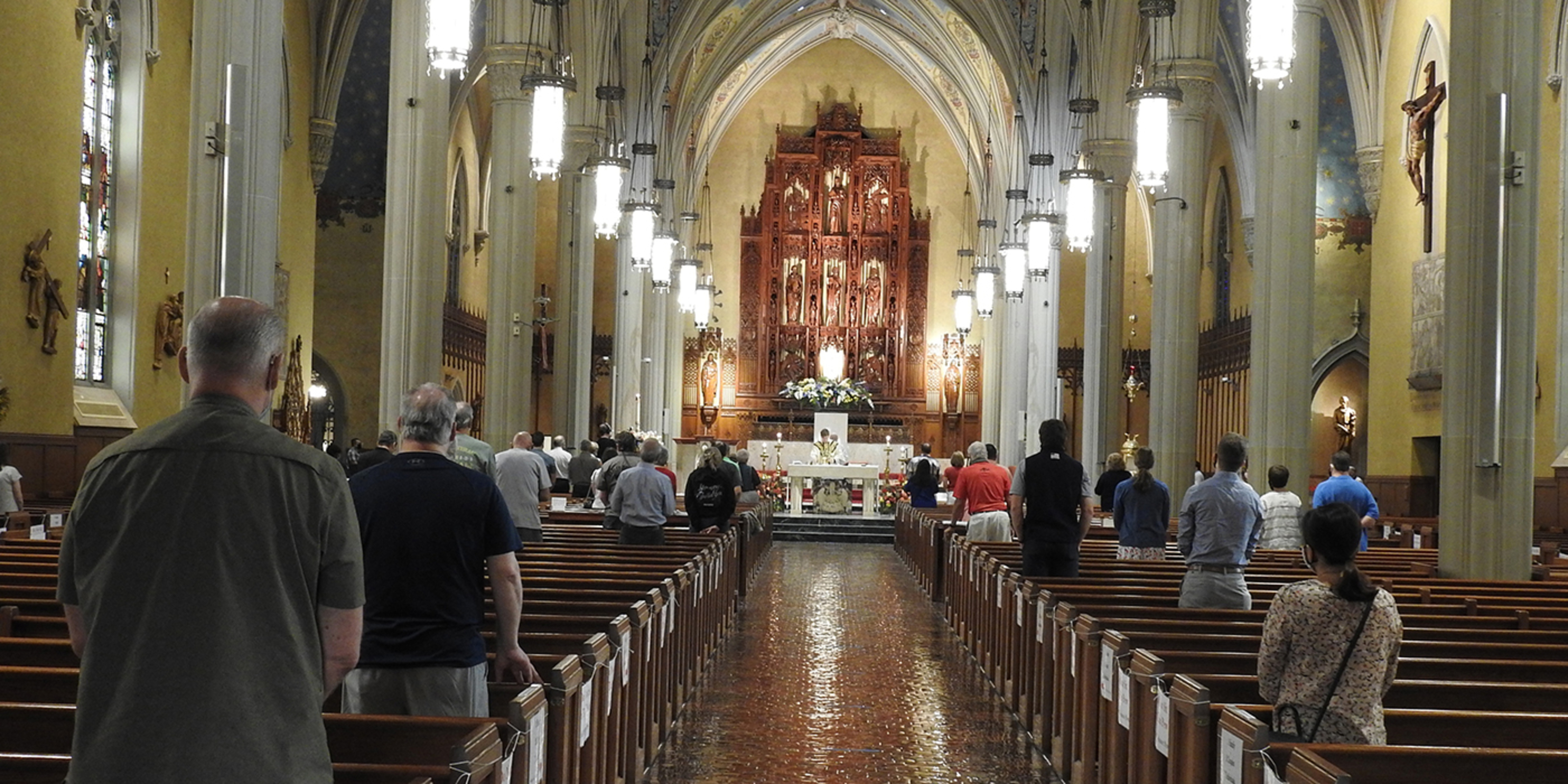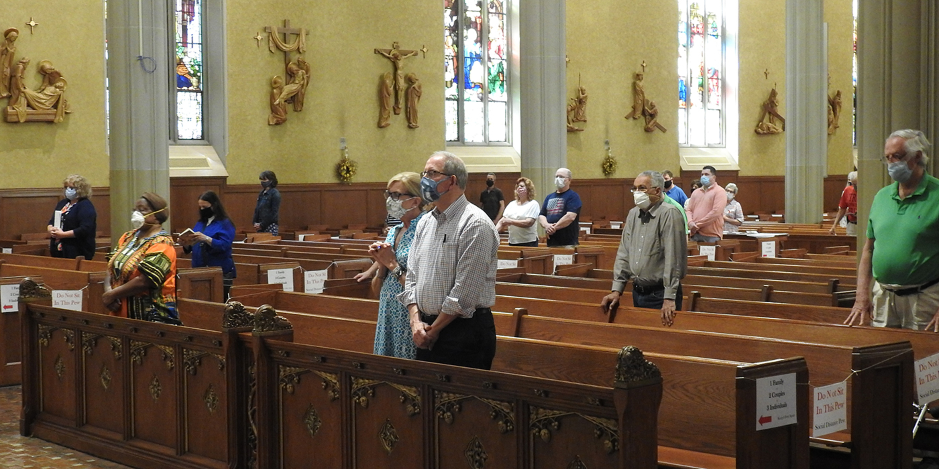Welcome back,” Father Sean Ralph said to the nearly 60 people who attended the 9:30 a.m. Mass on Memorial Day at the Cathedral of St. John the Evangelist in downtown Cleveland. It was the first Mass celebrated publicly at the cathedral since the suspension of public liturgies in March due to the coronavirus health crisis. “I am delighted to be here with you to celebrate the most important thing we do,” he added. Father Ralph is cathedral rector.