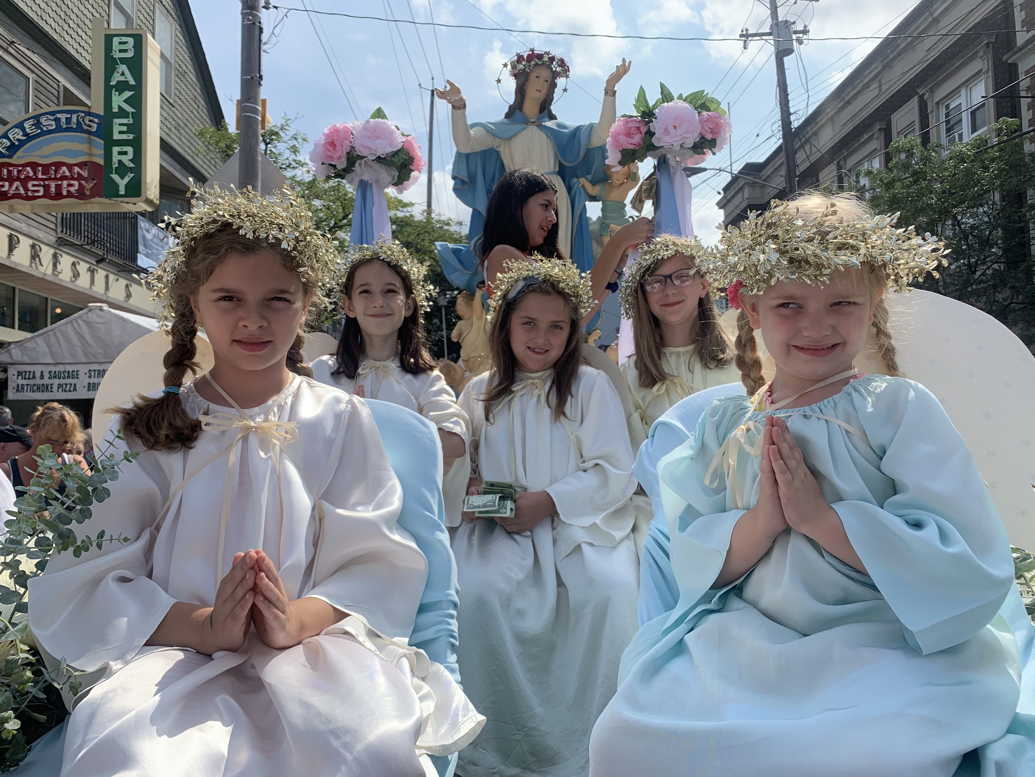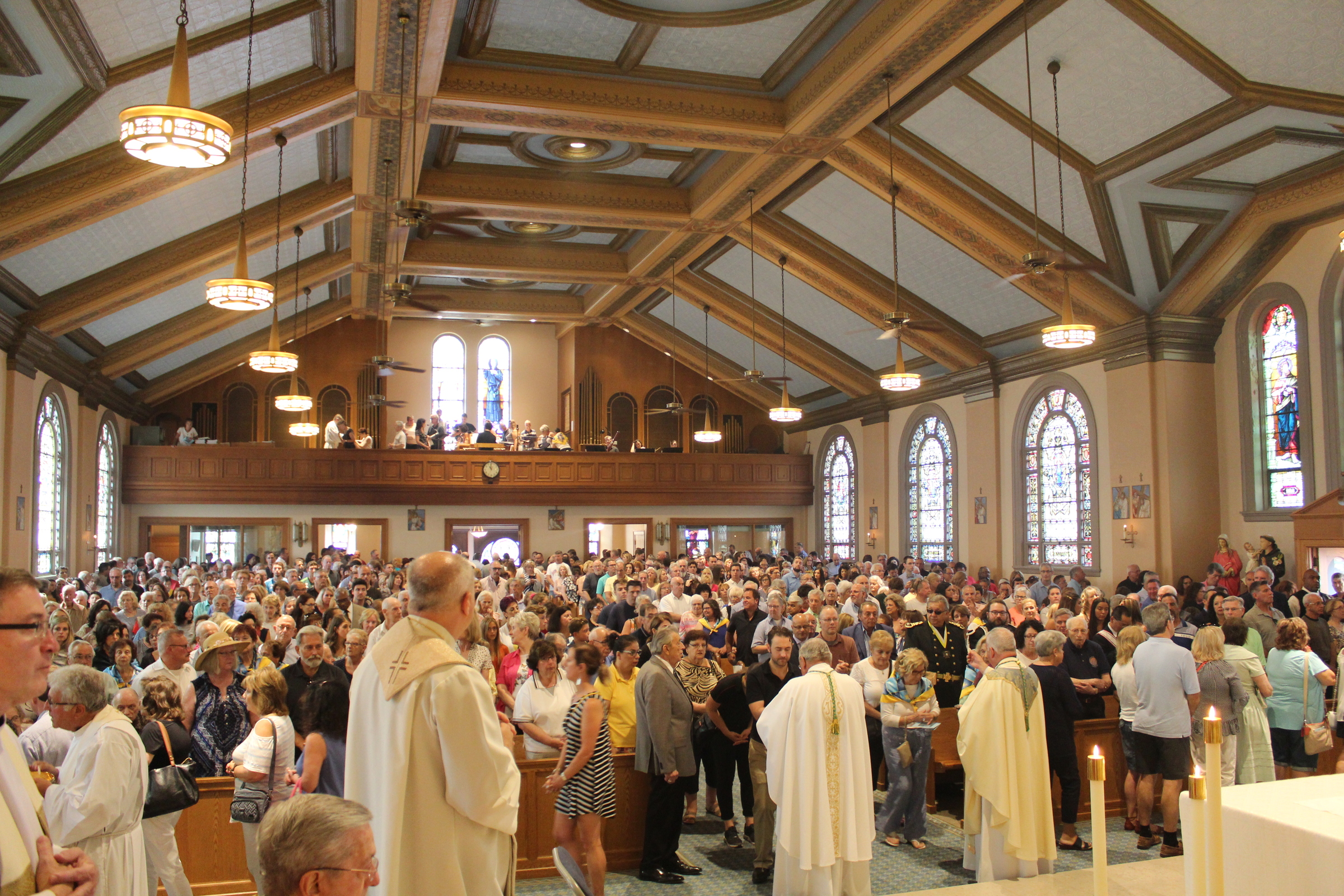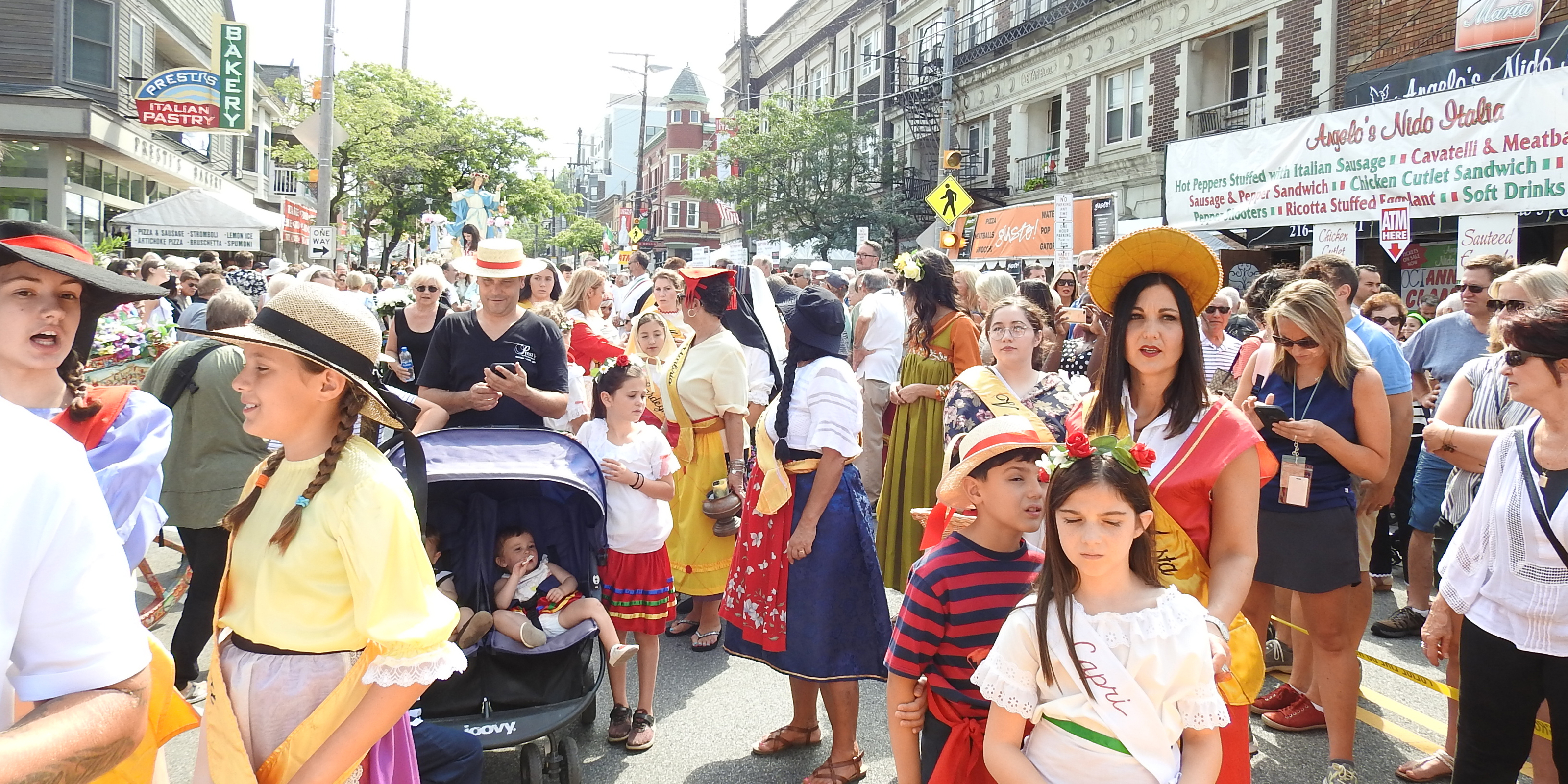 After Mass, a procession including hundreds of people moves through the neighborhood while participants, many in native dress from various regions of Italy, members of the clergy, community and parish organizations sing and pray. Focal point of the procession is a statue of the Blessed Mother. After the procession, the statue is returned to a special shrine area on the east side of the church where the faithful can light votive candles and pray throughout the festival.
