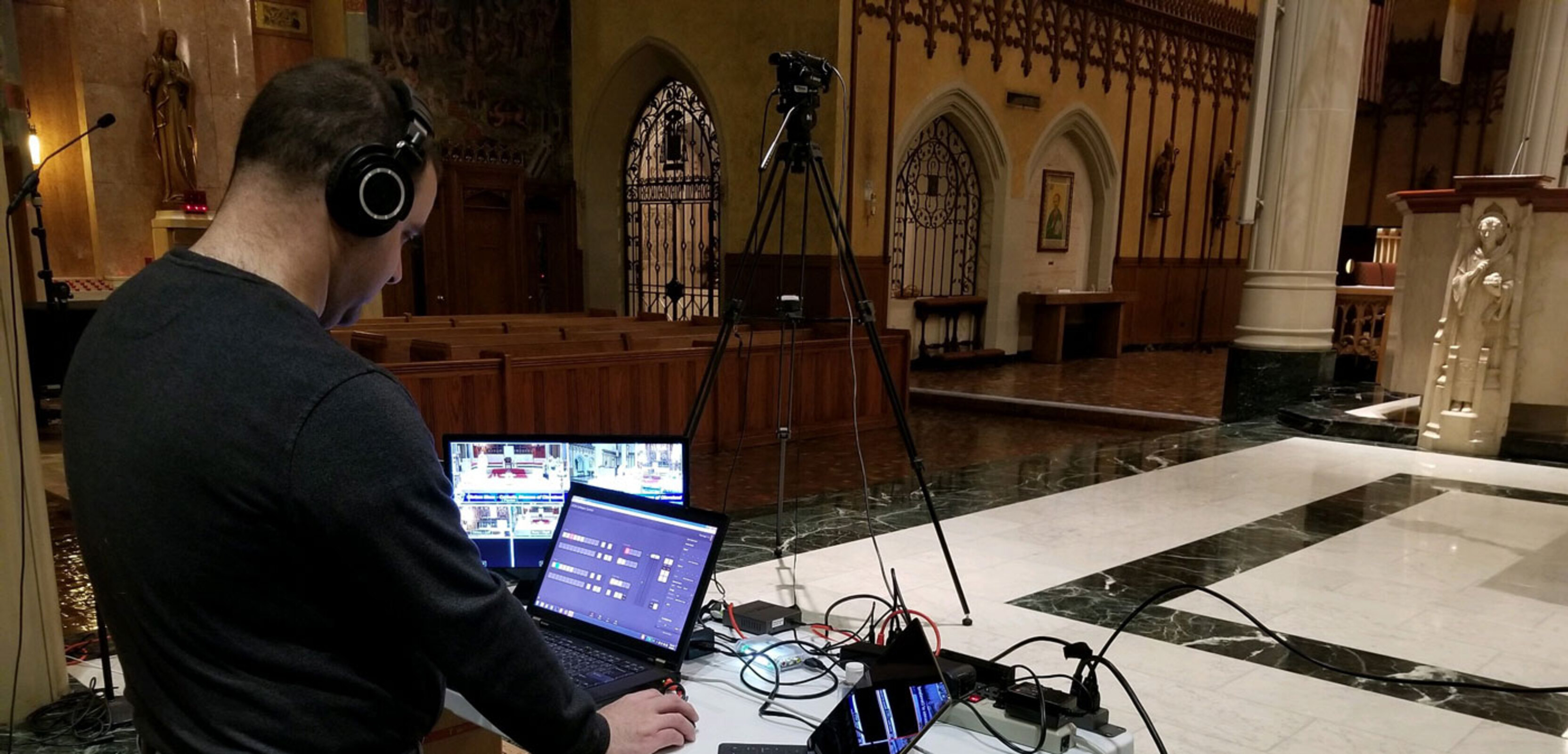 Staff members from the diocesan Communications Department record the Sunday TV Mass and livestream liturgies daily -- except for Saturday – with a portable video cameras in the cathedral.
