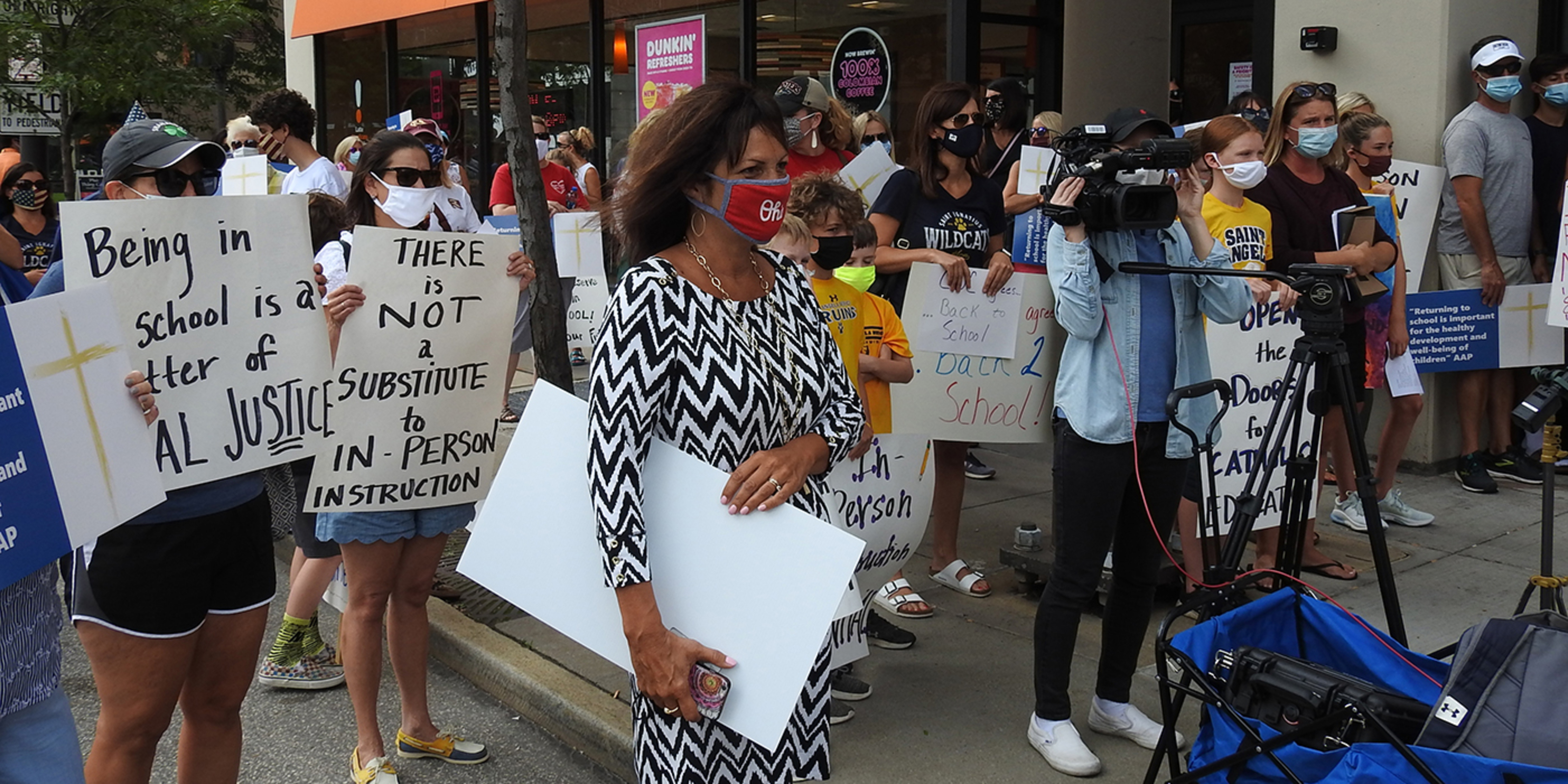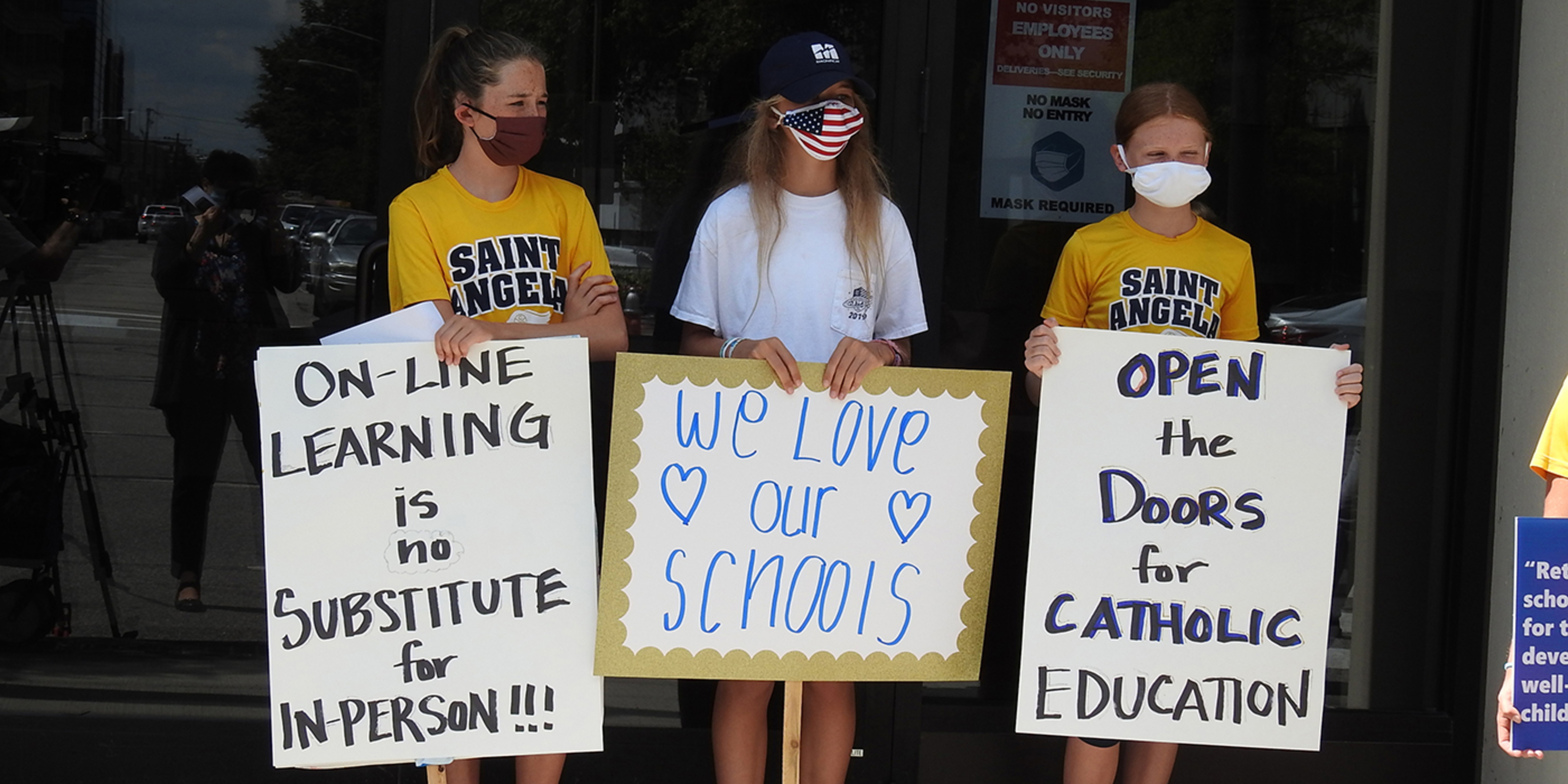 About 75 people – mainly parents and students -- gathered on the sidewalk outside Cathedral Square Plaza on East Ninth Street in downtown Cleveland. The group was respectful. They wore face masks and many carried signs with messages such as “Be not afraid – Open our schools in person 5 days a week,” “Keep our Catholic schools open,” “In-person instruction is essential,” “Jesus taught in person – so can we,” “Kids need school,” “We love our schools,” “Being in school is a matter of social justice” and “Catholic schools are the heart of the Church.”
