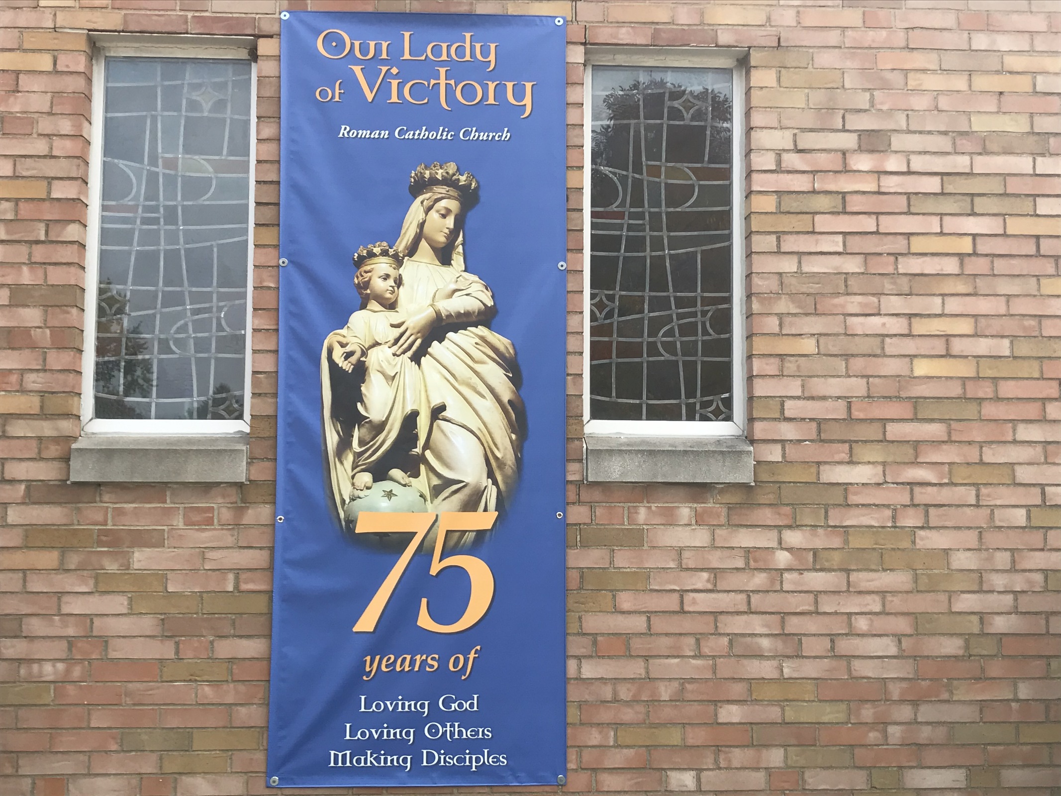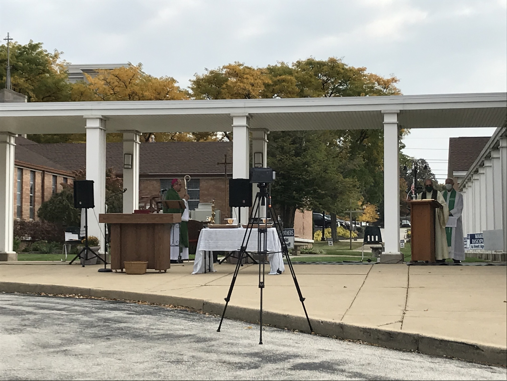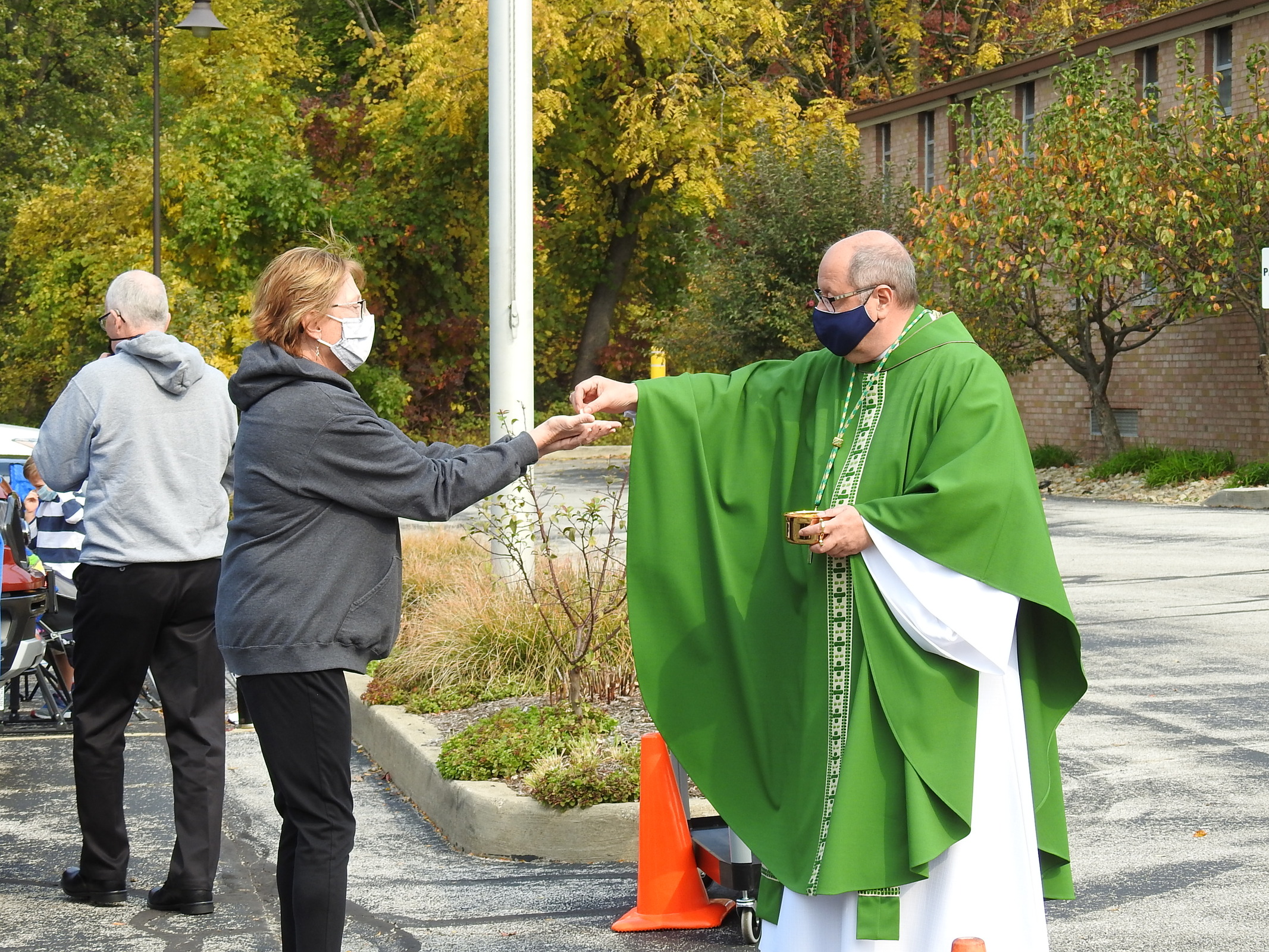 About 75 cars gathered on Oct. 11 in the parking lot of Our Lady of Victory Parish in Tallmadge for one of the parish's regular (weather permitting) 11 a.m. outdoor Masses. Skies were slightly overcast and the 60-degree temperature was fall-like, as were the colorful leaves. Some parishioners sat in lawn chairs while other stayed in their cars and prepared to listen to Mass on the radio.