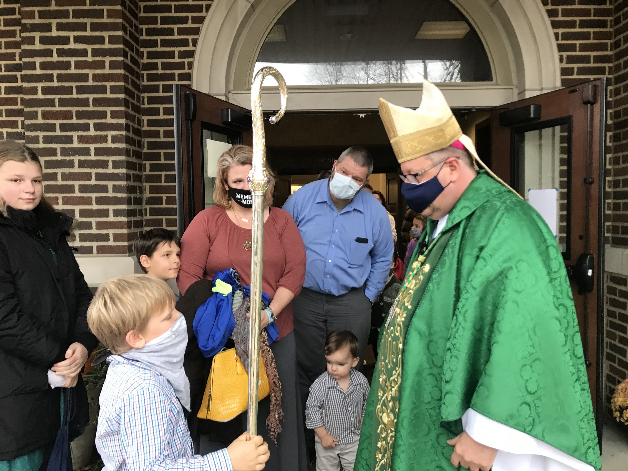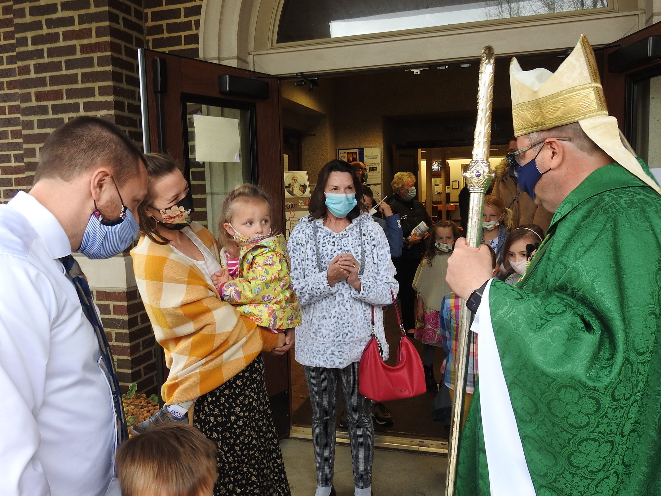 After Mass, he chatted – socially distanced and wearing a face mask – with parishioners. Several families greeted him and one young boy relished the opportunity to hold the bishop’s crosier and try on his zucchetto (the fuchsia skullcap-type hat bishops wear under their miter).