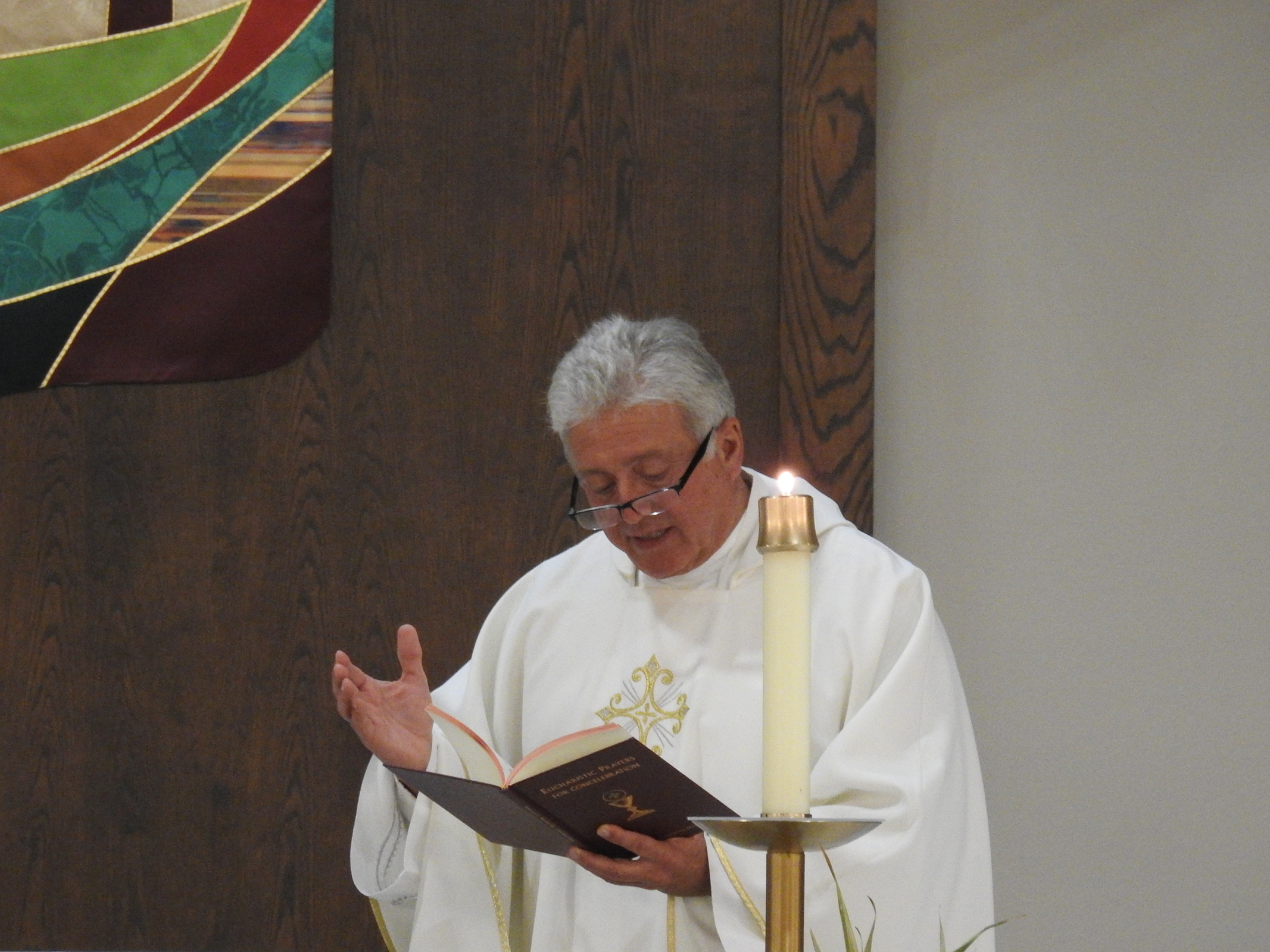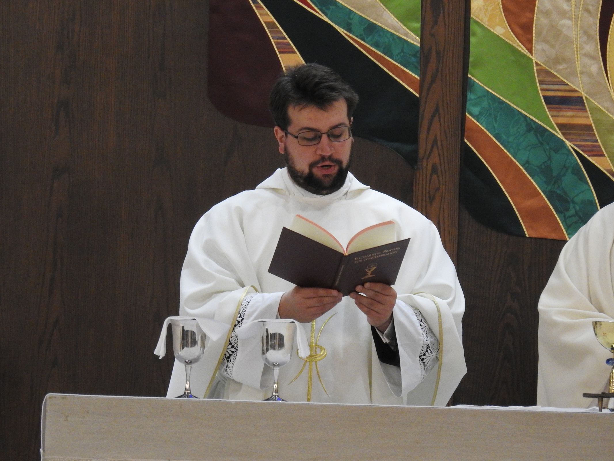 Father Racco noted the large crucifix that hangs over the altar is from the original church, which was dedicated in 1952 and repurposed when the current church was built to accommodate the growing parish. The chalice used at Mass is the parish chalice that belonged to Father Joseph Dempsey, the founding pastor.