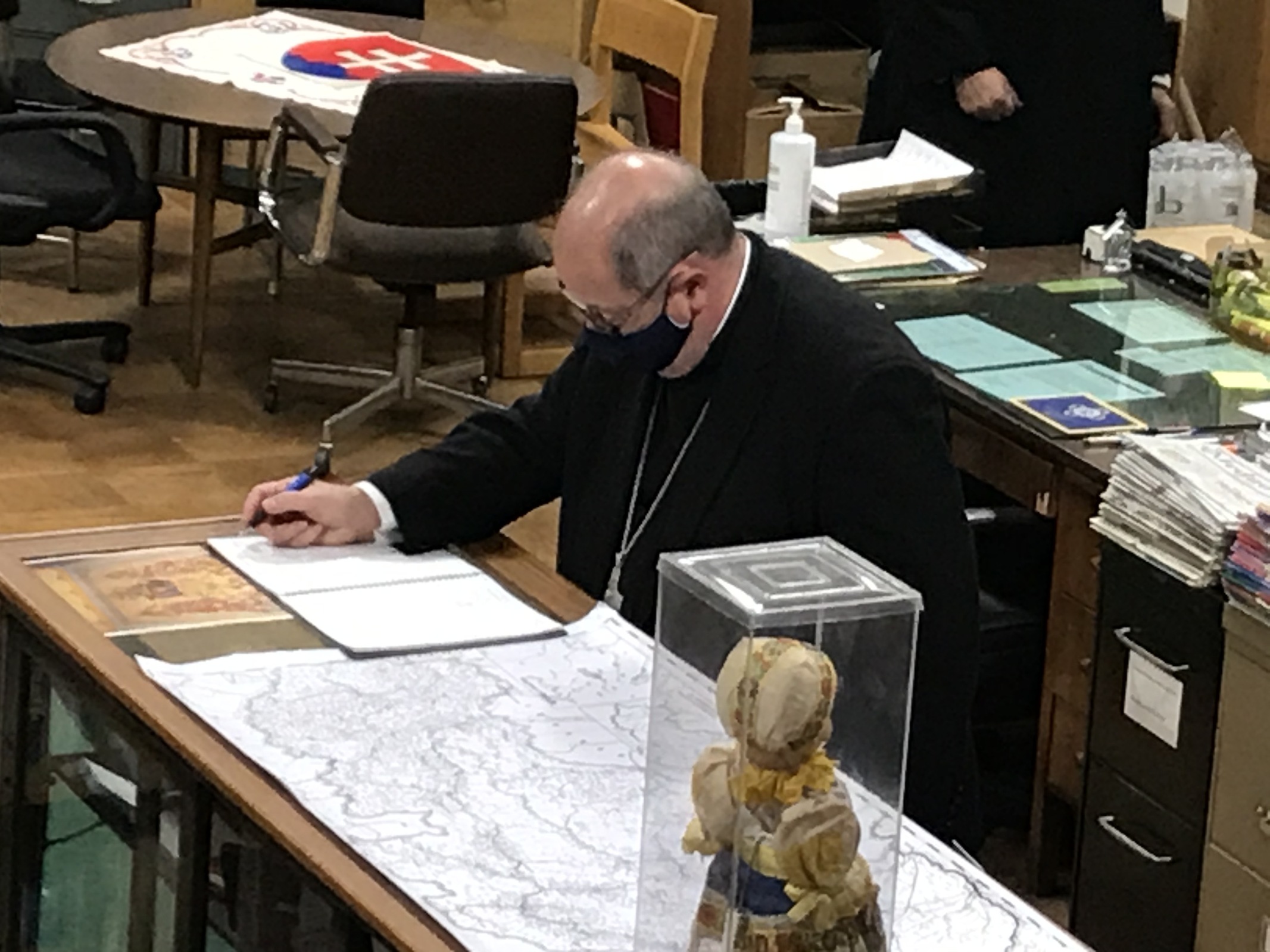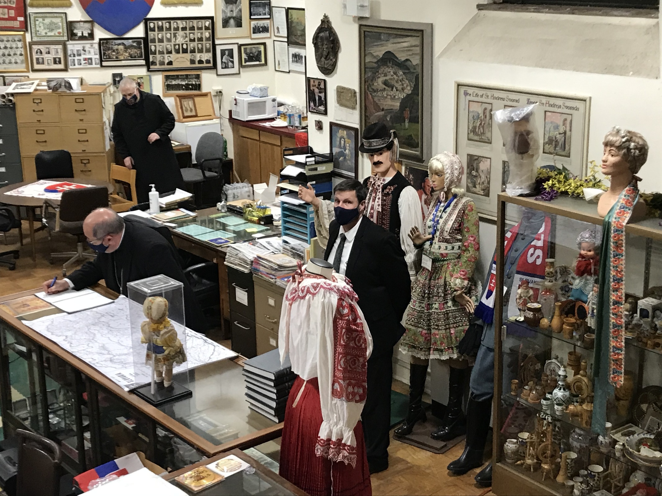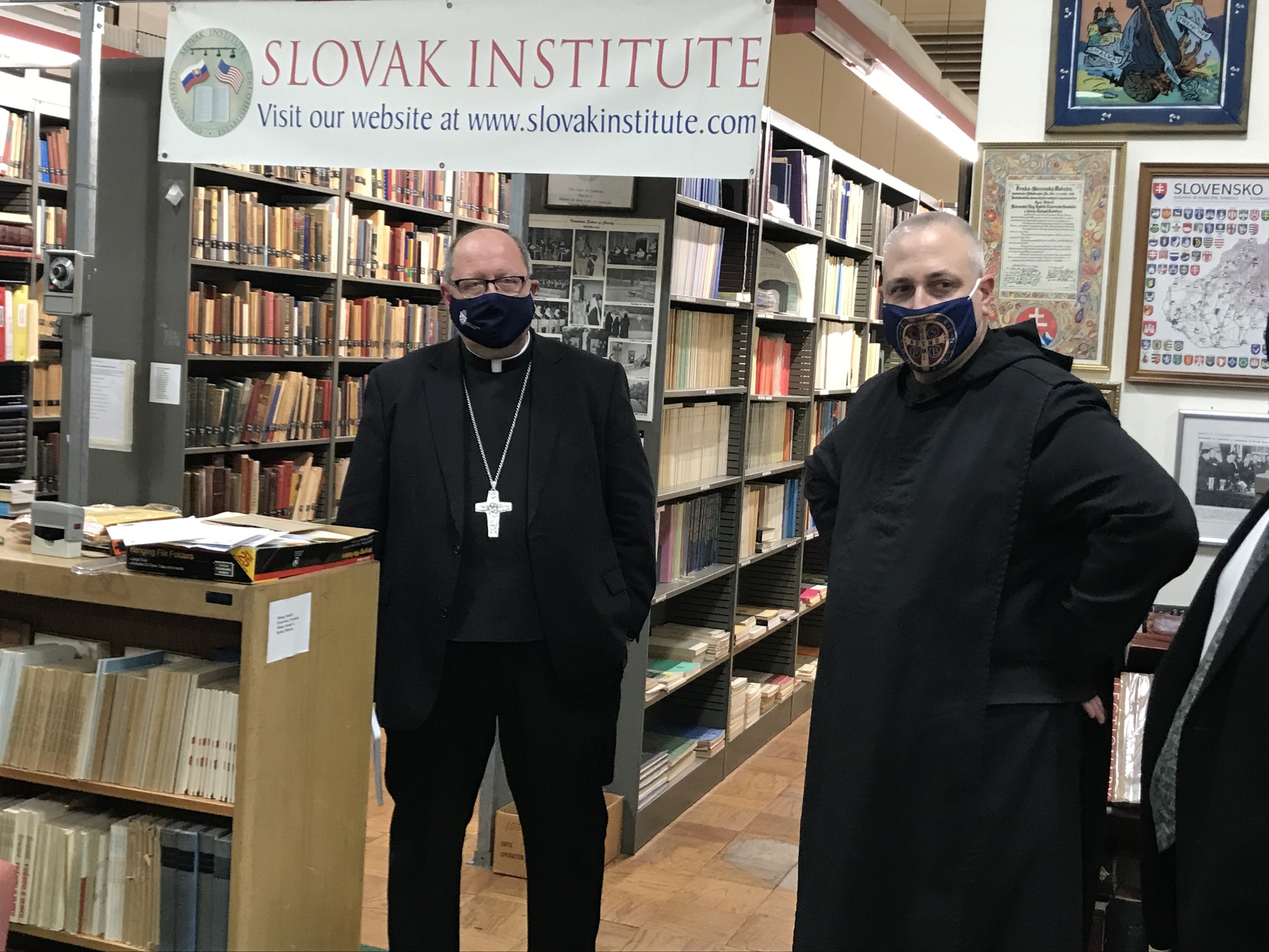 After dinner, the bishop and the monks discussed a variety of topics including their vocations, life at the abbey, seminary days and more. He also got a tour of the Slovak Institute, which is housed at the abbey. The institute features an extensive display of artifacts and history of Slovakia. It intrigued Bishop Malesic, who serves on the United States Conference of Catholic Bishops’ Subcomittee on the Church in Central and Eastern Europe. He chatted with Brother Gabriel, Father Michael and Abbot Gary about the institute and the contributions of Slovak Americans in the Diocese of Cleveland and Greater Cleveland.