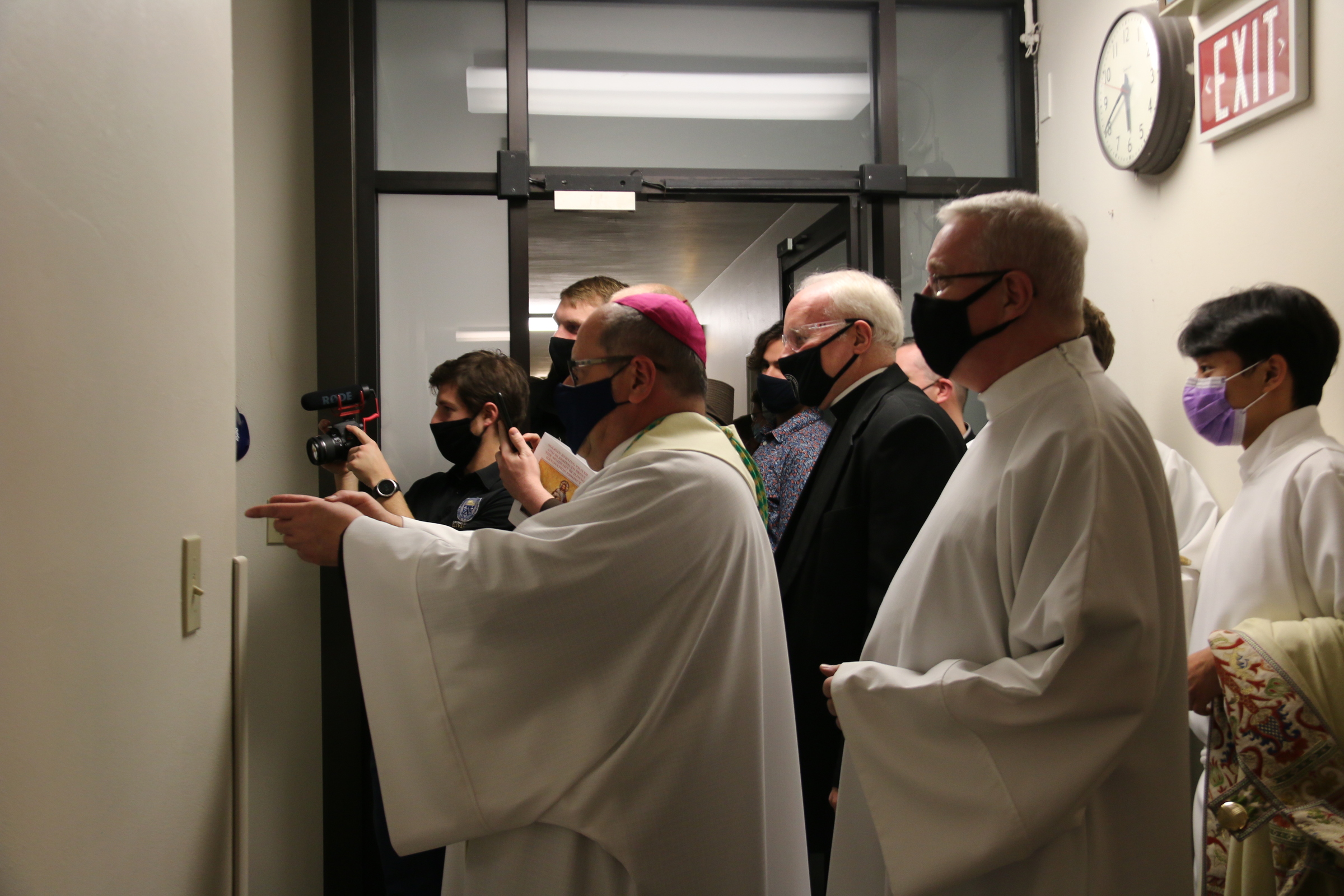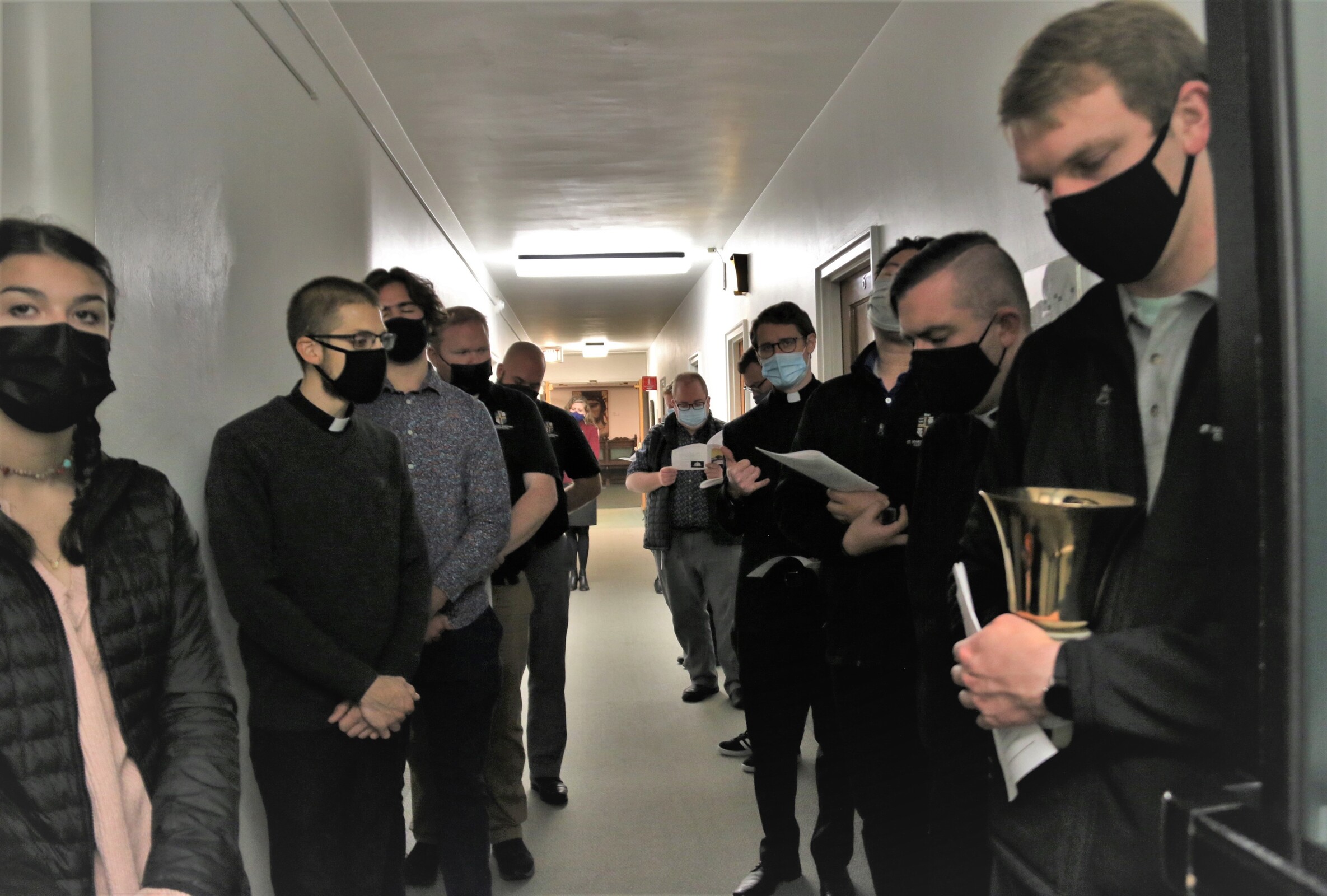 The bishop, seminary leaders, faculty, staff and students participated in “Raise the Hammer” on Nov. 24, as the seminarians prepared to leave the CPL and return home after concluding in-person classes for the fall semester. The event included evening prayer after which the group took turns swinging a sledgehammer to “demolish” some doors in the recently vacated area.