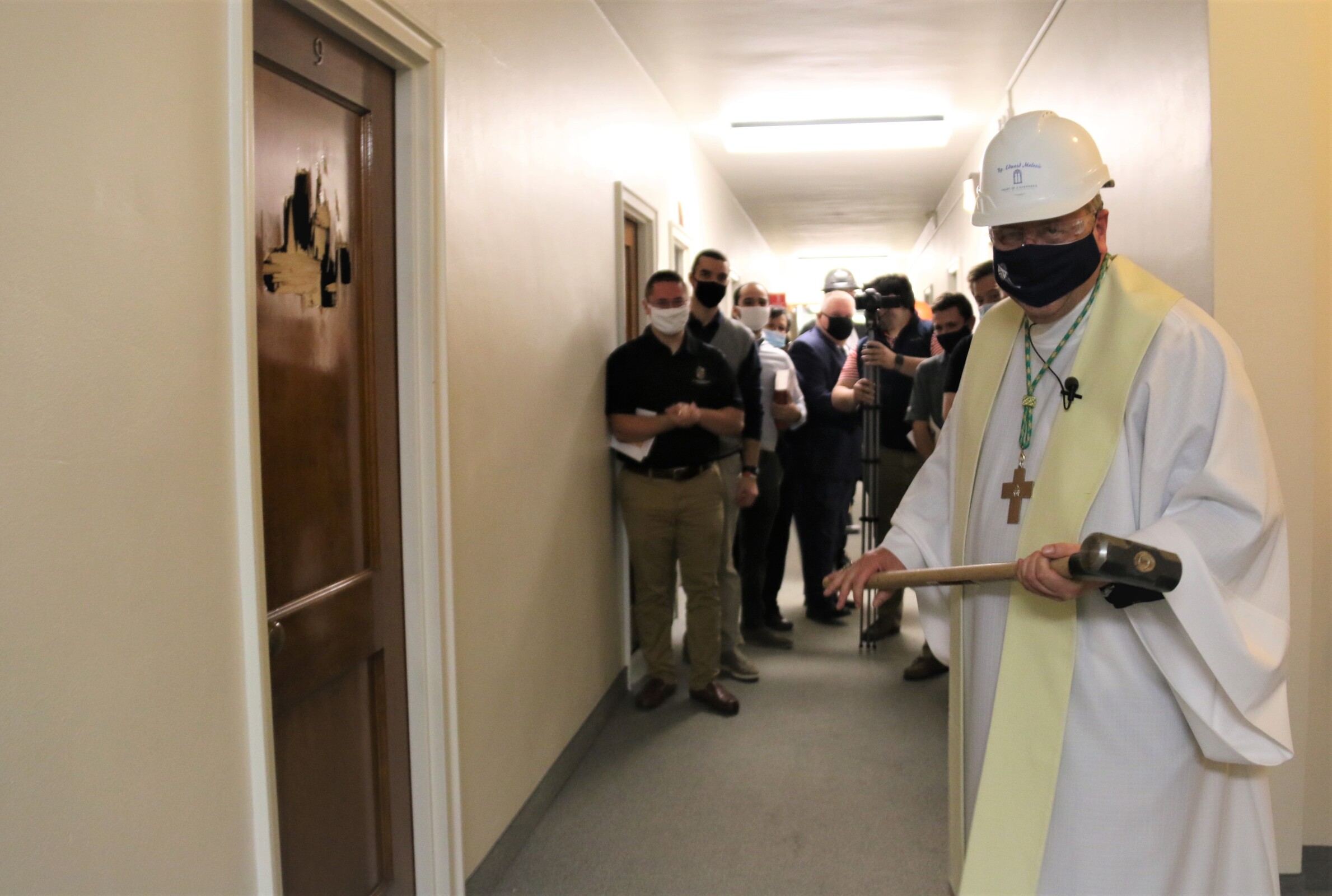 Bishop Edward Malesic took the first ceremonial swing with a sledgehammer to begin a major renovation project on the Saint Mary Seminary wing at the Center for Pastoral Leadership.