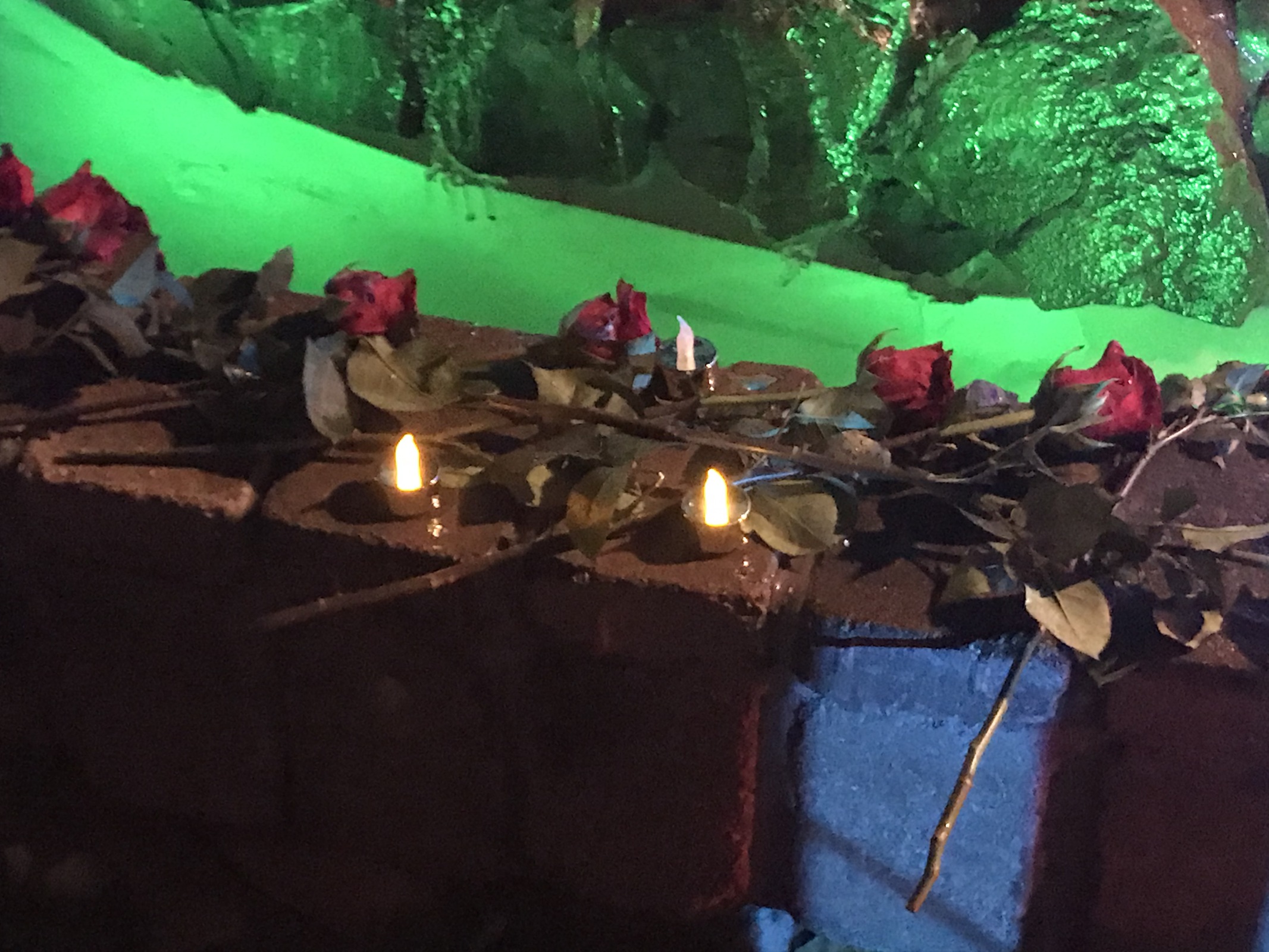 During the grotto blessing, small amounts of water from the Jordan River and Sea of Galilee, which were brought back after a pilgrimage to the Holy Land, were added to the water in the moat. Women from the parish received a red rose and were invited to lay the on the side of the grotto.