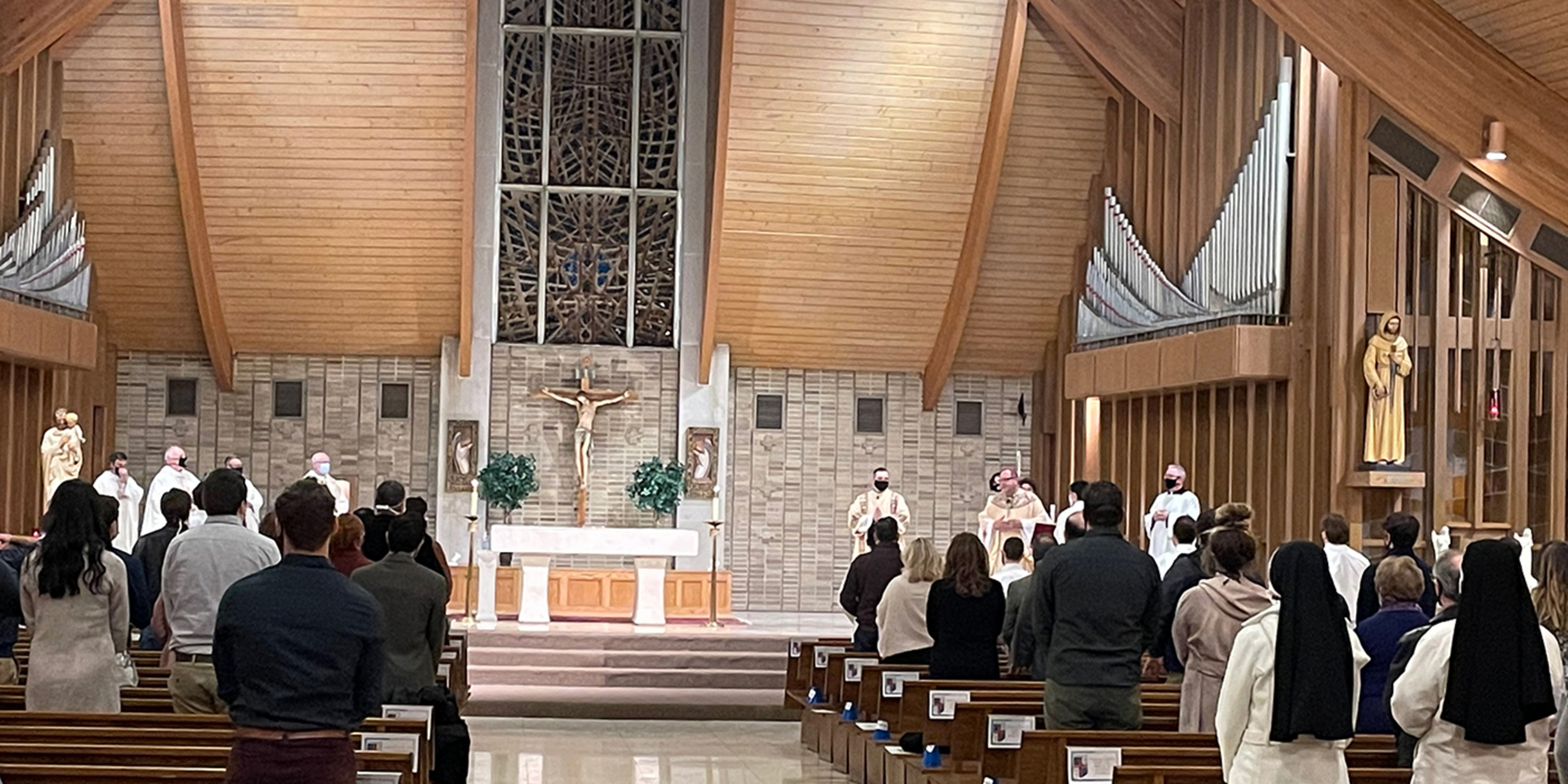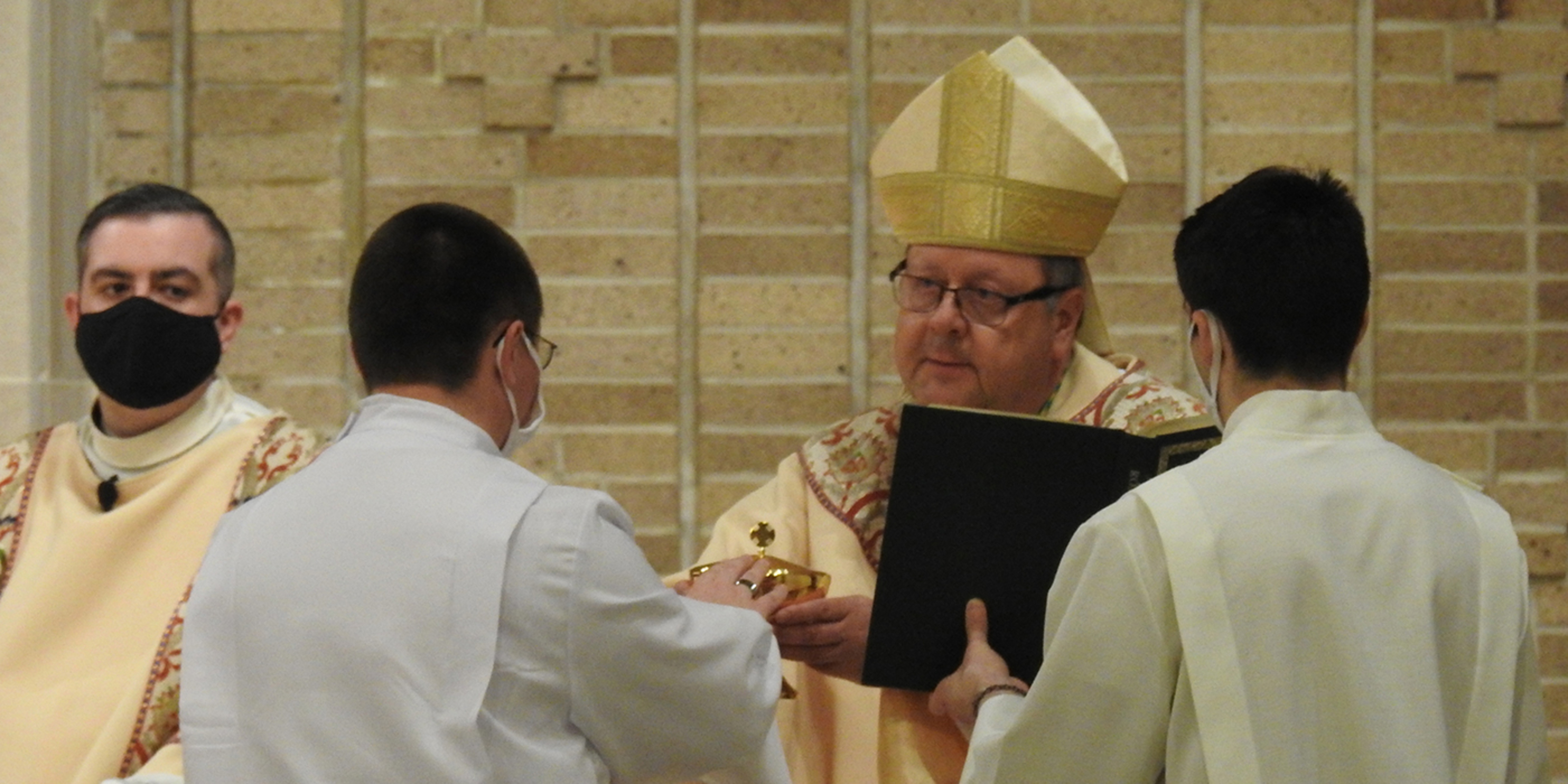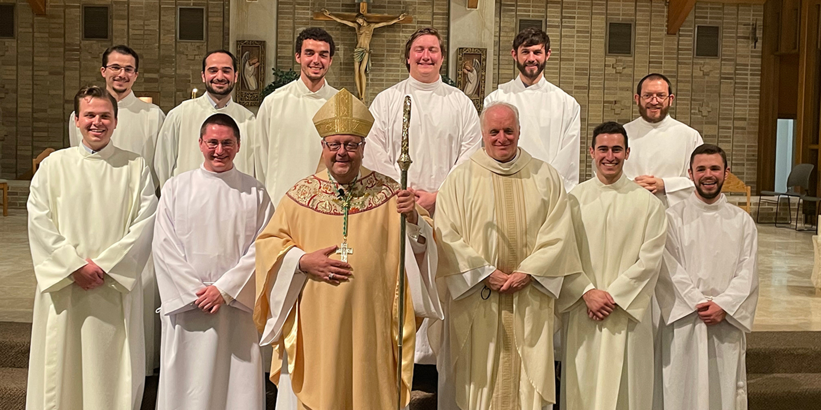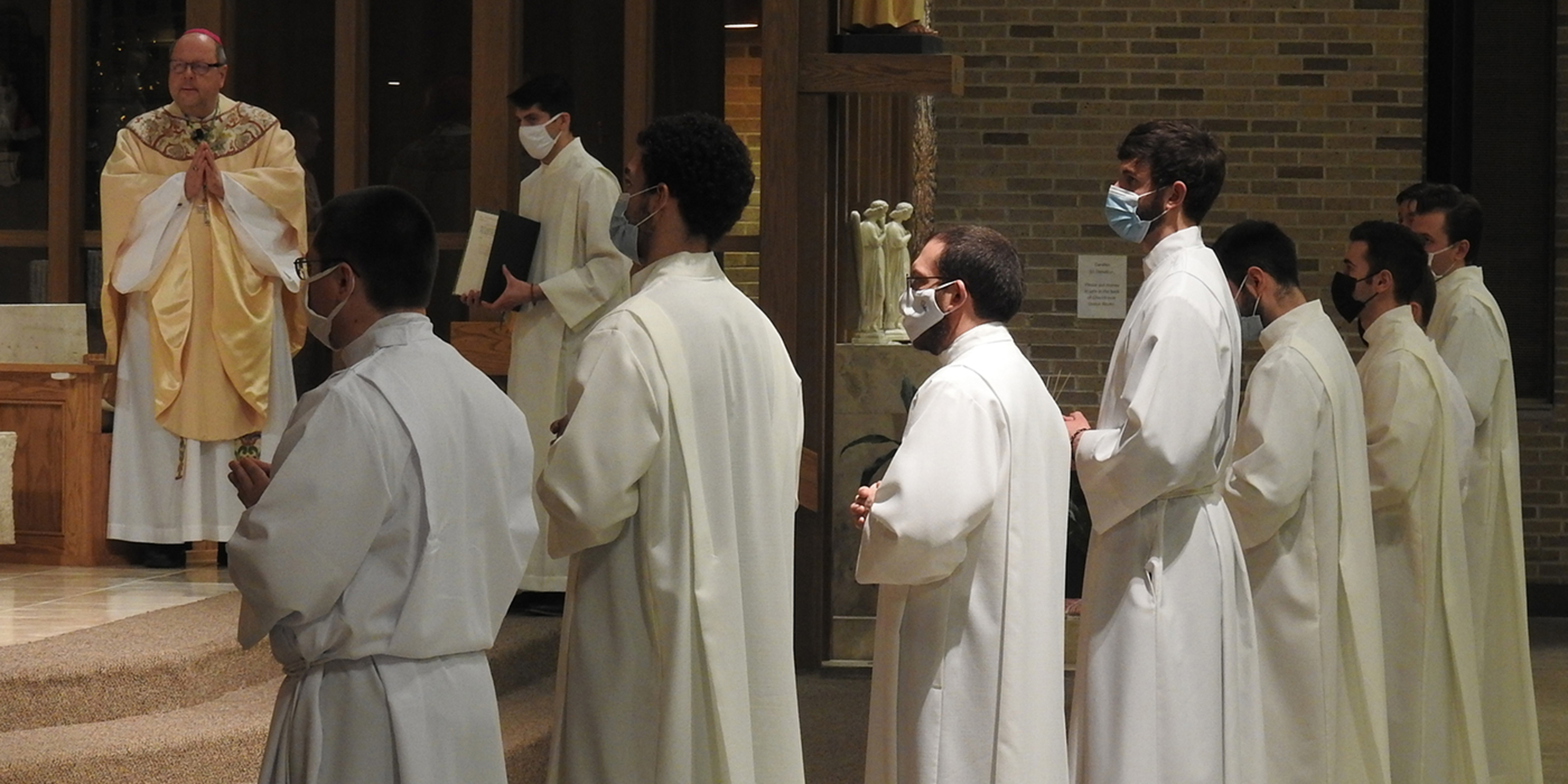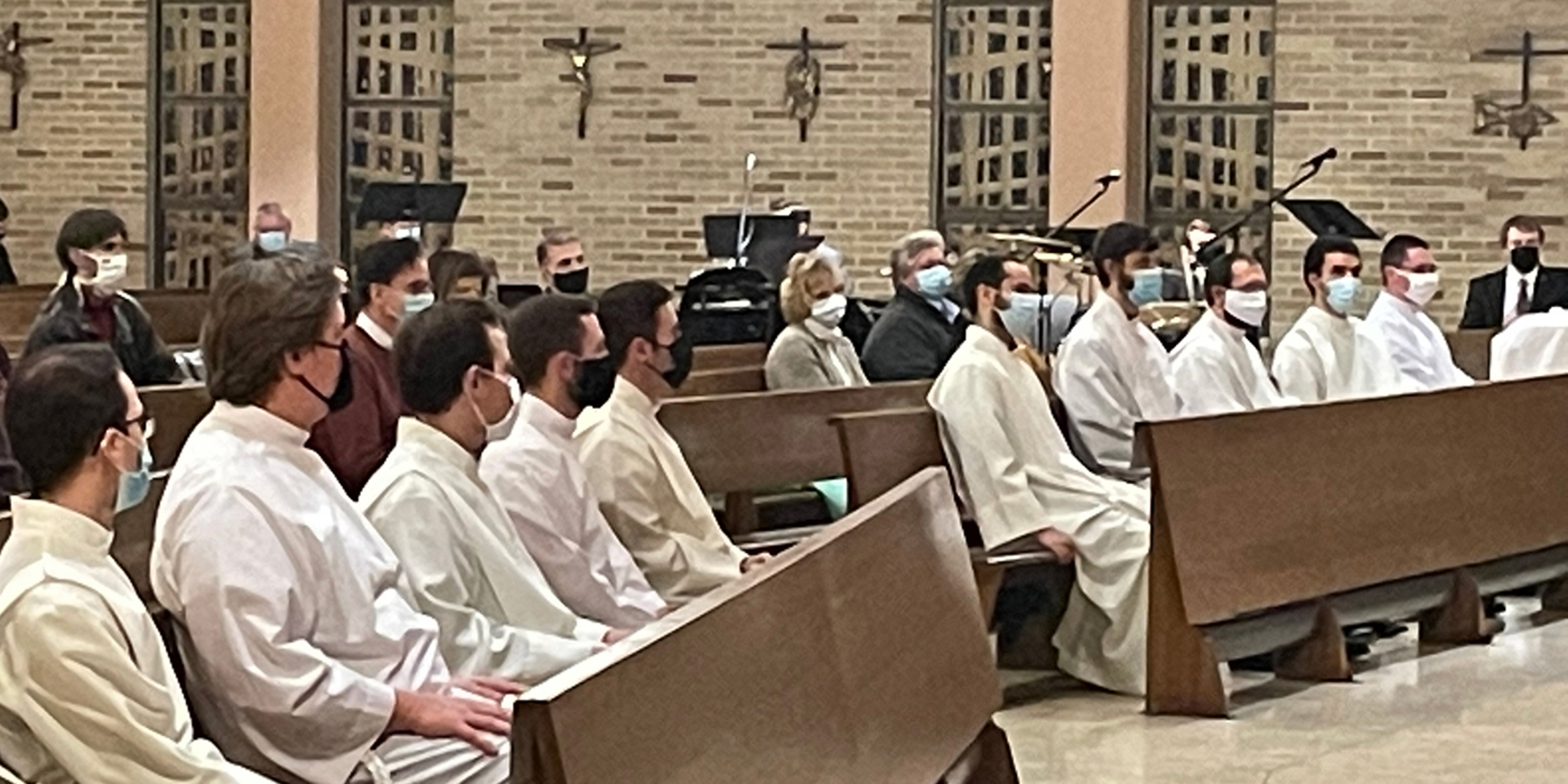 Bishop Edward Malesic instituted 10 men from Saint Mary Seminary who are in their first year of study and discernment for the priesthood into the ministry of acolyte during a Mass on Feb. 5 at SS. Robert and William Church in Euclid. Attendance at the liturgy was limited because of pandemic guidelines, but it was livestreamed on the diocesan website.