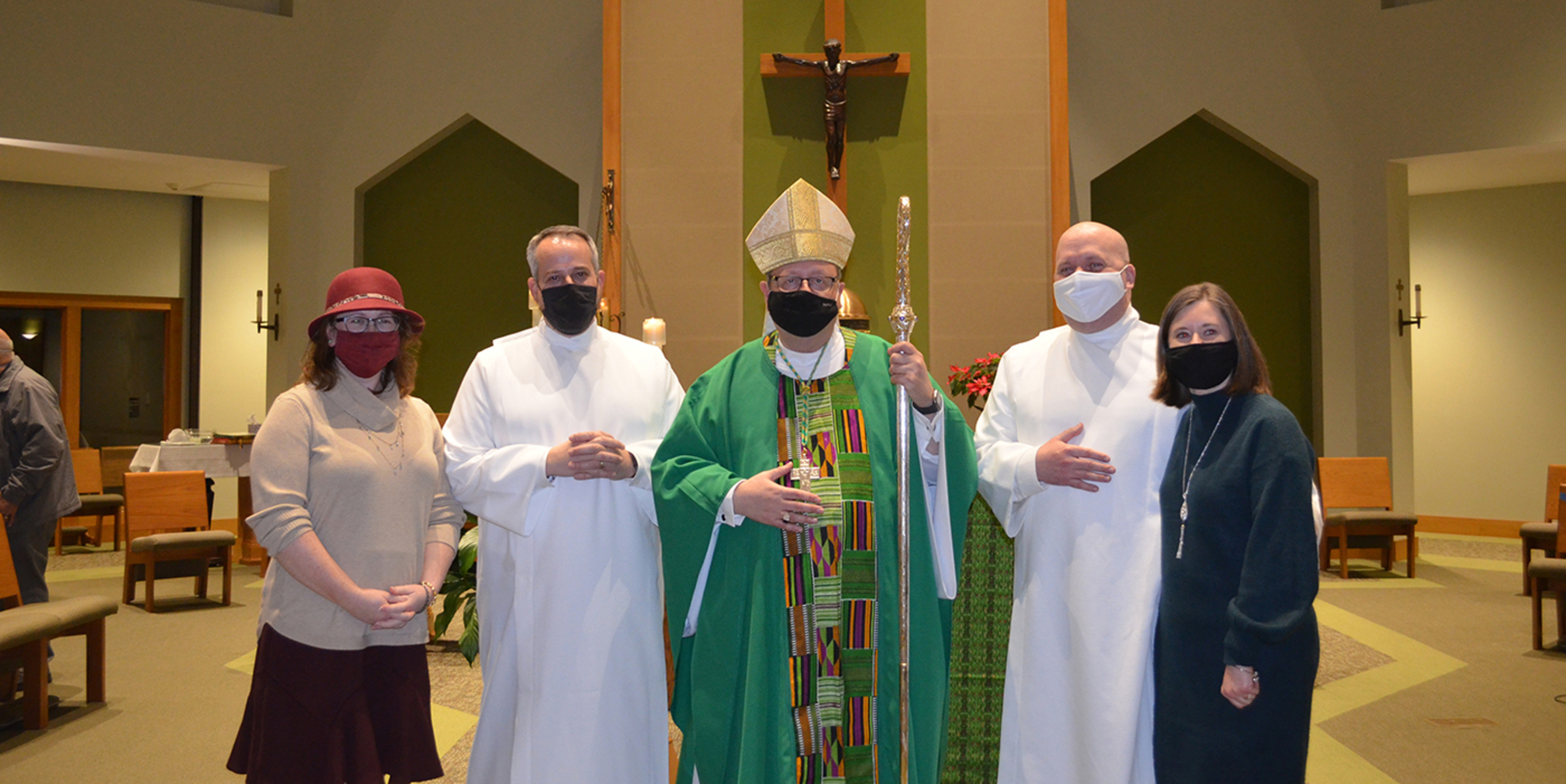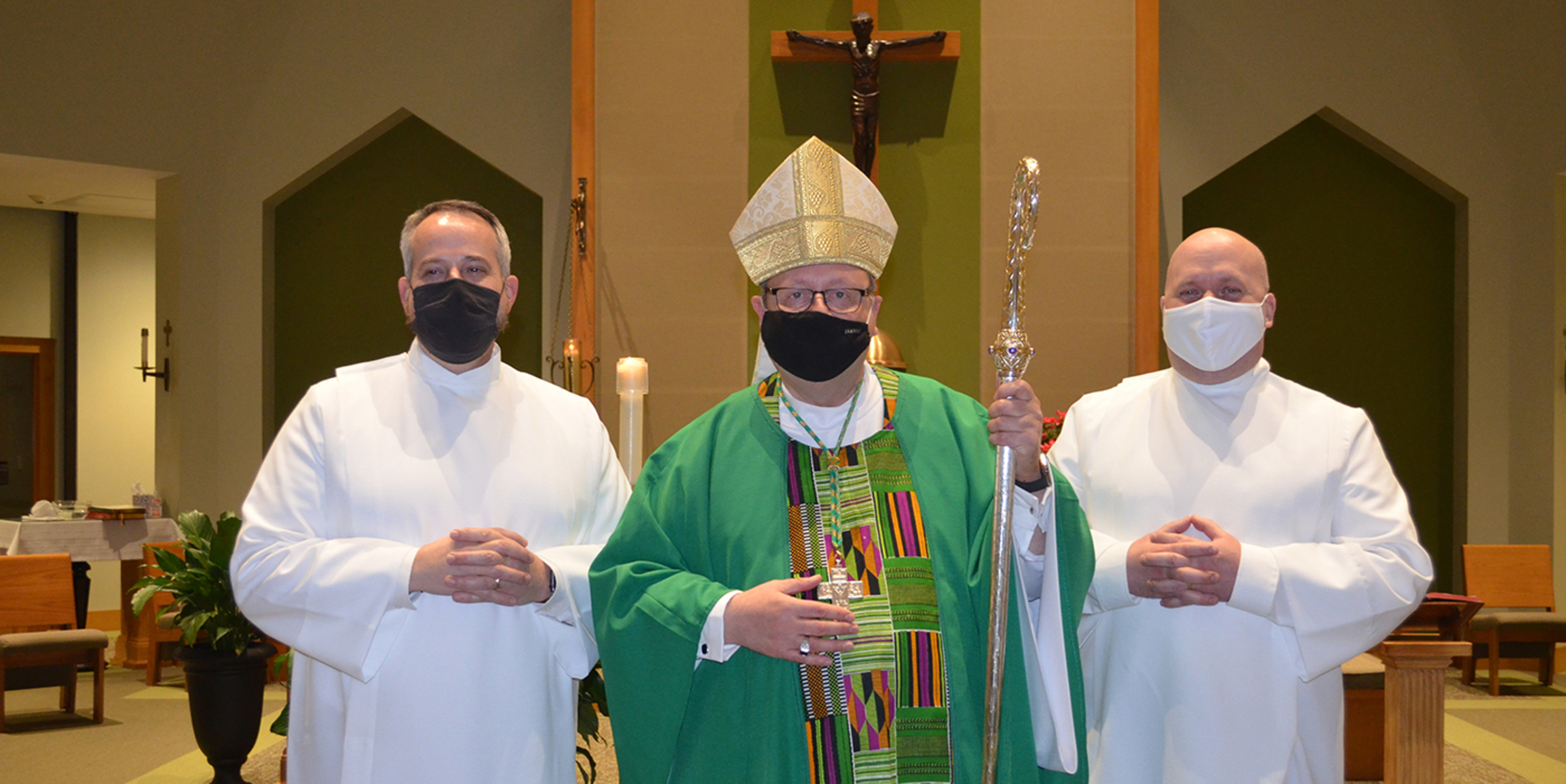 Father Bob Marva, OFM, pastor of St. Agnes + Our Lady of Fatima Parish in Cleveland, welcomed Bishop Edward Malesic to the parish on Feb. 6. The bishop celebrated the vigil Mass and instituted two candidates for the permanent diaconate -- Scott Cerrito of Our Lady of Grace Parish in Hinckley and Michael Costantini of St. Barnabas Parish, Northfield – in the ministry of acolyte.