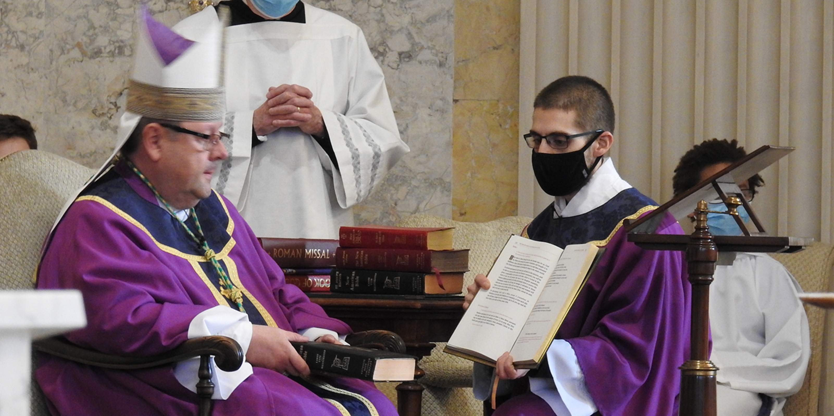 As lectors – ministers of the Word – the newly instituted will proclaim that word in the liturgical assembly, instruct children and adults in the faith and prepare them to receive the sacraments, the bishop told the men. He said they also will bring the message of salvation to those who have not yet received it. “Do the work of an evangelist,” he instructed them. “We support you, we pray for you, we long for what you are willing to tell us. We desire to see God speak through you.”