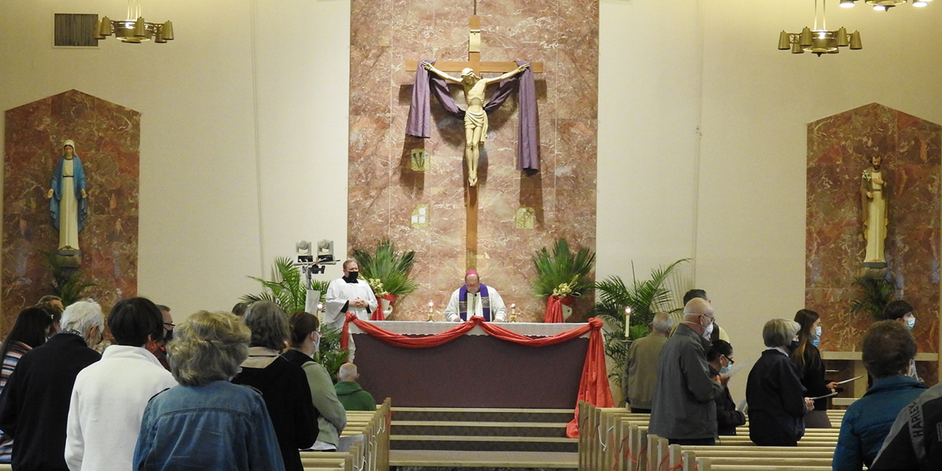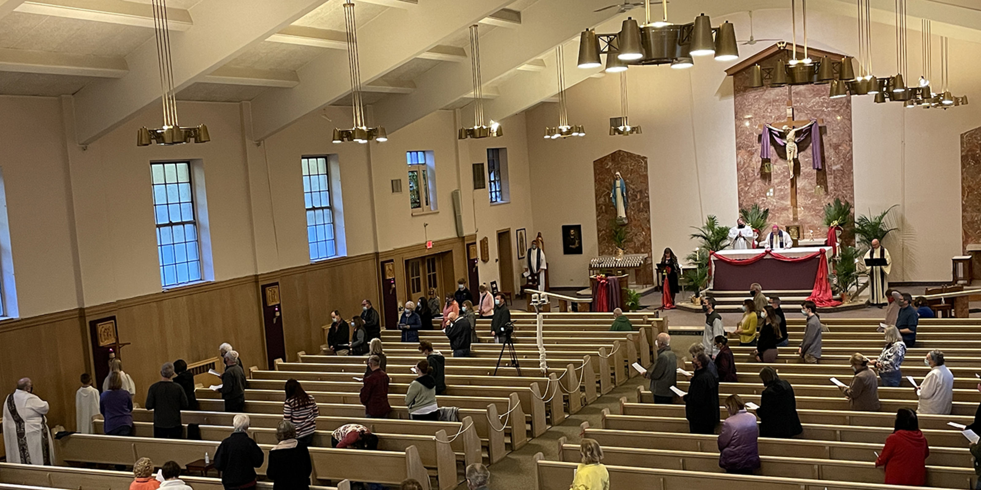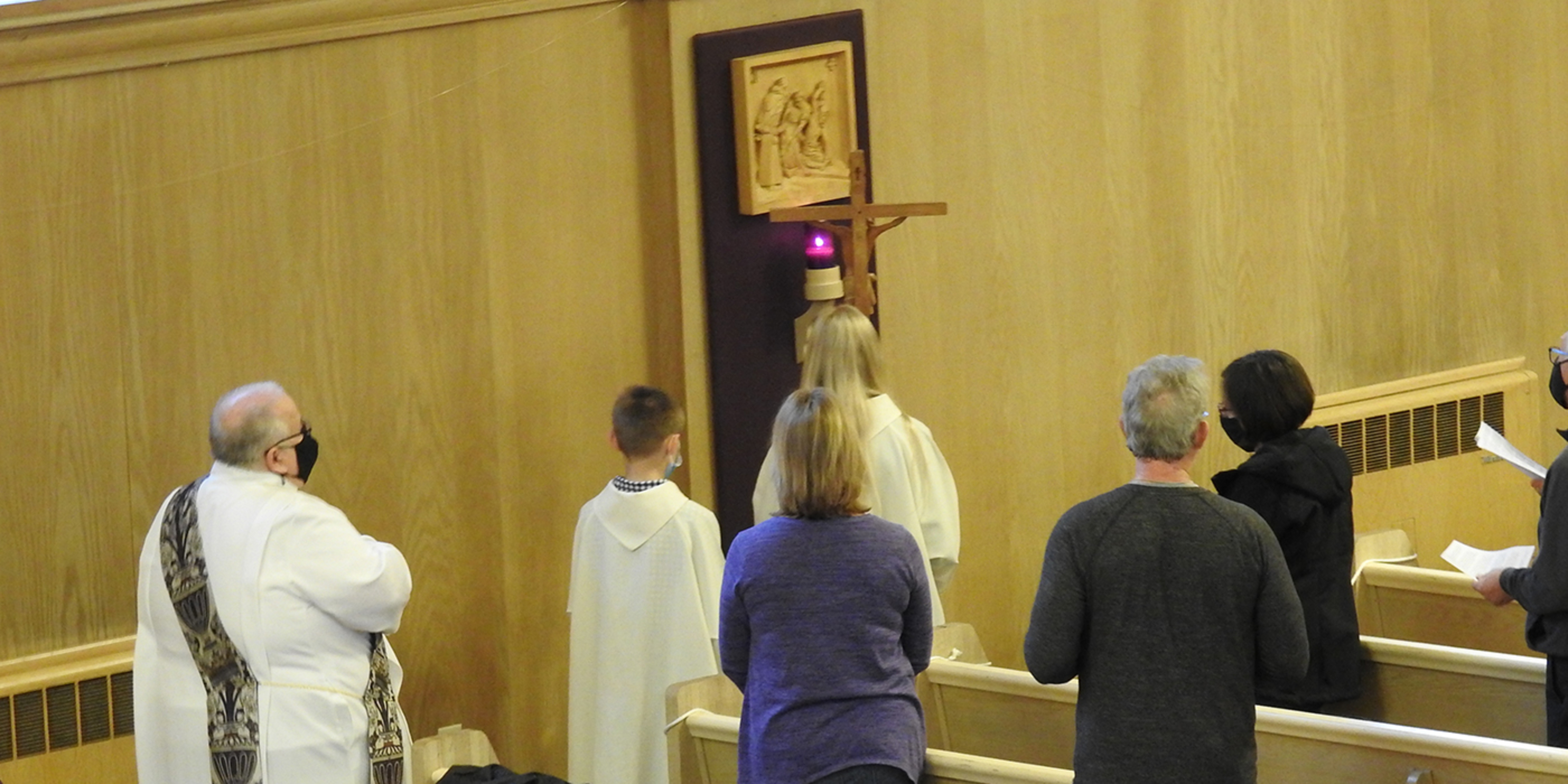 The deacon and two servers walked the perimeter of the church, stopping at each of the 14 stations, while the bishop remained at the altar with Father Ausperk and a narrator at podiums as they prayed and read portions of the stations.
