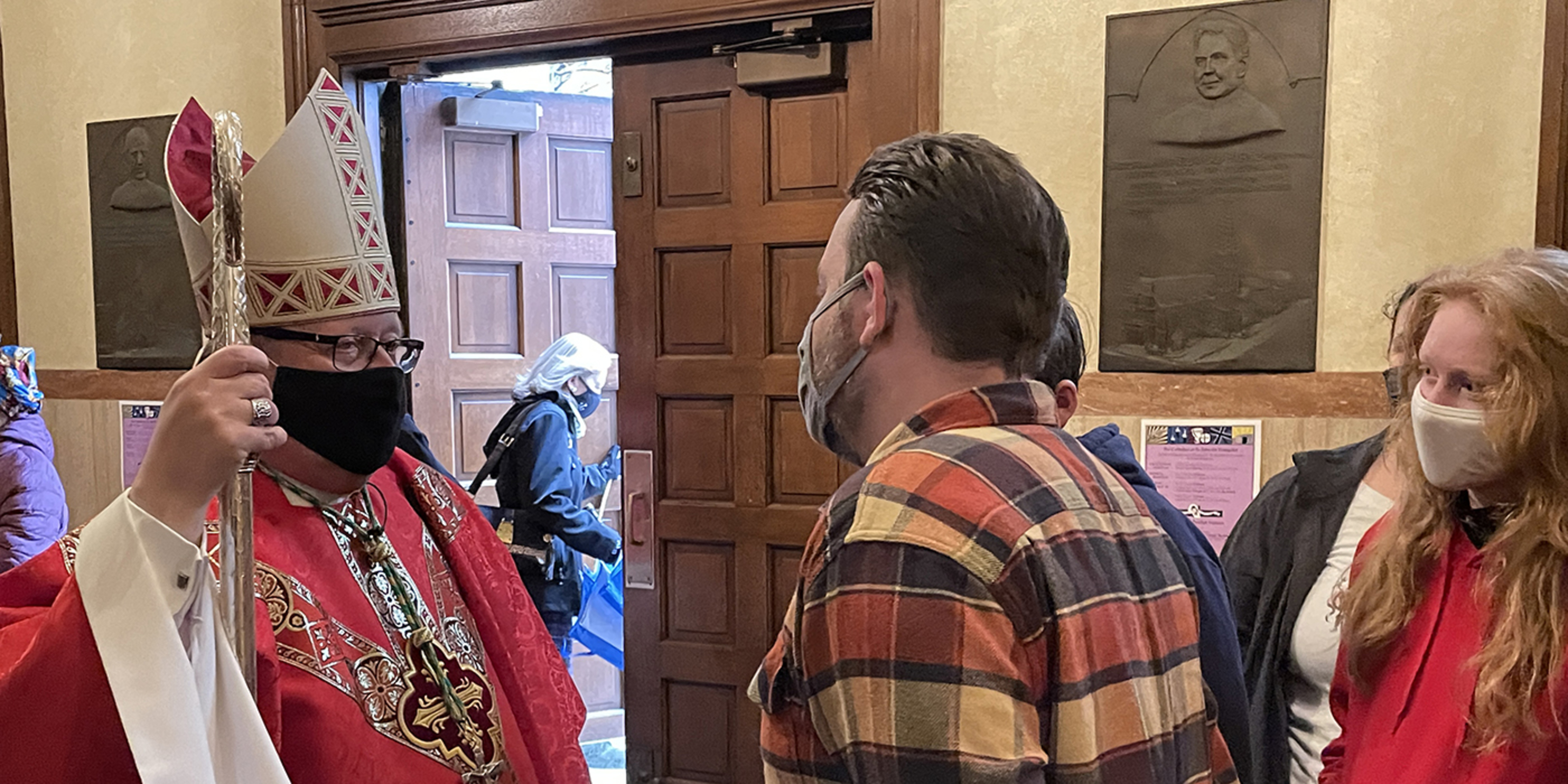 After Mass, the bishop mingled, chatted and took photos with about two dozen members of the Parents of Priests who gathered in the cathedral rectory parlor. He told the group he’s looking forward to the day when they can gather safely in a larger group – and without masks – so they can get better acquainted.