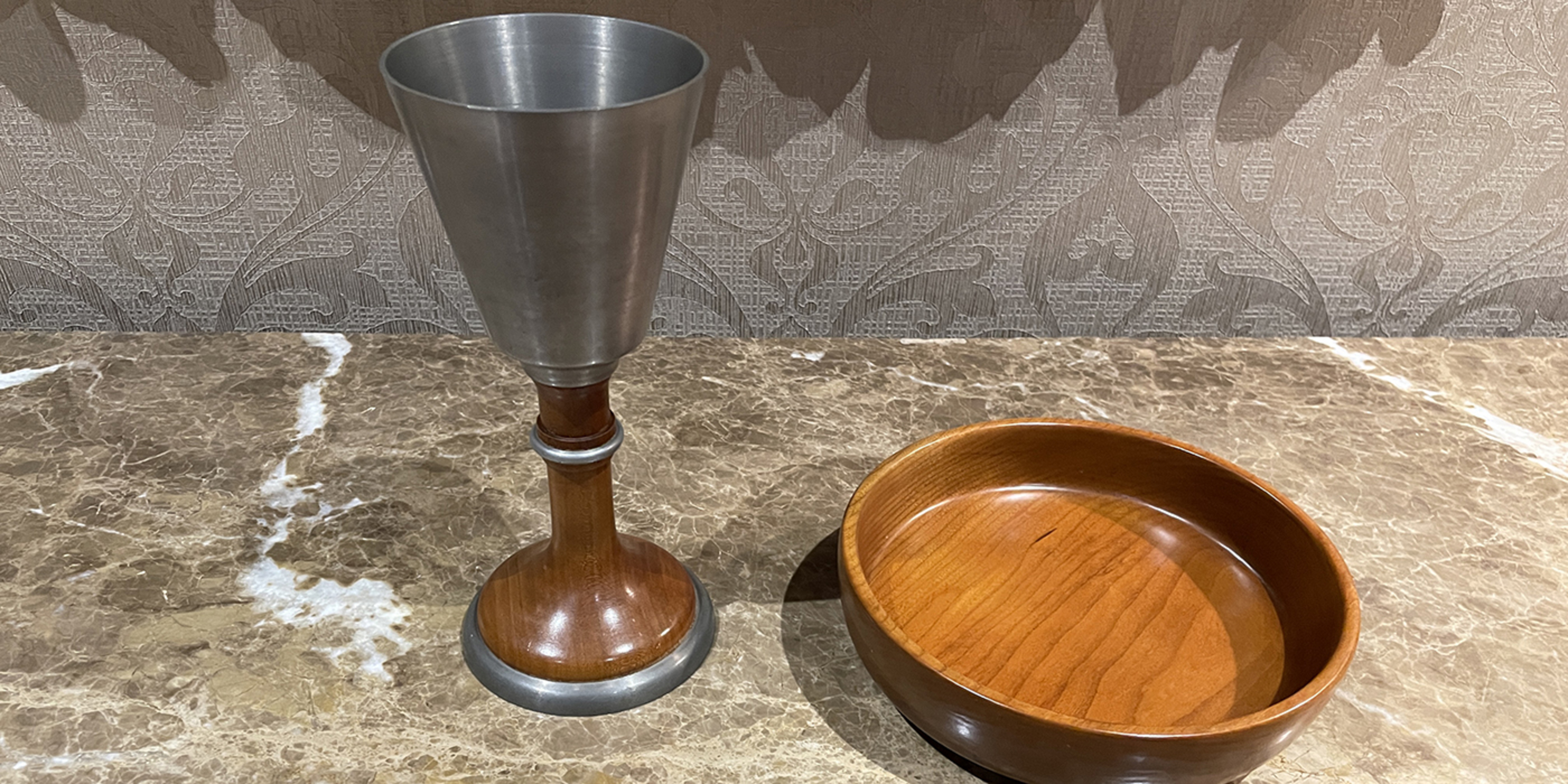 The bishop knew his parents were going to purchase a gold chalice and paten for him as an ordination gift. “That’s the chalice I usually use here at the cathedral,” he explained, but he thought he might like to have another chalice and paten – possibly for use during Lent. He asked Pete if he would be willing to create a chalice from pewter and wood and a paten from cherry wood. He said he wanted to think about it, but Pete called the bishop back to the house the next day and agreed to make the items on one condition: that he remember Pete and Helen’s two sons whenever he celebrated Mass with the chalice and paten.