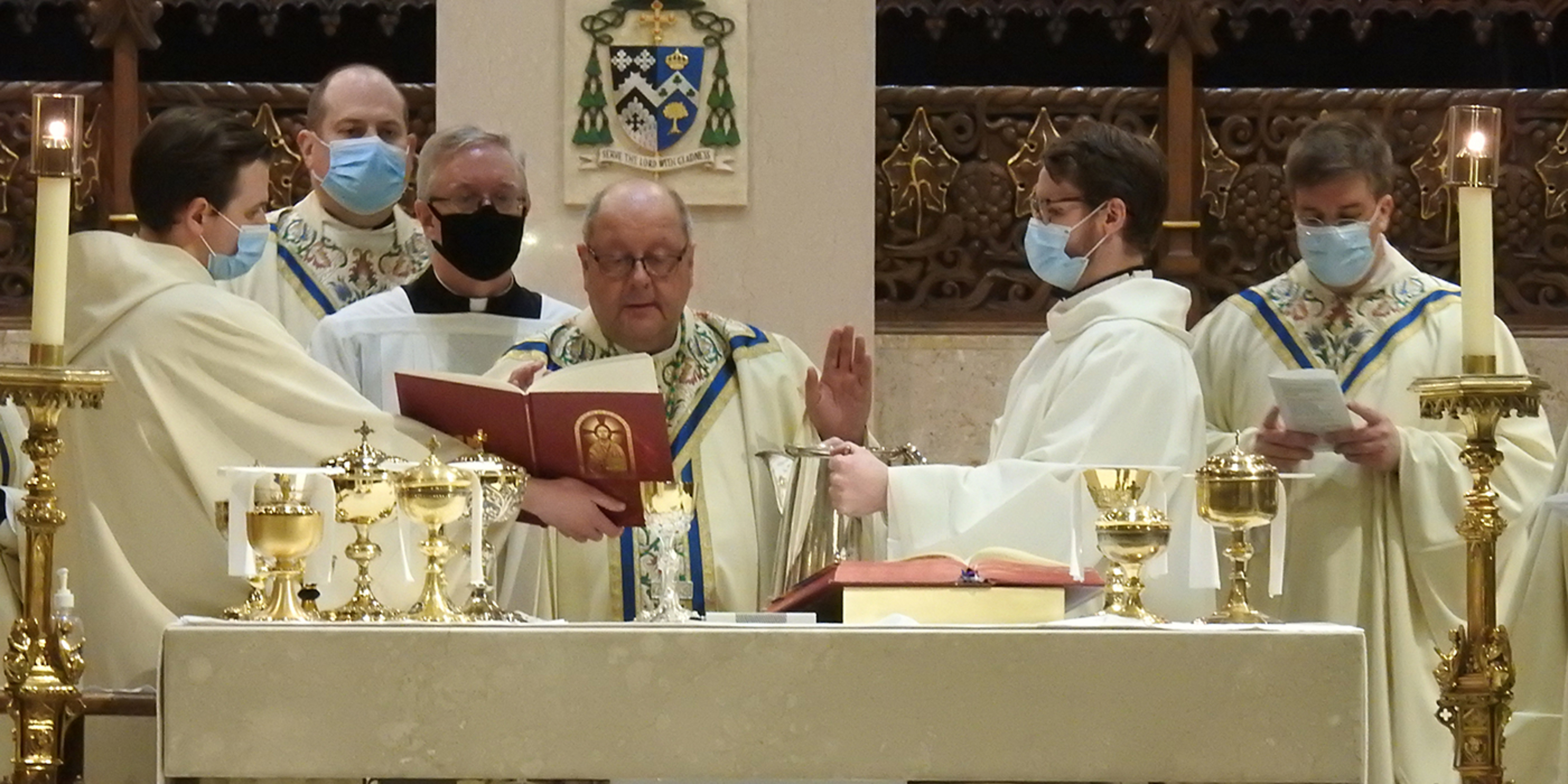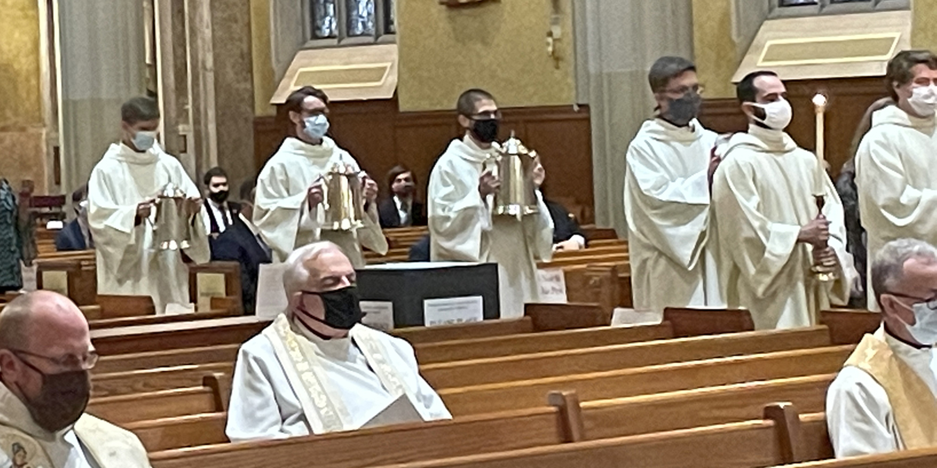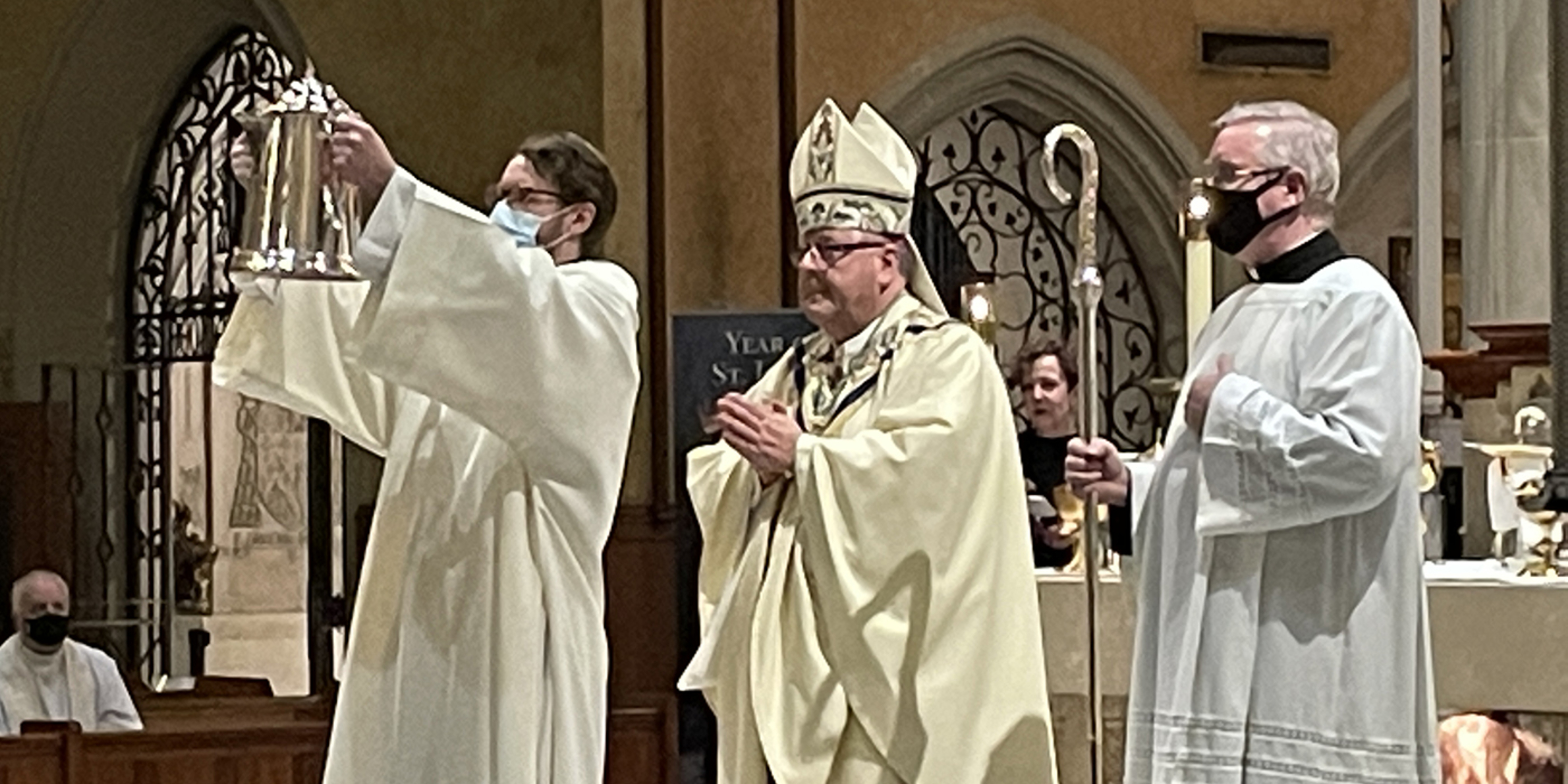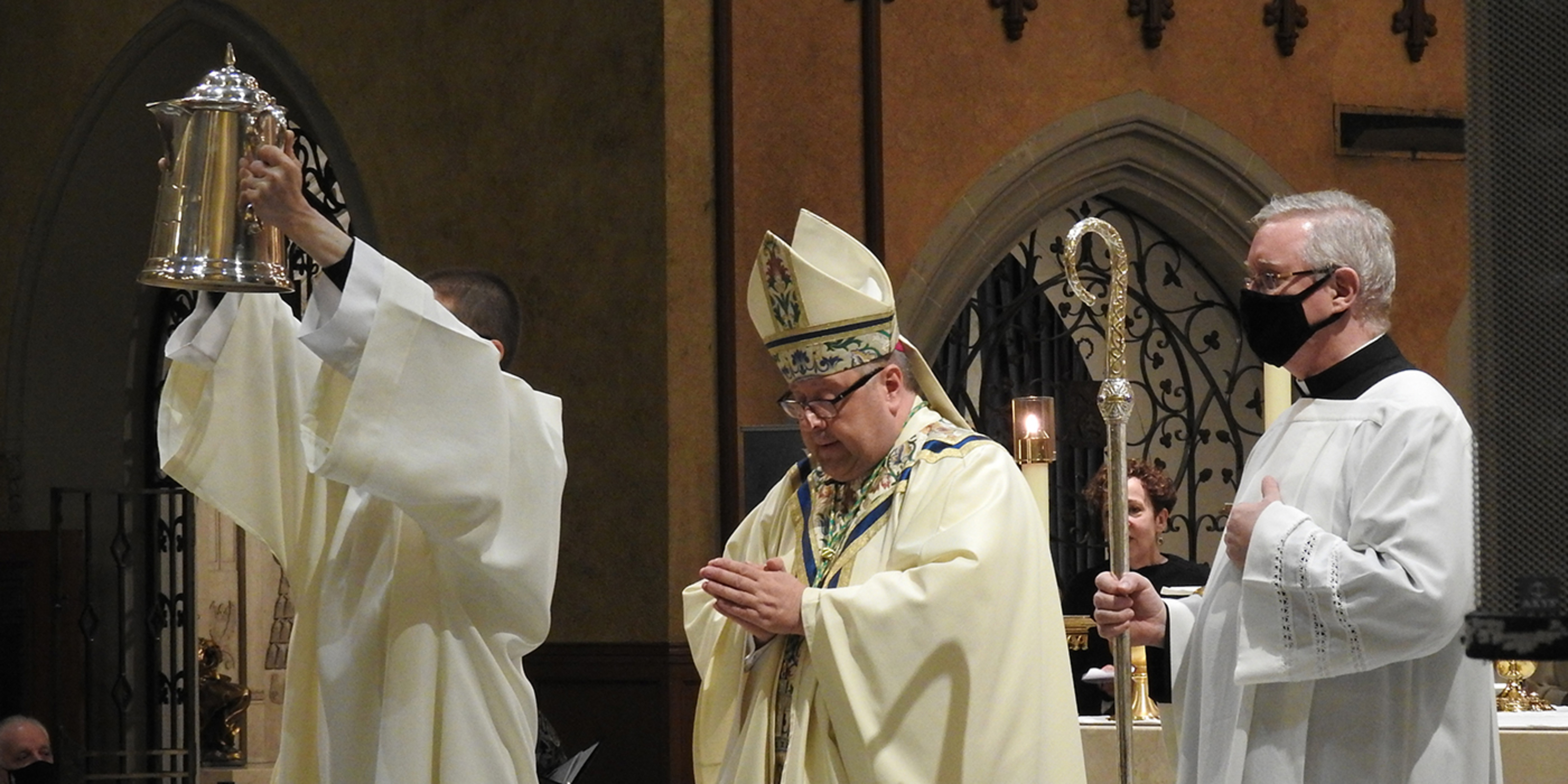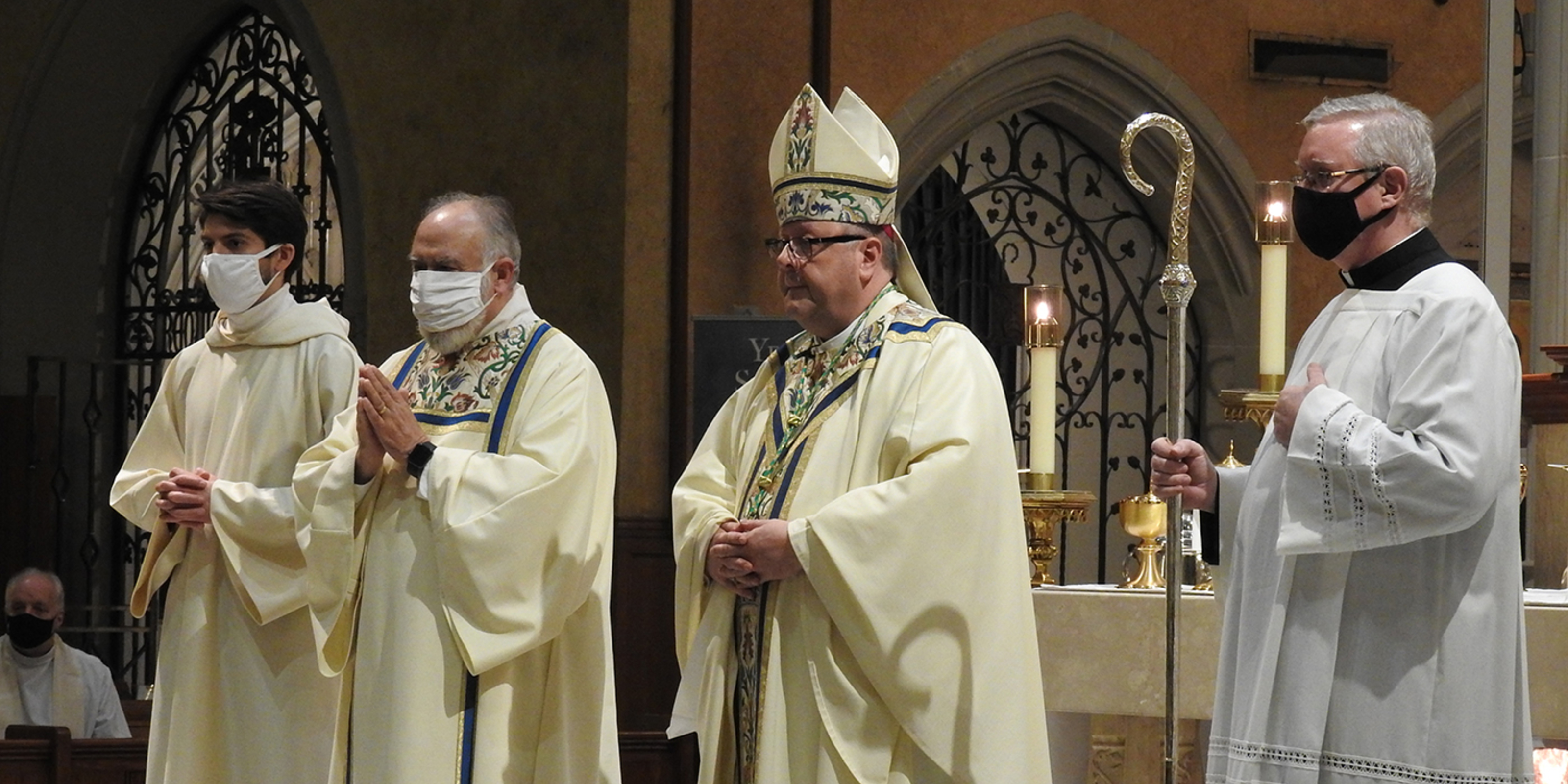 Acknowledging the limited attendance, Bishop Malesic said he knows that the cathedral “is filled to the brim by the blessing of the Holy Spirit. And at this Mass, we can know that this sacred space is filled with Mary, the mother of God, and all the saints who intercede for us, choirs of angels who adore God with us, Jesus who never leaves us as orphans and many others who are sitting around their computer screens praying along with us right now, including so many of our priests.”