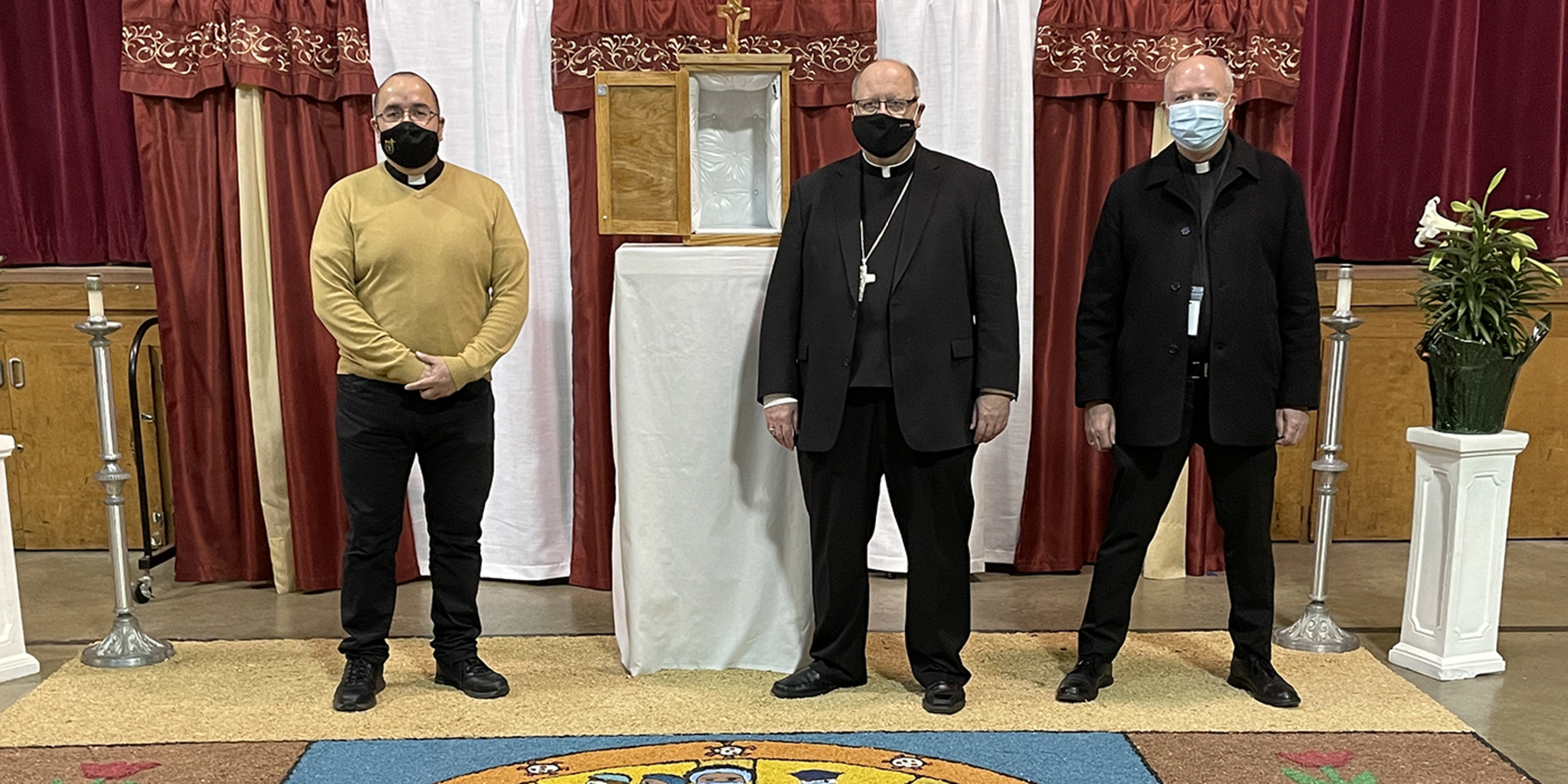 Bishop Edward Malesic and Father Dan Schlegel, vicar for clergy and religious, stopped by on Holy Thursday to admire the project. Parishioners and Father Francisco “Paco” Garnica, CSJ, Sagrada Familia administrator, explained the significance and creation of the carpets to them.