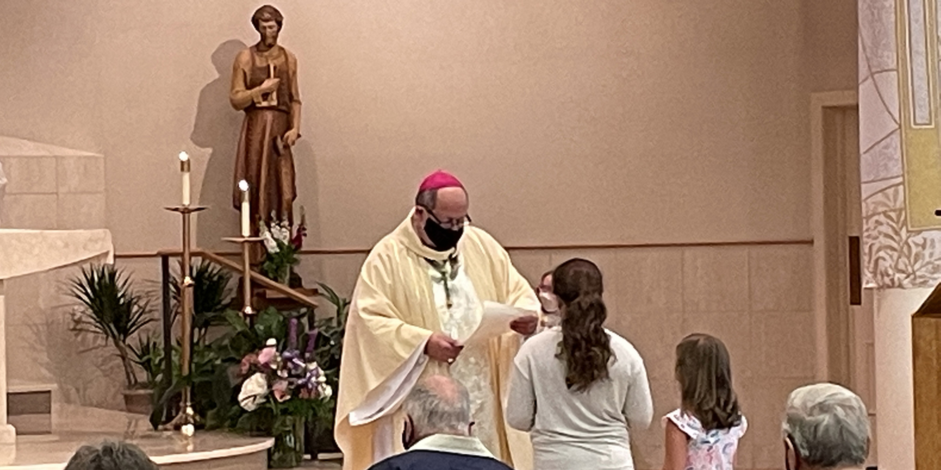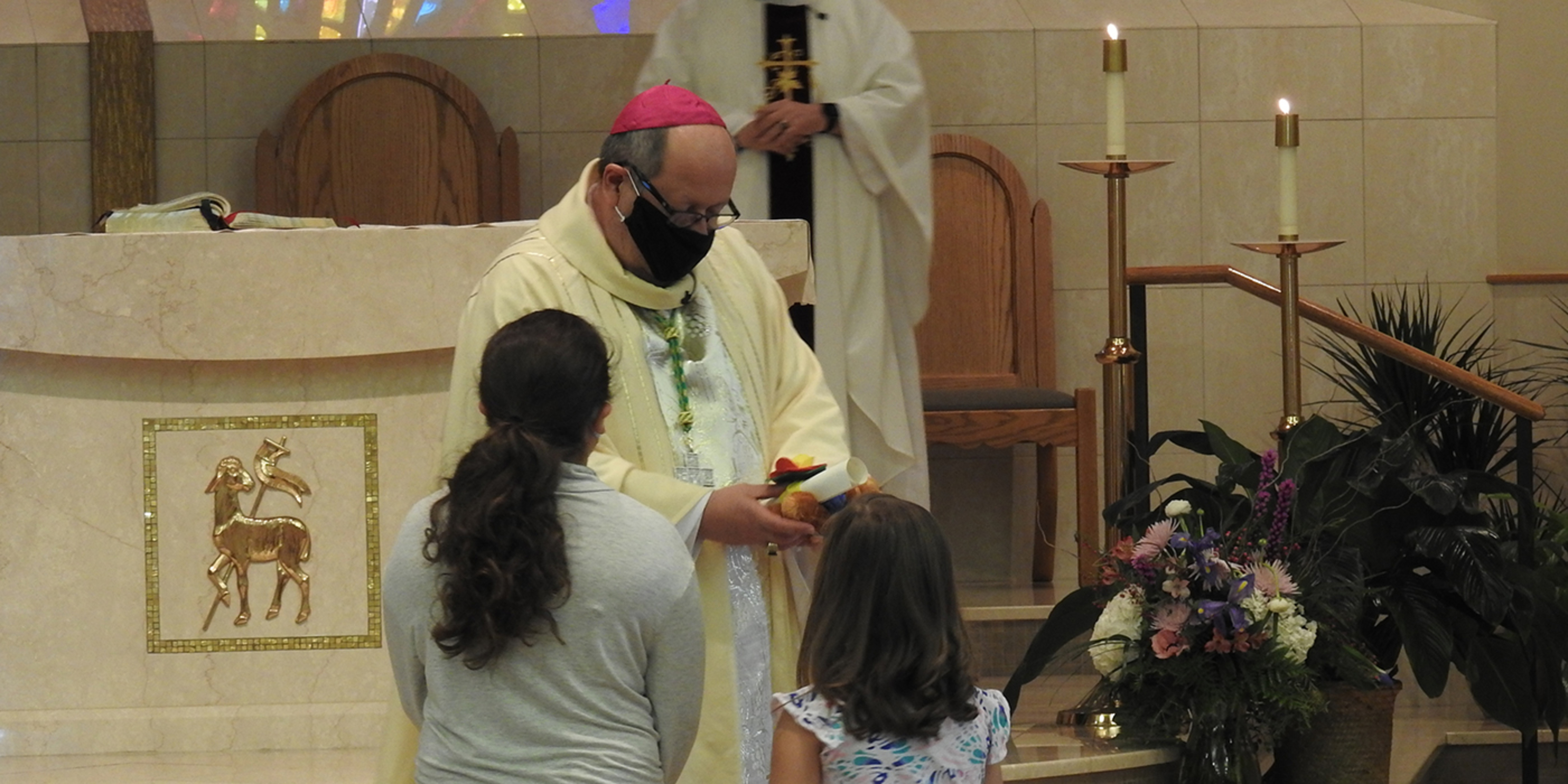 After Mass, two St. Michael School students presented the bishop with a spiritual bouquet on behalf of the parish and school communities. He also received a book written by a parishioner.