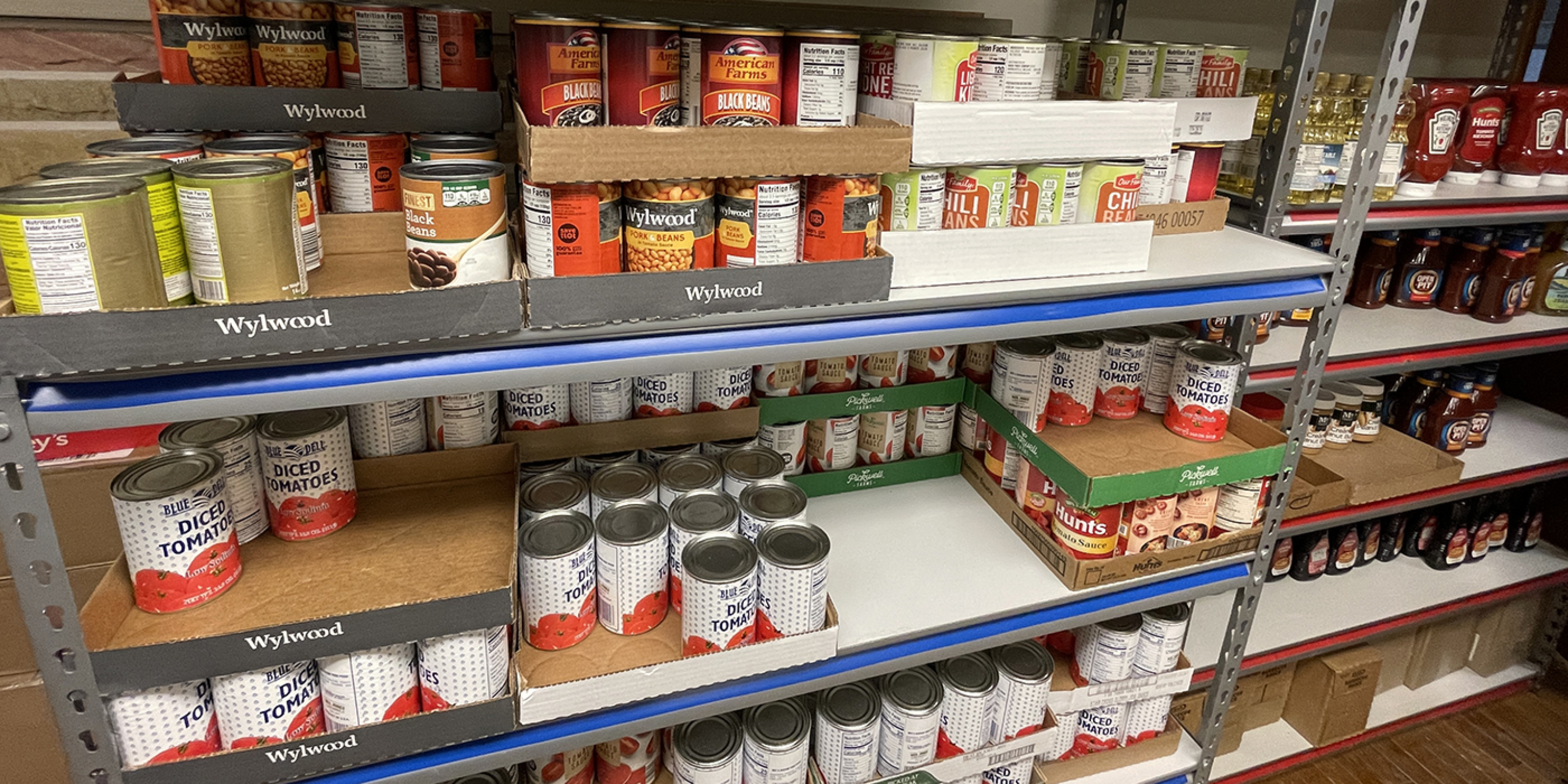 One large room was stacked with the pre-filled boxes of non-perishable food, received through a collaboration with Second Harvest Food Bank. Parishioners, St. Jude School students and others also donate non-perishable food, personal hygiene products and cleaning supplies that pantry volunteers organize and neatly stack on shelves. Meat is stored in several large freezers