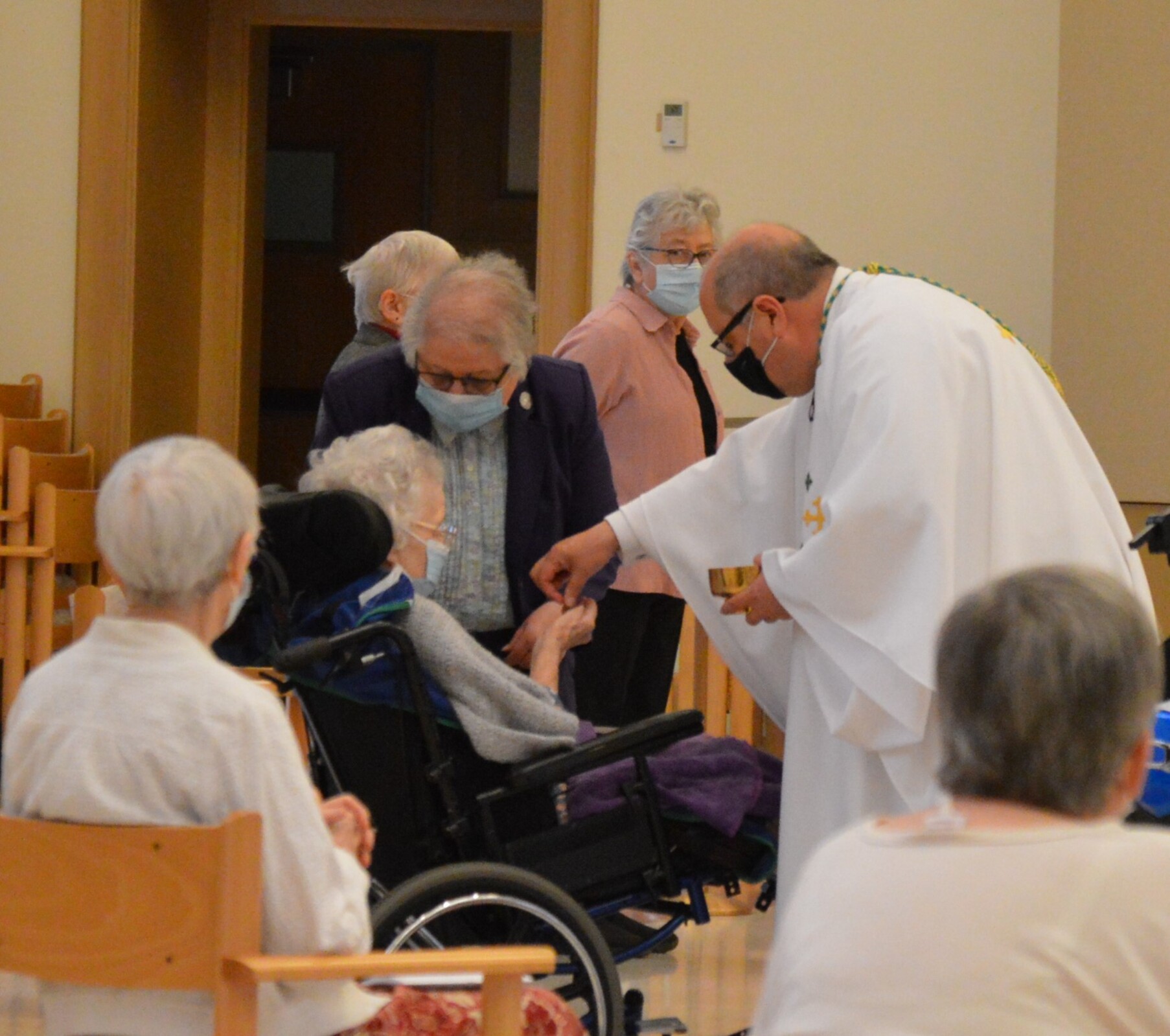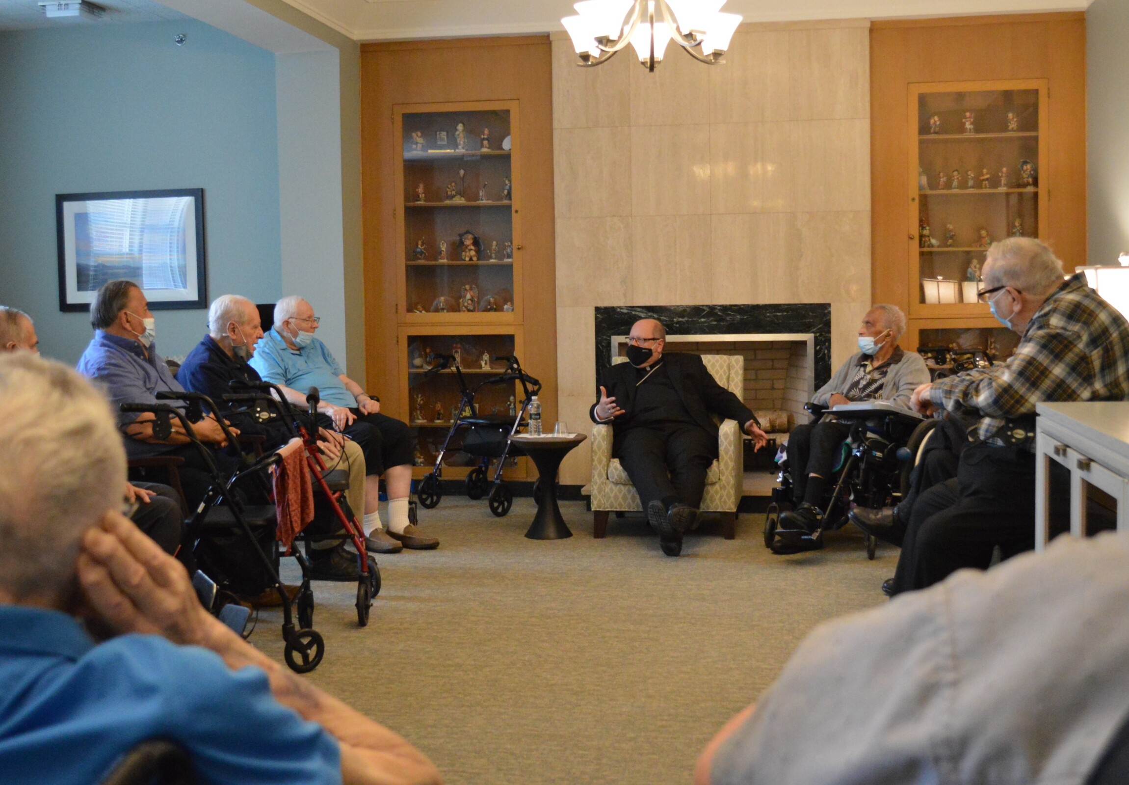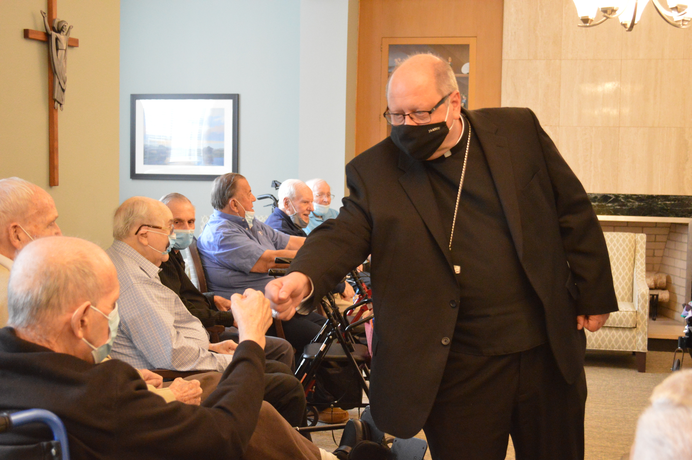 During a recent visit to Regina Health Center and Mount Augustine, which share a campus in Richfield, Bishop Edward Malesic spent time visiting with retired diocesan priests in residence at Regina, celebrating Mass for the Sisters of Charity of St. Augustine and observing their elections for congregational leadership.
