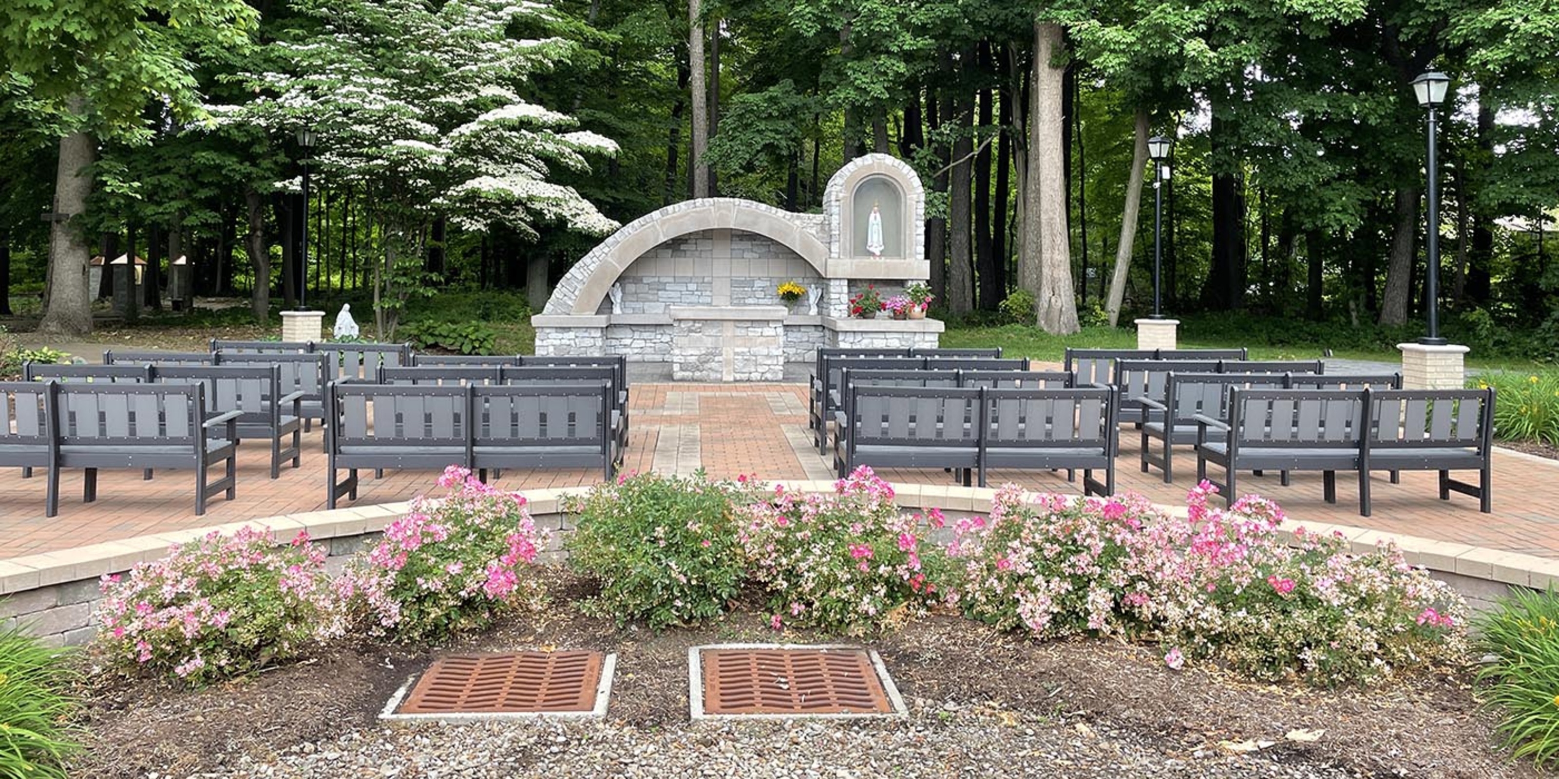 The stone grotto, which features an altar and a statue of the Blessed Mother, was dedicated about six years ago by Auxiliary Bishop emeritus Roger Gries. There is a walking path behind the grotto with Stations of the Cross and a stone replica of the Ten Commandments.