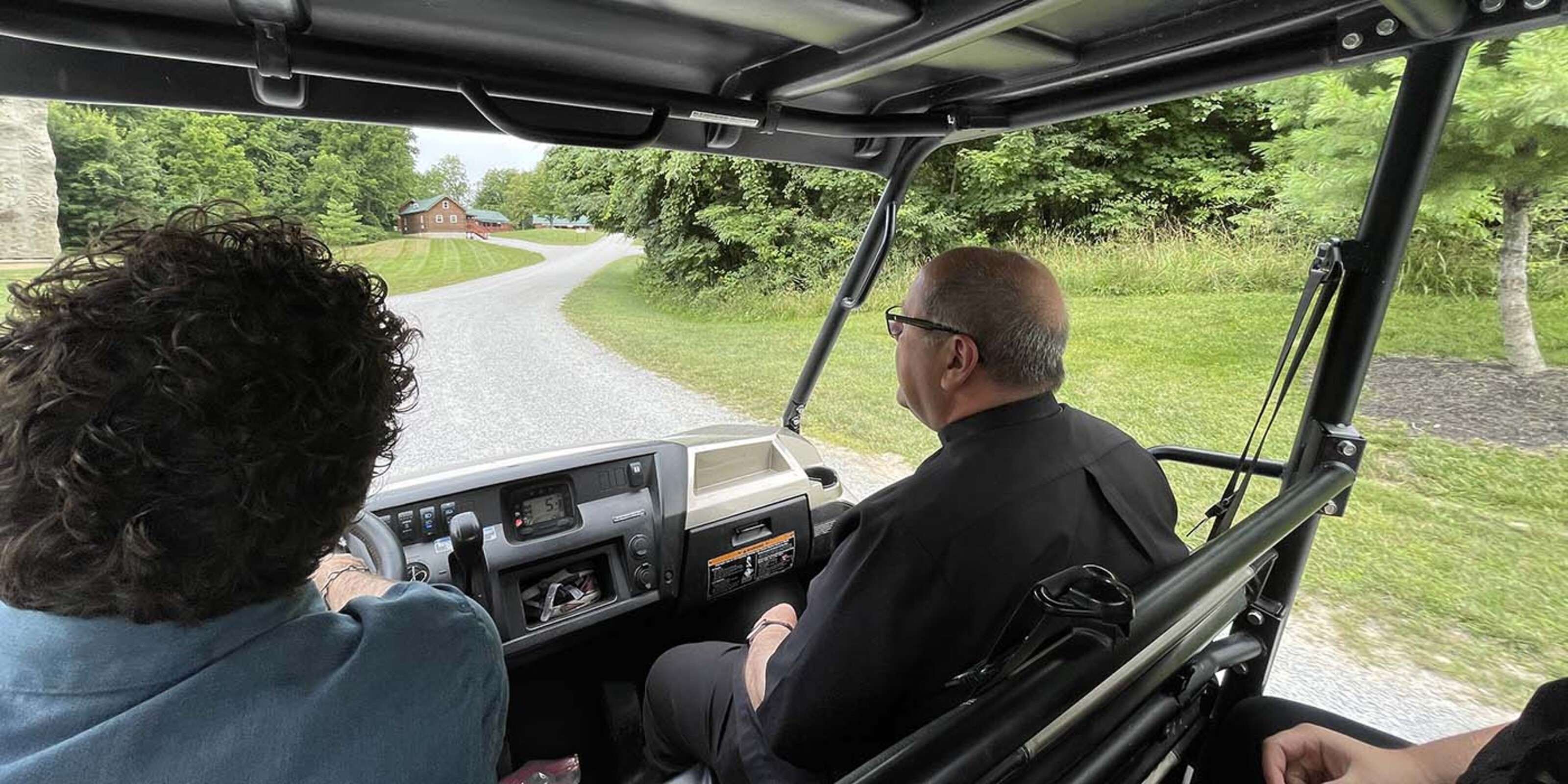 Dan DeMatte, co-founder and executive director of Damascus, gave the bishop a private tour of the nearly 500-acre facility, located about 40 minutes northeast of Columbus and about two hours from each major city in the state. He was accompanied by Deacon Ian Kelly, a seminarian at Saint Mary Seminary in Cleveland, who is on track for priestly ordination next spring. Deacon Kelly spent several summers as a missionary – akin to a counselor – at the camp. De Matte whisked them around the property in a small vehicle, showing the bishop some of the camp’s adventure features, including a giant swing, high ropes, paintball, archery, the lake and a huge, five-story climbing wall that was donated to the camp, which was founded in 2001 as a parish initiative to help young people live the adventure of their Catholic faith.