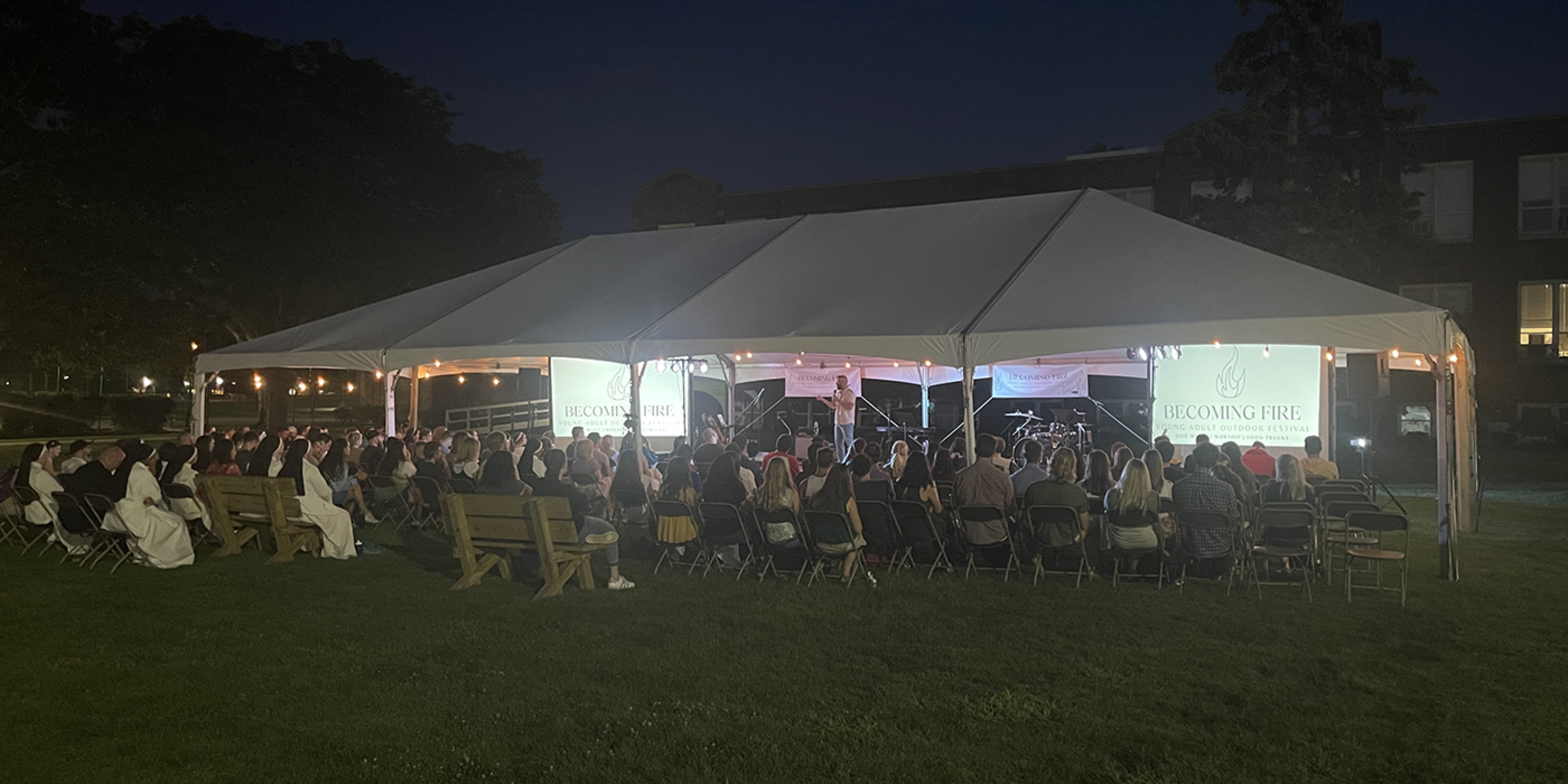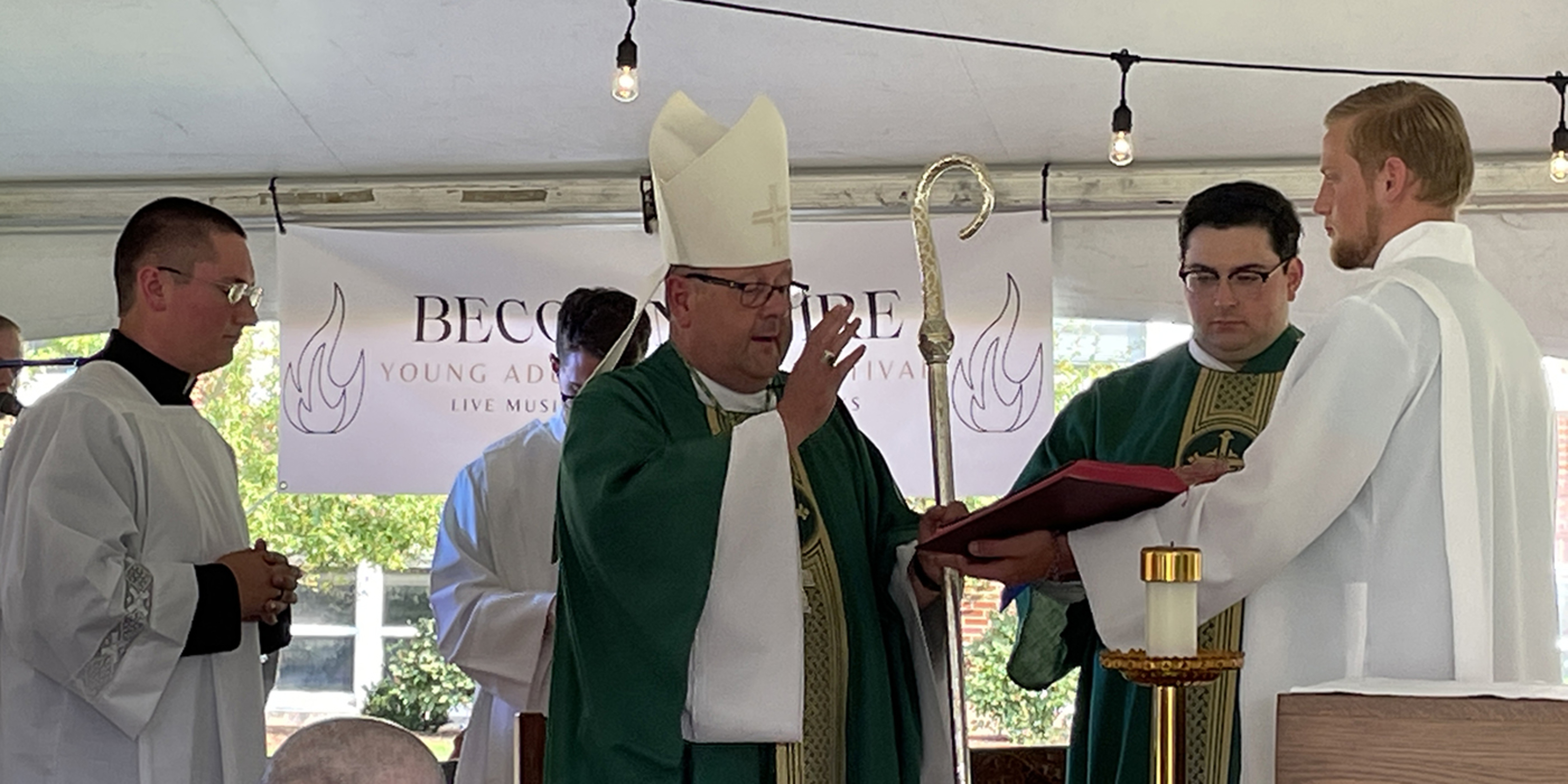 An outdoor concert with music by Mercy Divine, Mass celebrated by Bishop Edward Malesic, a keynote speaker, Adoration, opportunities for confession and spiritual direction, games, food, fun and fellowship. The first “Becoming Fire” event for young adults – 18 and older – had it all.