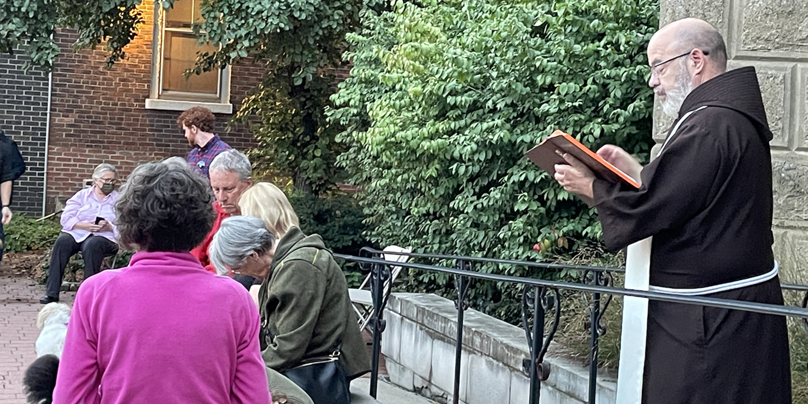 Father Ference used sidewalk chalk to draw signs guiding participants to the church courtyard where the blessing took place on a mild, early fall evening. Father Bernier read a Scripture passage about how God created living creatures of every kind and said they would be called by the names Adam gave them.
